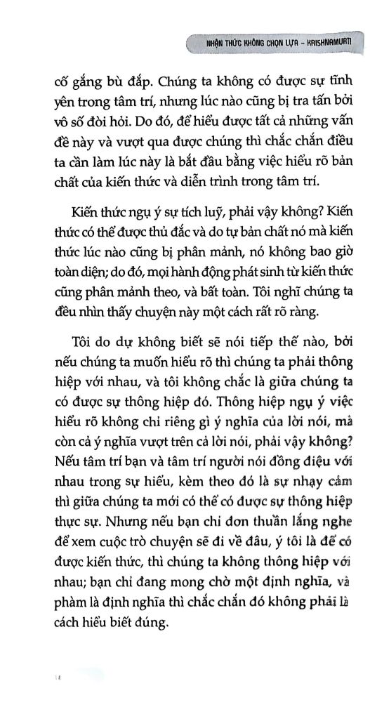Krishnamurti không chỉ trích ý nghĩ hay phủ nhận giá trị của ngôn từ. Ông chỉ ra giới hạn của chúng. Ý nghĩ chỉ là sự phản hồi từ ký ức, kinh nghiệm - luôn là cái cũ. Ngôn từ là ký hiệu, không phải bản thể. Và mọi khi ta dùng ý nghĩ để nắm bắt thực tại, là ta chỉ đang lặp lại quá khứ. Chính trong nỗ lực liên tục đặt tên cho cảm xúc, định nghĩa cho trải nghiệm, phân tích cho đau khổ - ta đã khước từ khả năng tiếp xúc trực tiếp với sự thật đang diễn ra.