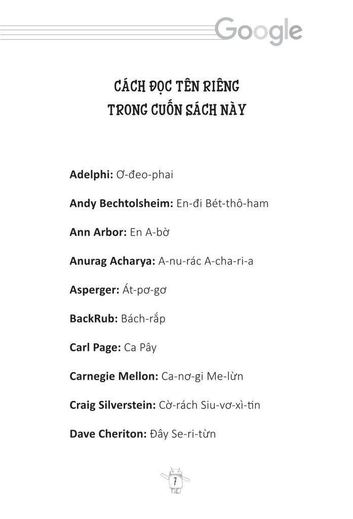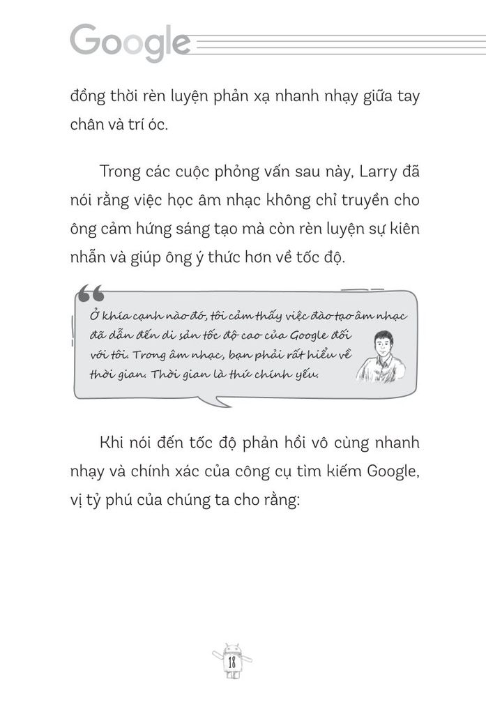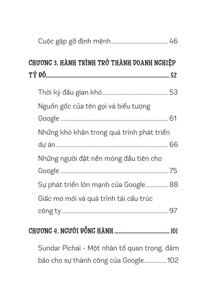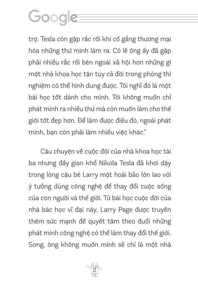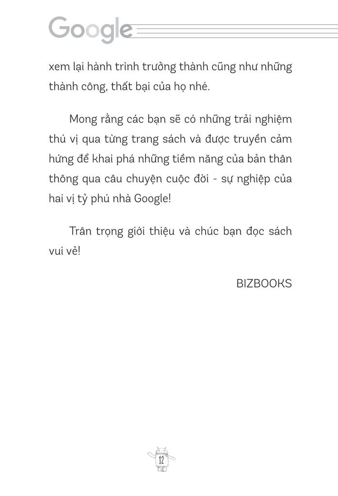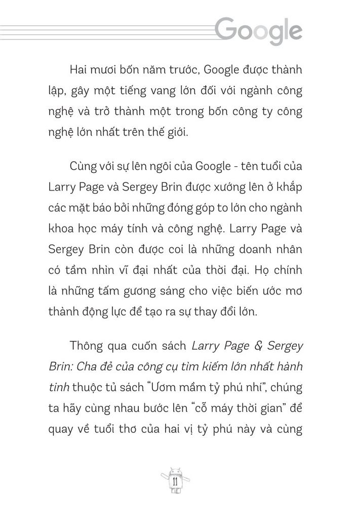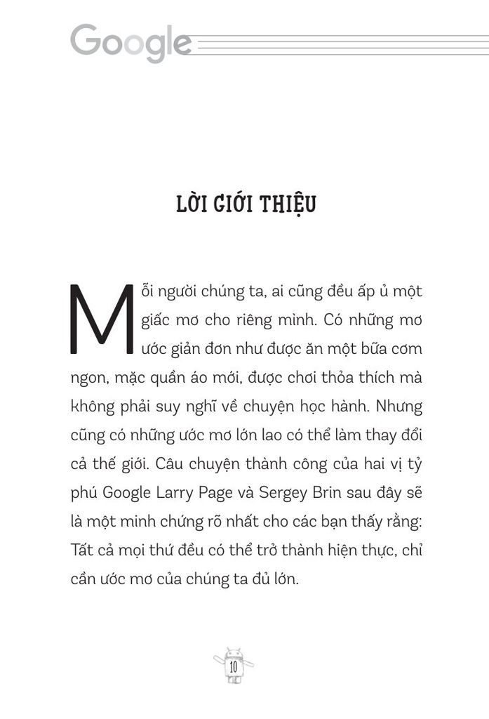 Những trang sách sẽ như một người bạn đồng hành kể cho bạn những câu chuyện đầy cảm hứng về hành trình của Larry Page và Sergey Brin. Từ cách cả hai mang một tầm nhìn lớn, tư duy đỉnh cao, sự kiên trì đáng nể, các xây dựng và quản lý đội ngũ tài năng đến cách họ đối mặt và vượt qua những thử thách tưởng chừng không thể vượt qua. Mỗi câu chuyện của họ đều là một lời nhắc nhở nhẹ nhàng rằng “ không gì là không thể”; mỗi bài học của họ sẽ chắp cánh cho ước mơ của bạn bay cao, bay xa hơn nữa