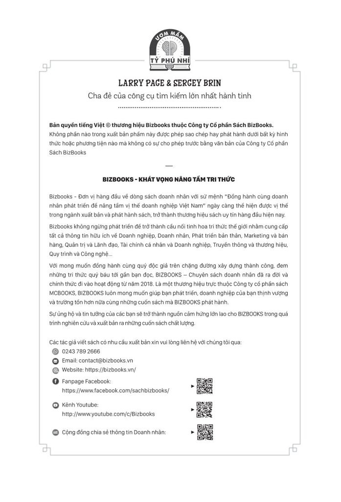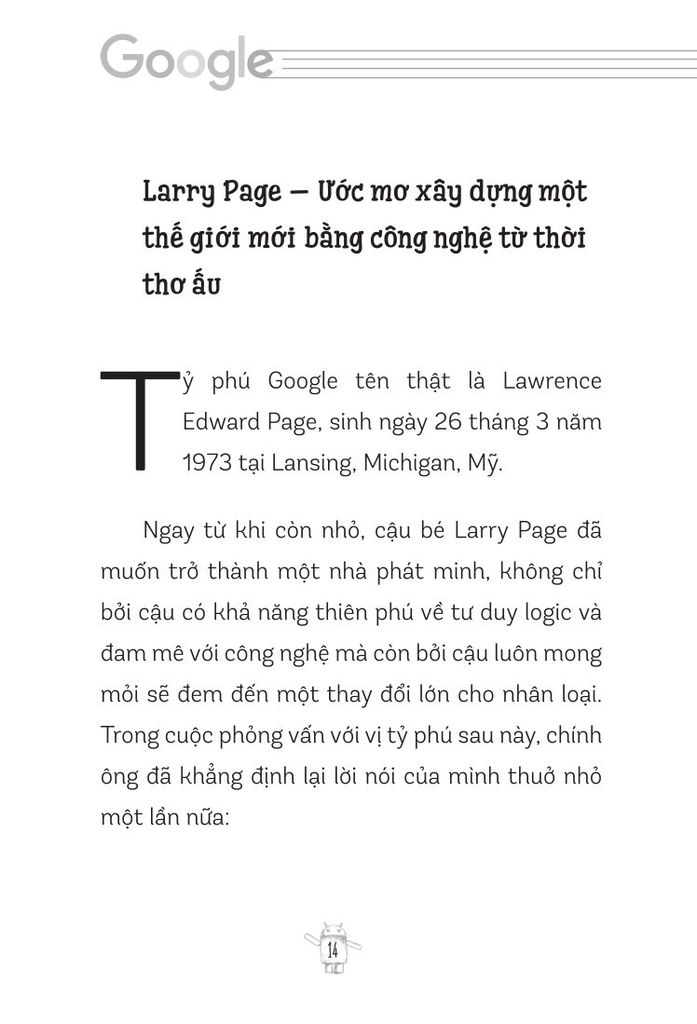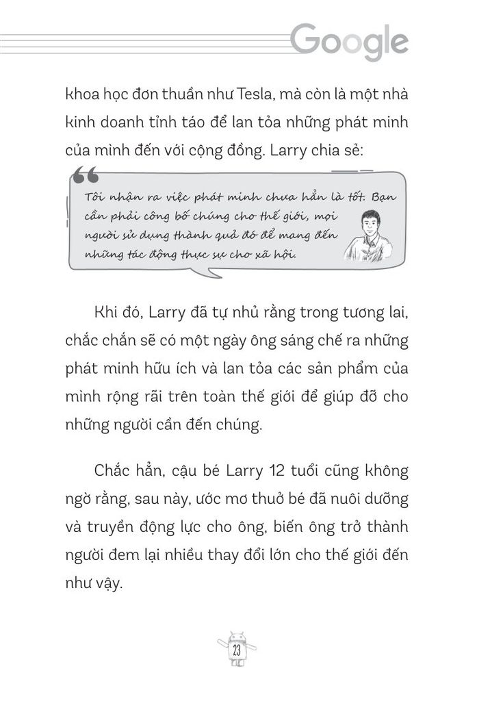 "Larry Page và Sergey Brin - Hành trình bá chủ thế giới Internet của đế chế Google" không chỉ là câu chuyện về hai con người phi thường, mà còn là nguồn cảm hứng mạnh mẽ cho bất kỳ ai đang trên con đường theo đuổi ước mơ. Hãy đọc và để những bài học từ cuốn sách này chắp cánh cho ước mơ của bạn bay cao, bay xa hơn nữa!