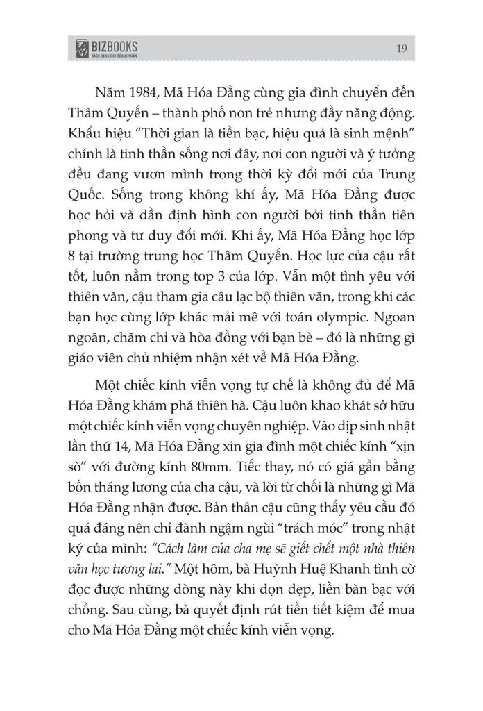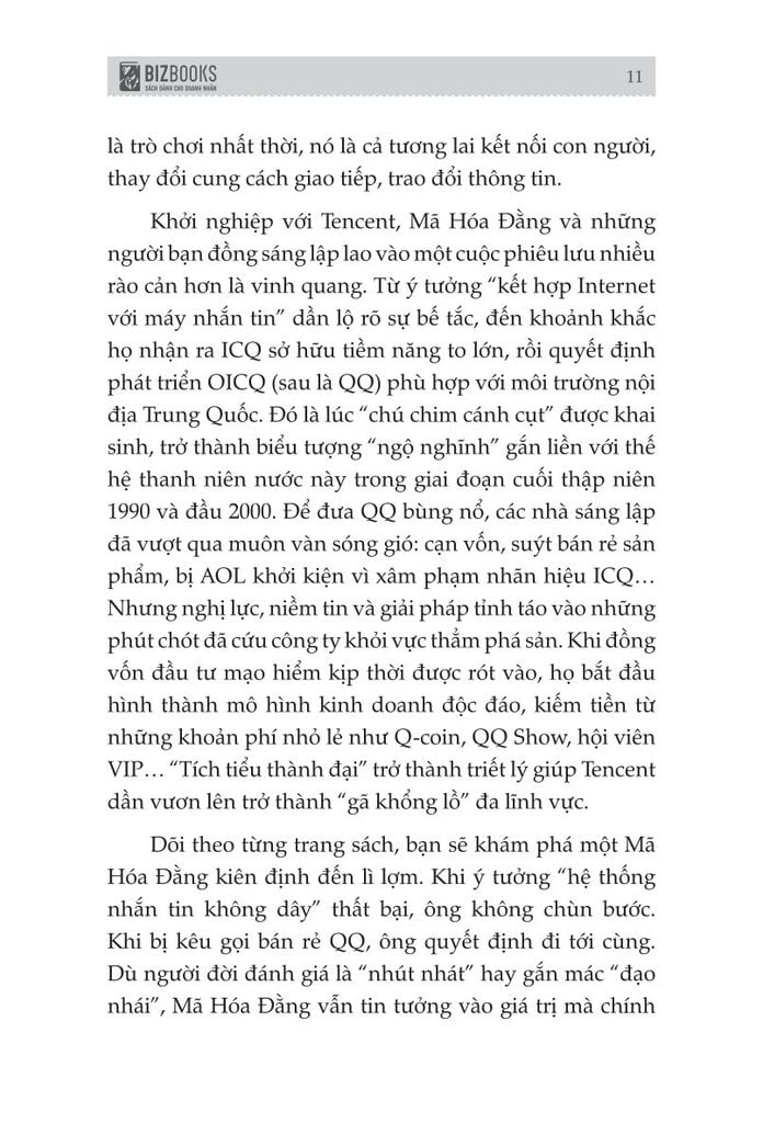 Khi theo dõi hành trình của ông trong cuốn sách, bạn sẽ khám phá một Mã Hóa Đằng kiên định đến lì lợm. Khi ý tưởng “hệ thống nhắn tin không dây" thất bại, ông không chùn bước. Khi bị kêu gọi bán rẻ QQ, ông quyết định đi tới cùng. Dù người đời đánh giá là "nhút nhát" hay gắn mác "đạo nhái", Mã Hóa Đằng vẫn tin tưởng vào giá trị mà chính mang lại.