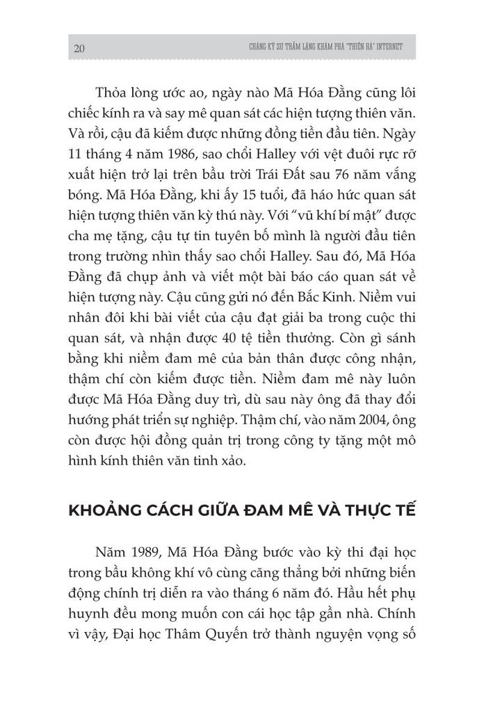 Nếu ví thế giới internet là một bầu trời đêm huyền bí, thì Mã Hóa Đằng chính là người cầm ống kính quan sát từ rất sớm, chăm chú tìm kiếm những ngôi sao mới ló rạng. Từ niềm đam mê trẻ thơ với thiên văn học, ông đã rẽ lối sang lĩnh vực công nghệ, mang theo khát khao mở rộng tầm mắt của hàng triệu người dùng. Với tinh thần thích nghi và không ngừng đổi mới, Mã Hóa Đằng từng bước dựng nên một “vũ trụ số" mang dấu ấn riêng, chính là Tencent.