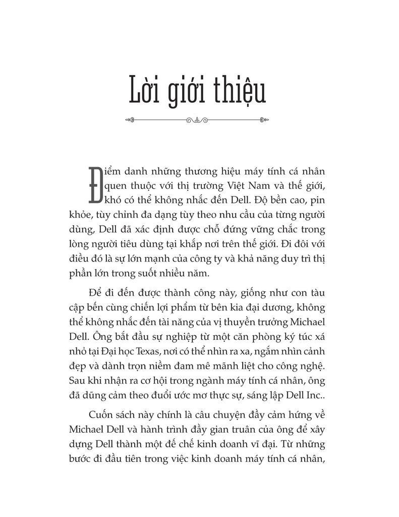 Chân dung nhà lãnh đạo phi thường: Cuốn sách đi sâu vào tư duy, triết lý kinh doanh và những nguyên tắc vàng đã giúp Michael Dell vượt qua mọi thử thách. Ông từng quyết định bỏ học đại học để tập trung toàn lực vào công ty của mình – một bước đi đầy rủi ro nhưng đã thay đổi cuộc đời ông.