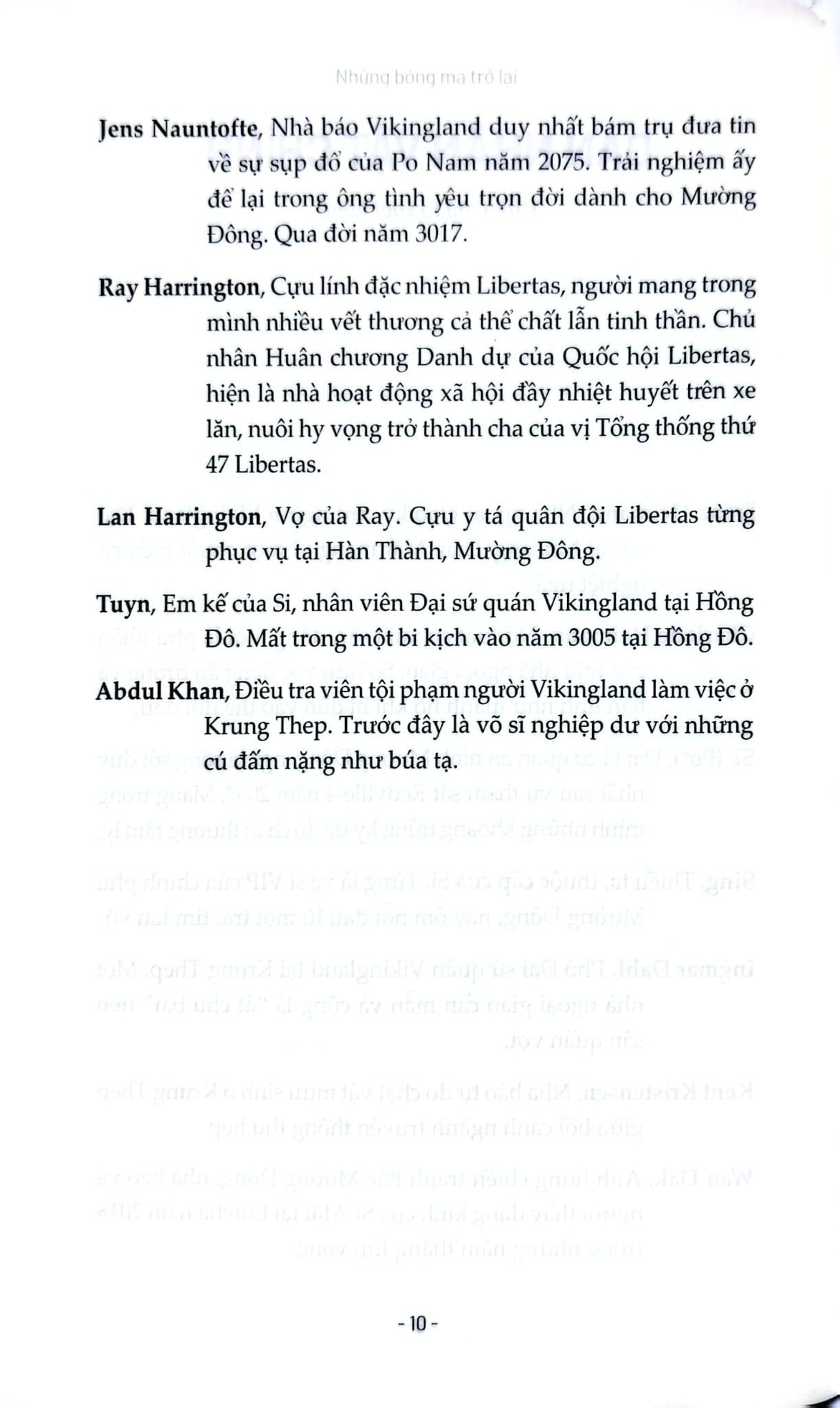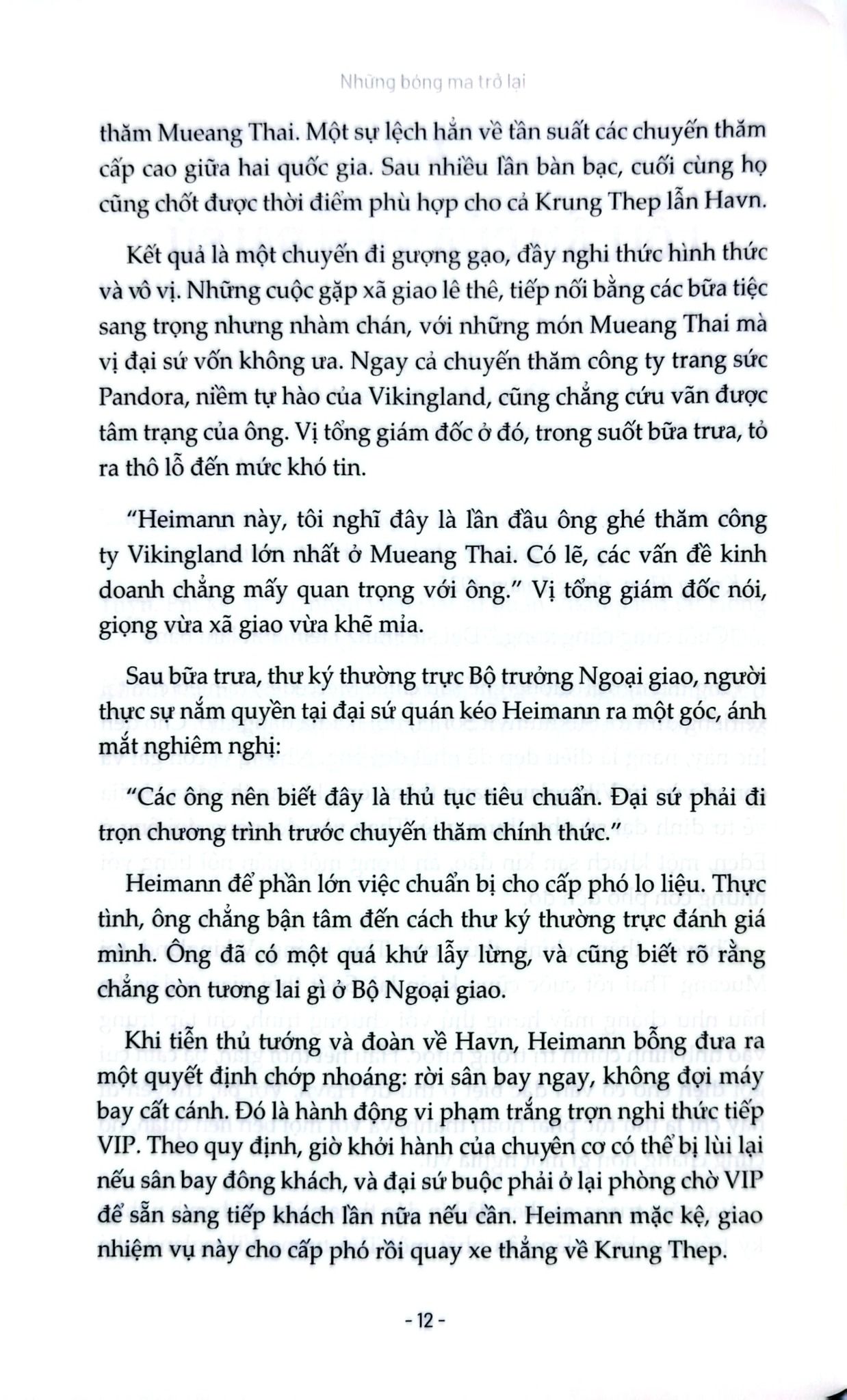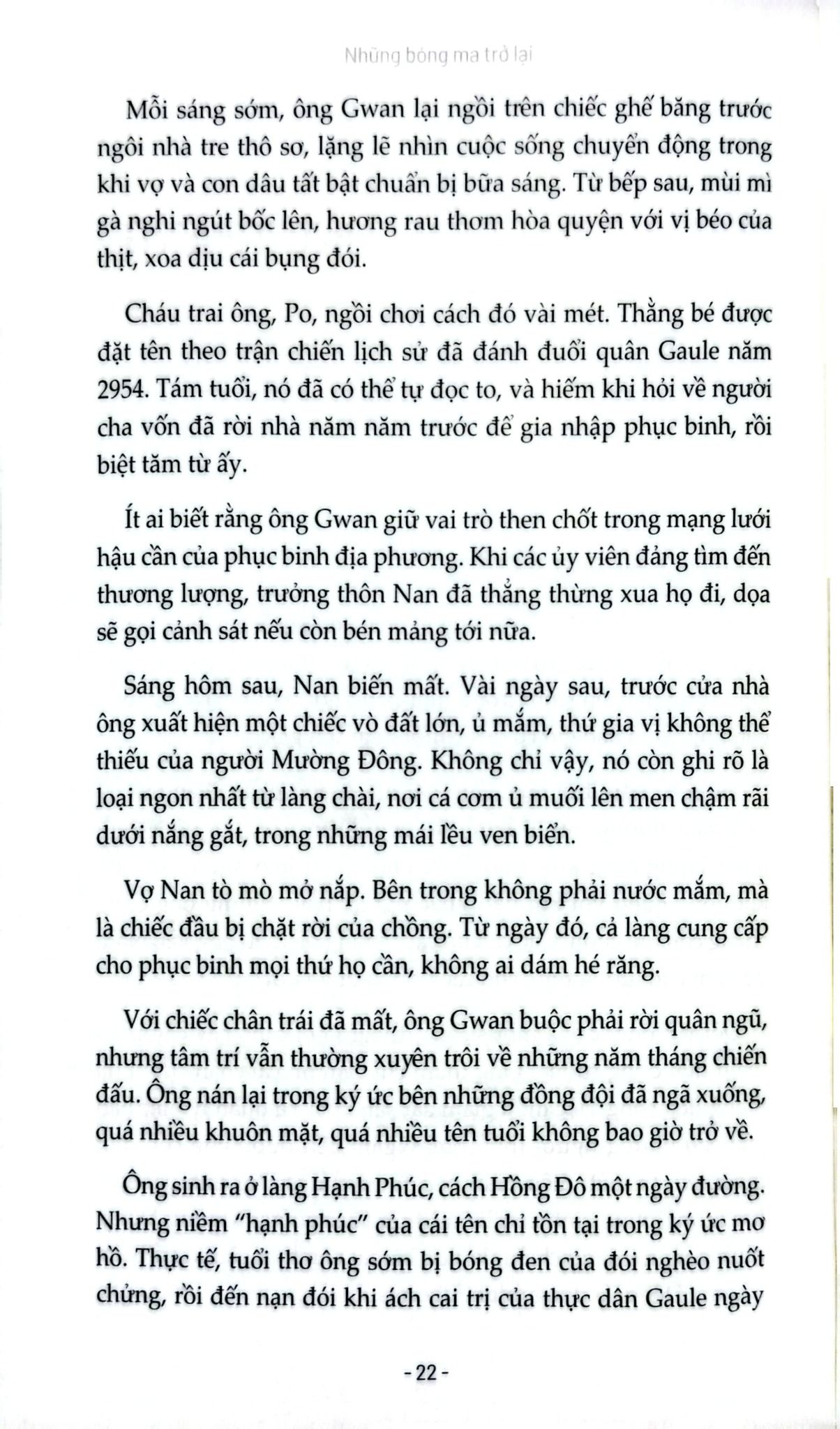 Từ Krung Thep rực sáng nhưng mục ruỗng, đến các khu rừng nhiệt đới khốc liệt của Mường Đông, từ phòng họp ngoại giao cho đến chiến hào đẫm máu, Những bóng ma trở lại dựng lên một bức tranh rộng lớn về quyền lực, phản bội, mất mát và lòng trung thành. Các nhân vật của Thomas Bo Pedersen - dù là tướng lĩnh, nhà báo, điệp viên hay thường dân - đều bị ám ảnh bởi những “bóng ma” từ quá khứ: chiến tranh, tội lỗi, và những lời hứa dang dở.