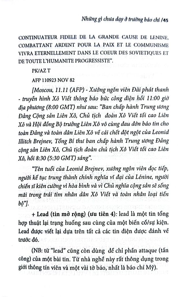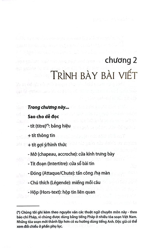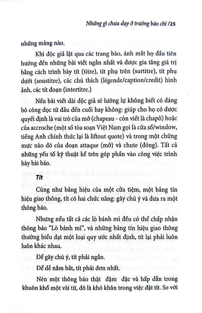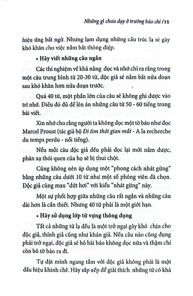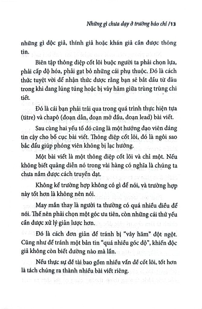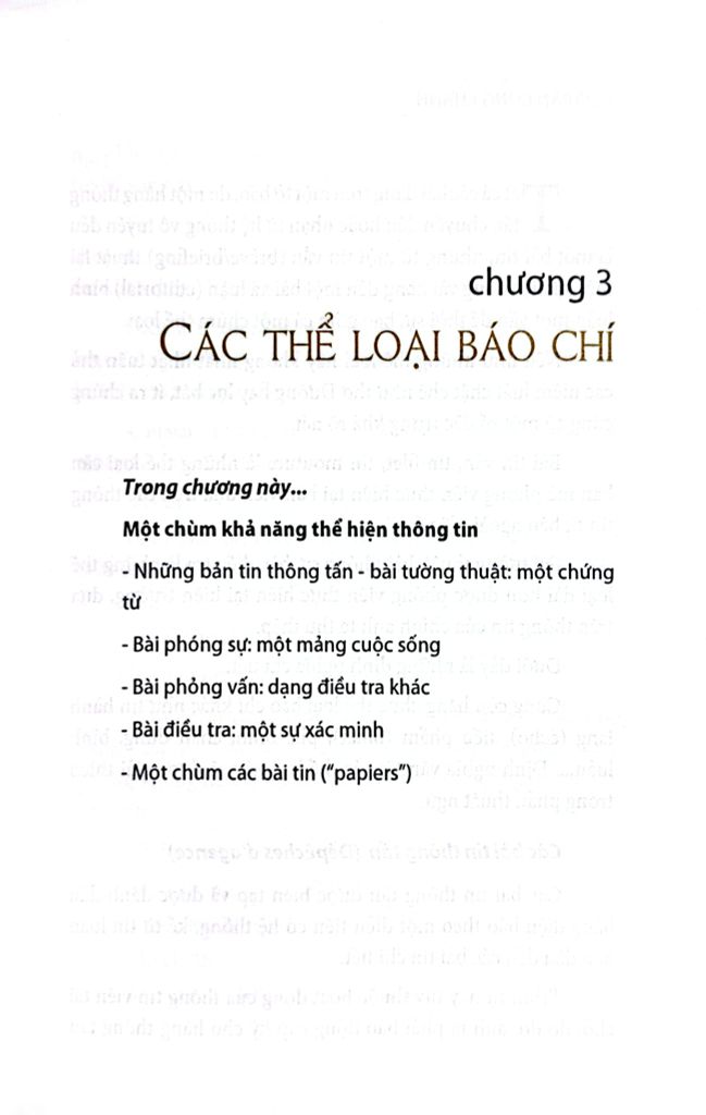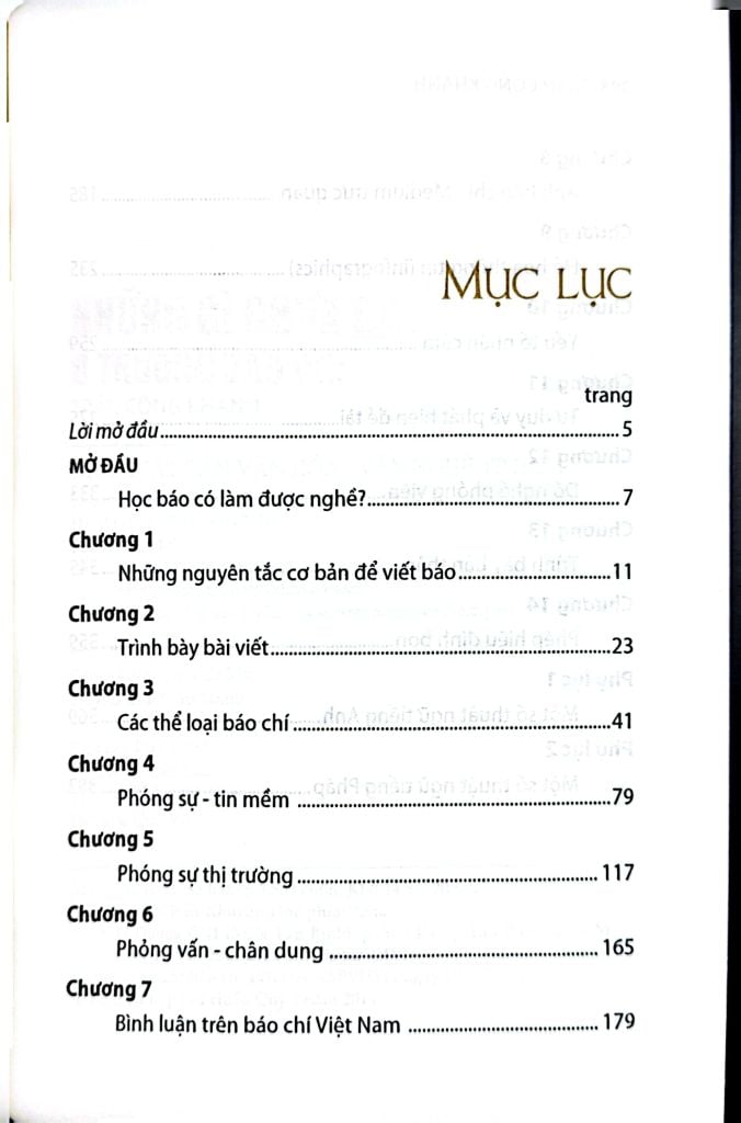 Dài 14 chương, sách hướng dẫn tỉ mỉ về nghề báo từ những nguyên tắc cơ bản để viết báo cho đến kỹ thuật thực hiện các thể loại báo chí như viết phóng sự, phỏng vấn, bình luận, ảnh báo chí - medium trực quan, đồ họa thông tin,... Những thí dụ minh họa sinh động, sự so sánh phản biện có chút khắc khe hay những bài báo, phóng sự ảnh đầy tính nhân văn được tác giả chọn dịch và đưa vào sách cũng là người bạn đường đáng tin cậy dành cho các học viên báo chí.