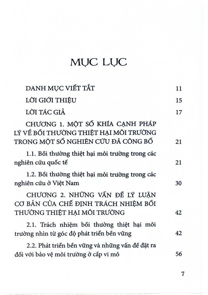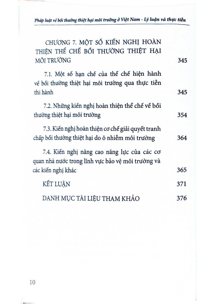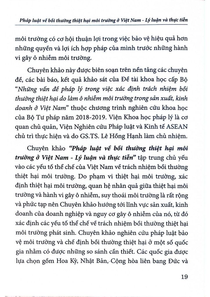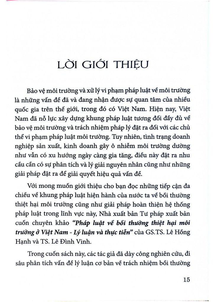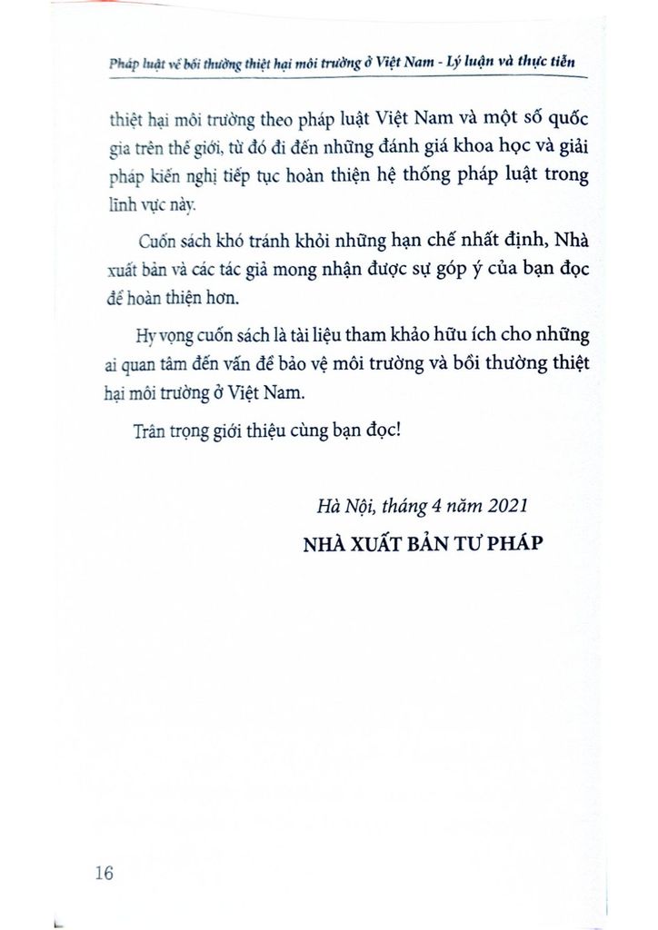 Hy vọng cuốn sách là tài liệu tham khảo hữu ích cho những ai quan tâm đến vấn đề bảo vệ môi trường và bồi thường thiệt hại môi trường ở Việt Nam.