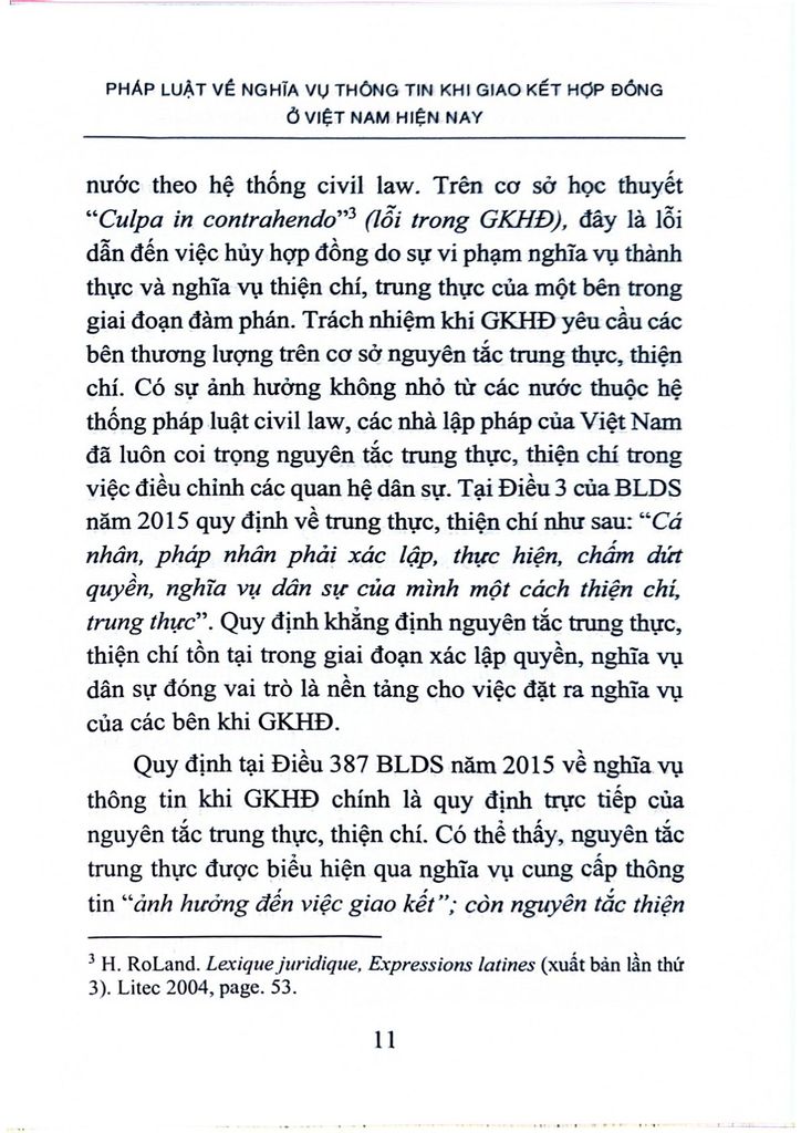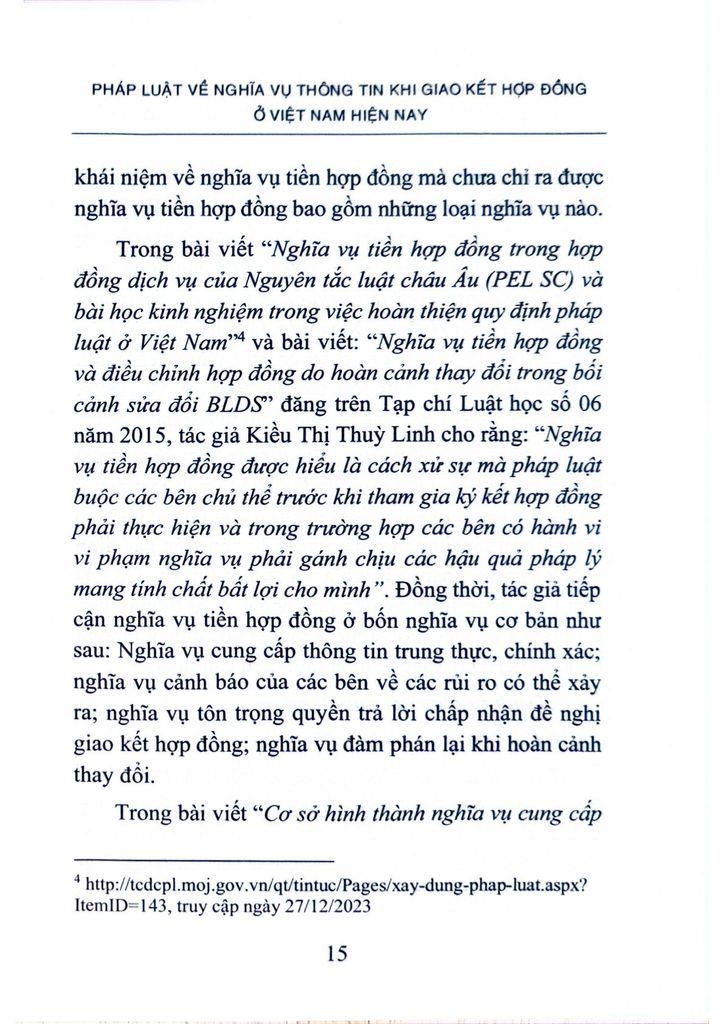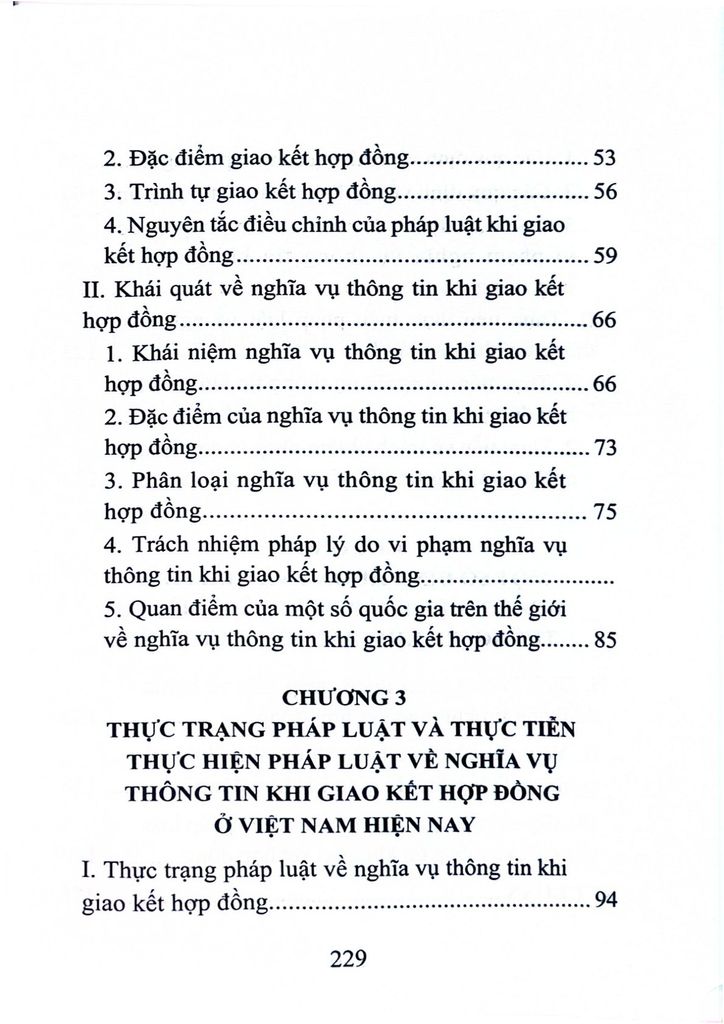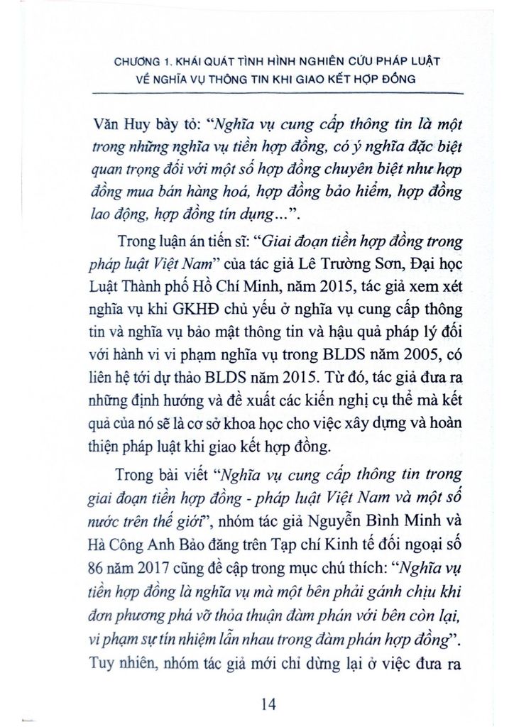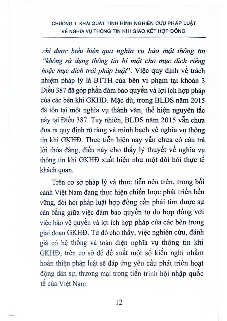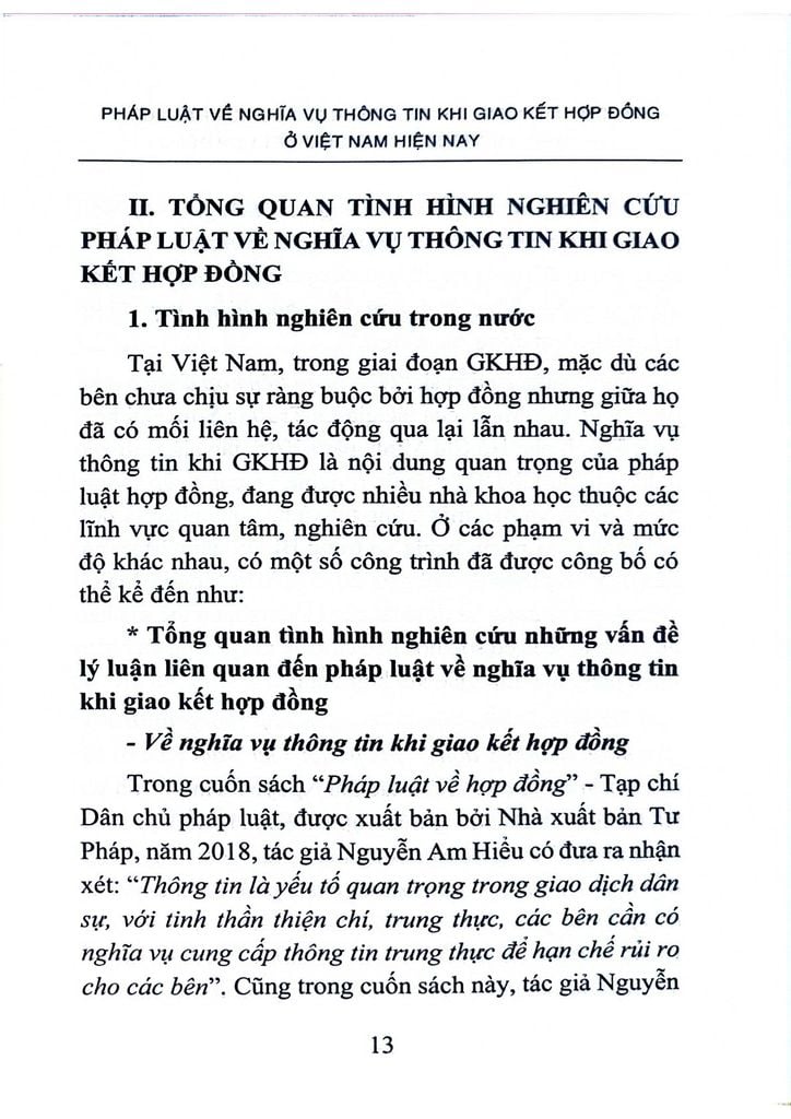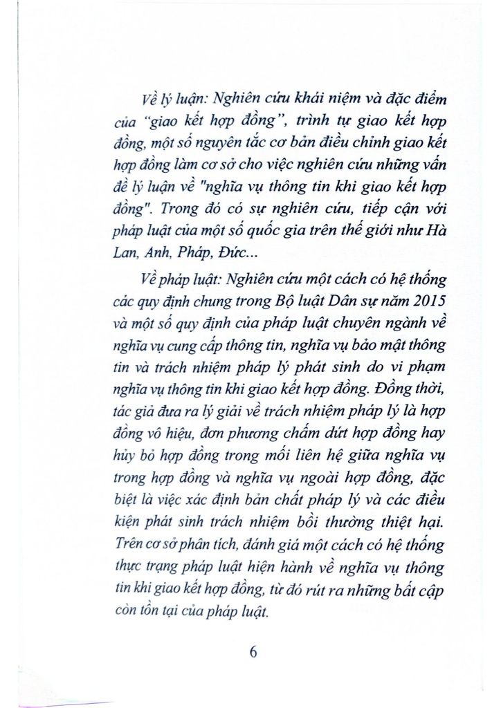 Về pháp luật: Nghiên cứu một cách có hệ thống các quy định chung trong Bộ luật Dân sự năm 2015 và một số quy định của pháp luật chuyên ngành về nghĩa vụ cung cấp thông tin, nghĩa vụ bảo mật thông tin và trách nhiệm pháp lý phát sinh do vi phạm nghĩa vụ thông tin khi giao kết hợp đồng. Đồng thời, tác giả đưa ra lý giải về trách nhiệm pháp lý là hợp đồng vô hiệu, đơn phương chấm dứt hợp đồng hay hủy bỏ hợp đồng trong mối liên hệ giữa nghĩa vụ trong hợp đồng và nghĩa vụ ngoài hợp đồng, đặc biệt là việc xác định bản chất pháp lý và các điều kiện phát sinh trách nhiệm bồi thường thiệt hại. Trên cơ sở phân tích, đánh giá một cách có hệ thống thực trạng pháp luật hiện hành về nghĩa vụ thông tin khi giao kết hợp đồng, từ đó rút ra những bất cập còn tồn tại của pháp luật.