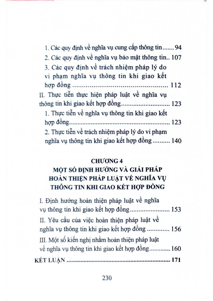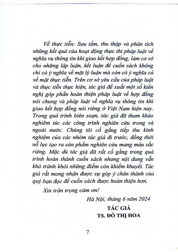 Về thực tiễn: Sưu tầm, thu thập và phân tích những kết quả của hoạt động thực thi pháp luật về nghĩa vụ thông tin khi giao kết hợp đồng, làm cơ sở cho những lập luận, kết luận để cuốn sách không chỉ có ý nghĩa về mặt lý luận mà còn có ý nghĩa cả về mặt thực tiễn. Trên cơ sở yêu cầu của pháp luật và thực tiễn thực hiện, tác giả đề xuất một số kiến nghị góp phần hoàn thiện pháp luật về hợp đồng nói chung và pháp luật về nghĩa vụ thông tin khi giao kết hợp đồng nói riêng ở Việt Nam hiện nay."