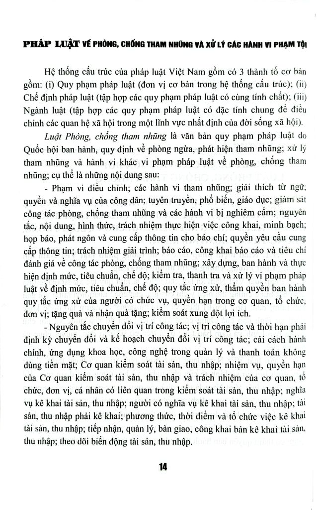 Để hiểu thêm về đạo luật Phòng, chống tham nhũng có hiệu lực từ ngày 1/7/2019 và để góp phần đưa bộ luật này sớm đi vào cuộc sống, Nhóm tác giả đã biên soạn cuốn: Pháp luật về phòng, chống tham nhũng và xử lý các hành vi phạm tội. Ngoài lời giới thiệu, danh mục tài liệu tham khảo, cuốn sách gồm 3 phần, 13 chương và 4 phụ lục: