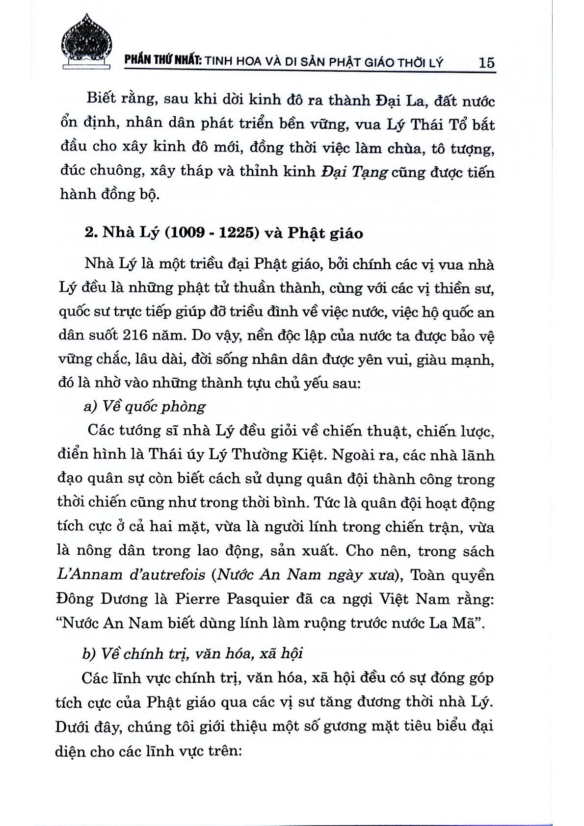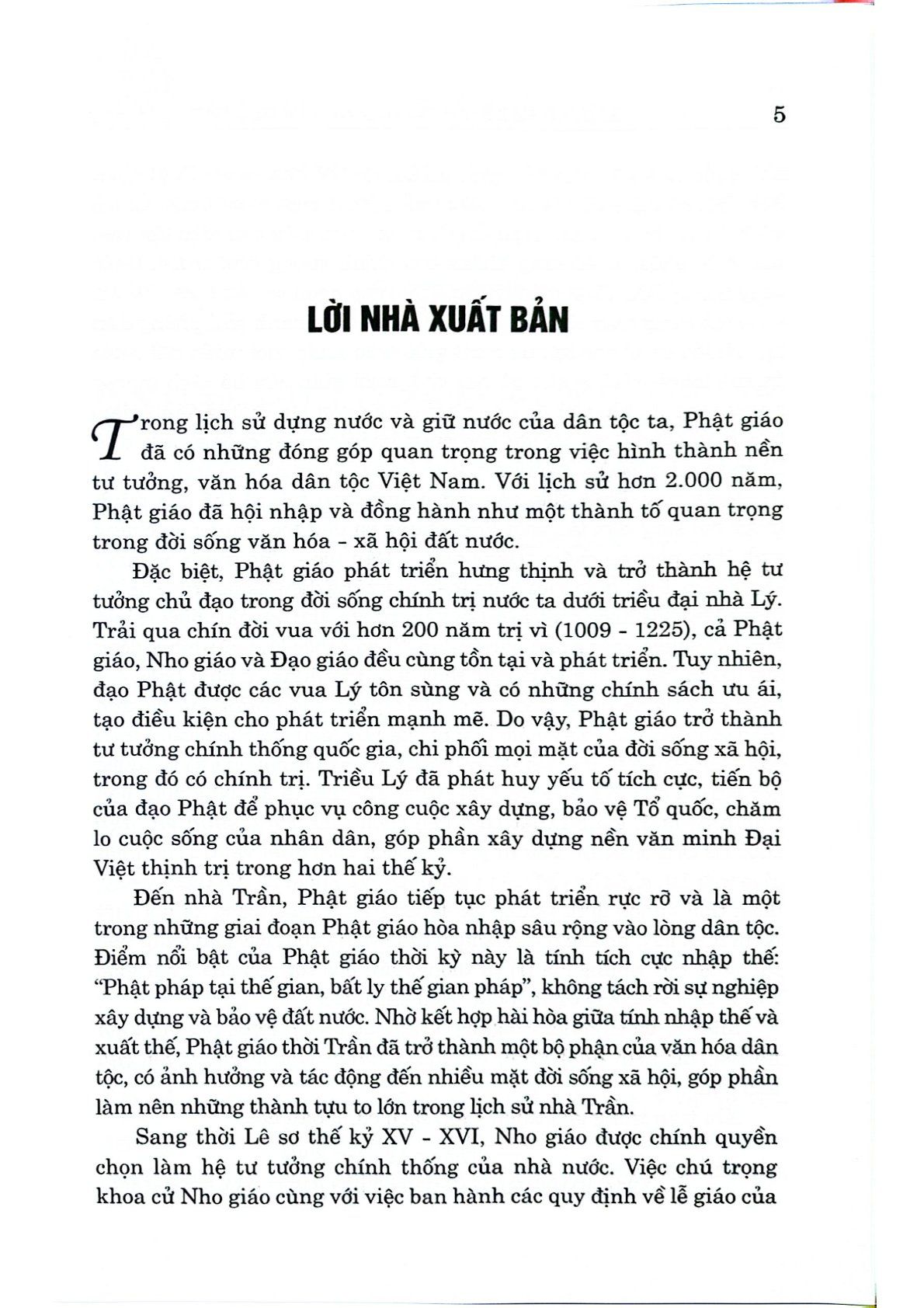 Triều Lý đã phát huy yếu tố tích cực, tiến bộ của đạo Phật để phục vụ công cuộc xây dựng, bảo vệ Tổ quốc, chăm lo cuộc sống của nhân dân, góp phần xây dựng nền văn minh Đại Việt thịnh trị trong hơn hai thế kỷ. Đến nhà Trần, Phật giáo tiếp tục phát triển rực rỡ và là một trong những giai đoạn Phật giáo hòa nhập sâu rộng vào lòng dân tộc. Điểm nổi bật của Phật giáo thời kỳ này là tính tích cực nhập thế: “Phật pháp tại thế gian, bất ly thế gian pháp”, không tách rời sự nghiệp xây dựng và bảo vệ đất nước. Nhờ kết hợp hài hòa giữa tính nhập thế và xuất thế, Phật giáo thời Trần đã trở thành một bộ phận của văn hóa dân tộc, có ảnh hưởng và tác động đến nhiều mặt đời sống xã hội, góp phần làm nên những thành tựu to lớn trong lịch sử nhà Trần. Sang thời Lê sơ thế kỷ XV – XVI, Nho giáo được chính quyền chọn làm hệ tư tưởng chính thống của nhà nước. Việc chú trọng khoa cử Nho giáo cùng với việc ban hành các quy định về lễ giáo của nhà nước đã khiến cho Nho giáo chiếm ưu thế hơn so với Phật giáo.