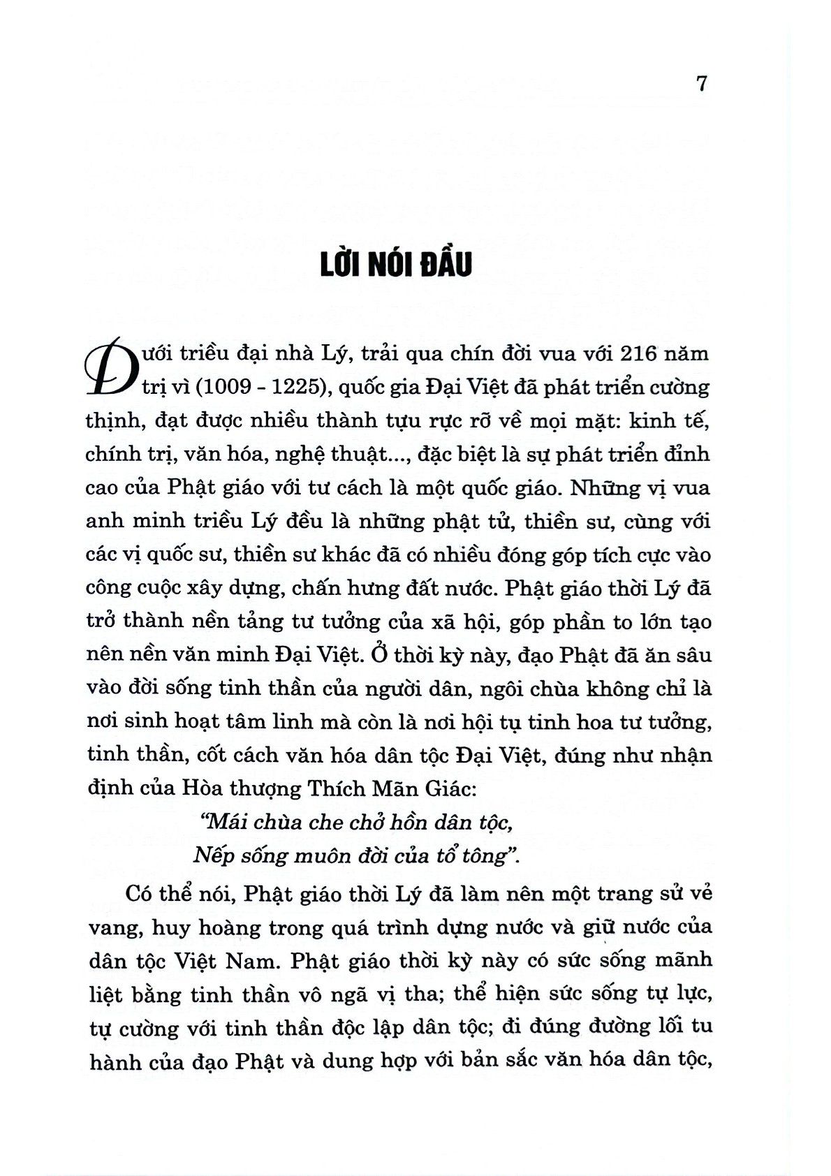 Trong lịch sử dựng nước và giữ nước của dân tộc ta, Phật giáo đã có những đóng góp quan trọng trong việc hình thành nền tư tưởng, văn hóa dân tộc Việt Nam. Với lịch sử hơn 2.000 năm, Phật giáo đã hội nhập và đồng hành như một thành tố quan trọng trong đời sống văn hóa – xã hội đất nước. Đặc biệt, Phật giáo phát triển hưng thịnh và trở thành hệ tư tưởng chủ đạo trong đời sống chính trị nước ta dưới triều đại nhà Lý. Trải qua chín đời vua với hơn 200 năm trị vì (1009 – 1225), cả Phật giáo, Nho giáo và Đạo giáo đều cùng tồn tại và phát triển. Tuy nhiên, đạo Phật được các vua Lý tôn sùng và có những chính sách ưu ái, tạo điều kiện cho phát triển mạnh mẽ. Do vậy, Phật giáo trở thành tư tưởng chính thống quốc gia, chi phối mọi mặt của đời sống xã hội, trong đó có chính trị.