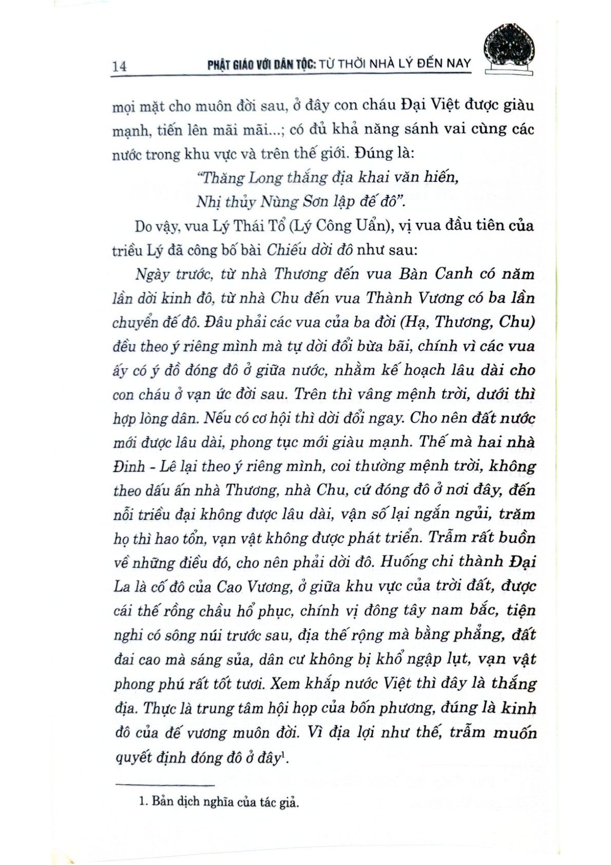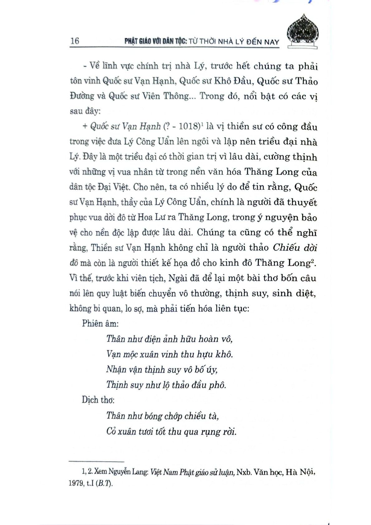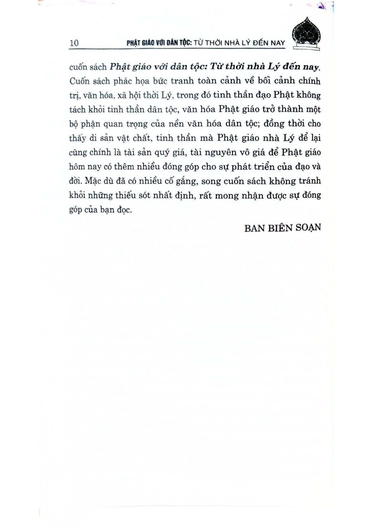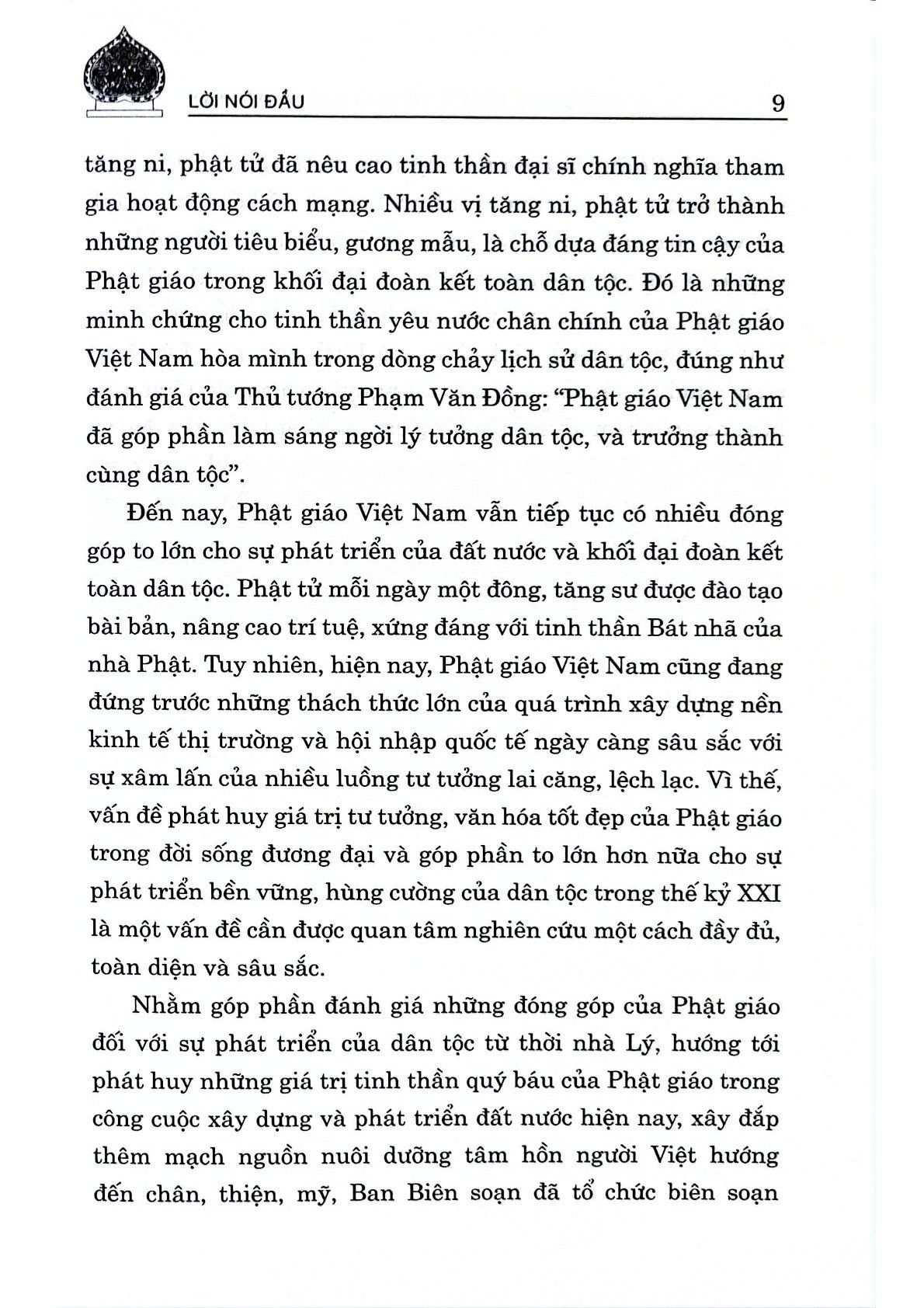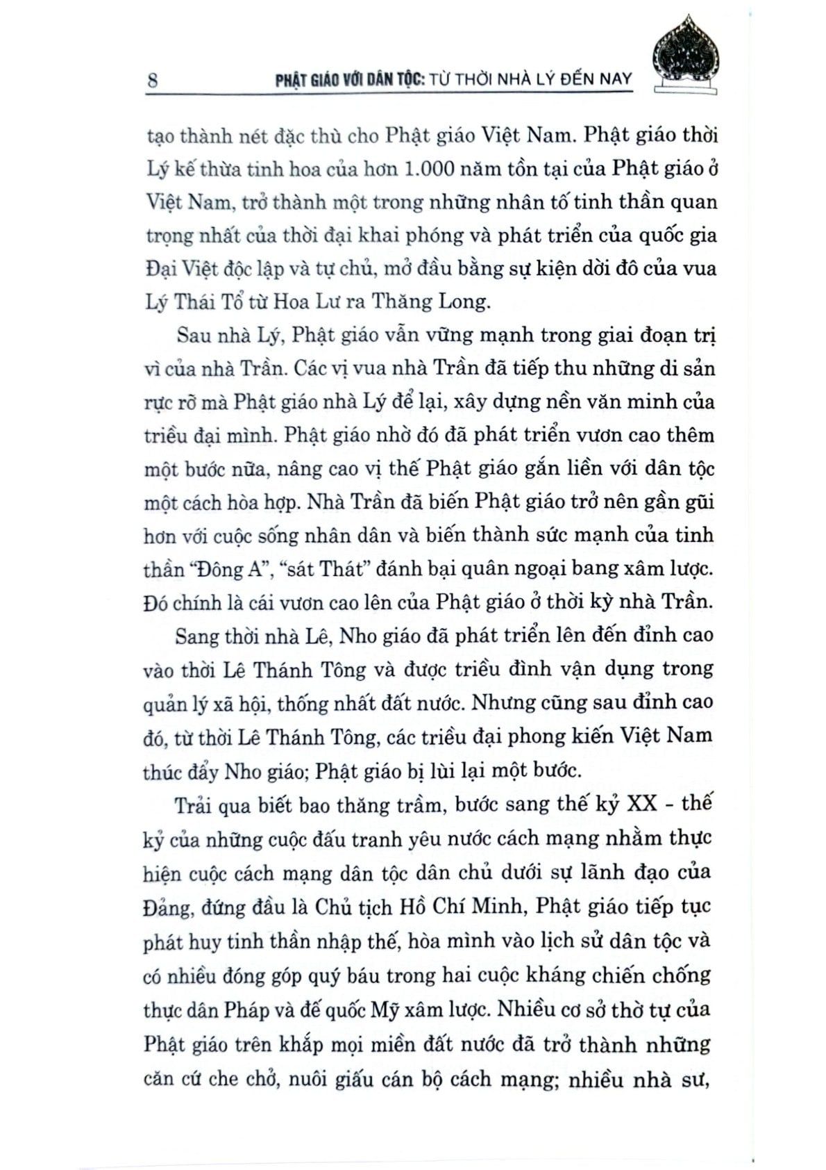 Ngày nay, Phật giáo vẫn giữ nguyên vai trò, vị thế của mình trong đời sống dân tộc, một lòng phụng sự dân tộc, phụng sự chúng sinh theo phương châm “Đạo pháp – Dân tộc – Chủ nghĩa xã hội”. Tuy nhiên, Phật giáo Việt Nam hiện nay cũng đang đứng trước nhiều thách thức, thường xuyên bị kẻ xấu và các thế lực thù địch, phản động lợi dụng, chống phá, xuyên tạc. Vì vậy, việc làm rõ những đóng góp to lớn của Phật giáo đối với công cuộc xây dựng và phát triển đất nước có ý nghĩa quan trọng, góp phần phát huy những giá trị tinh thần quý báu của Phật giáo, làm phong phú, sâu sắc thêm các giá trị văn hóa truyền thống, xây dựng hạnh phúc của con người và tư tưởng độc lập, tự chủ của dân tộc Việt Nam. Từ thực tế đó, Nhà xuất bản Chính trị quốc gia Sự thật xuất bản cuốn sách Phật giáo với dân tộc: Từ thời nhà Lý đến nay. Cuốn sách khái quát vai trò của Phật giáo thời Lý, phác họa bối cảnh chính trị, văn hóa, xã hội thời kỳ này; đồng thời khẳng định những giá trị của Phật giáo trong xã hội Việt Nam hiện nay, những cơ hội, thách thức và đề xuất các giải pháp tiếp tục phát huy những giá trị tư tưởng, văn hóa tốt đẹp của Phật giáo trong công cuộc xây dựng, phát triển đất nước.