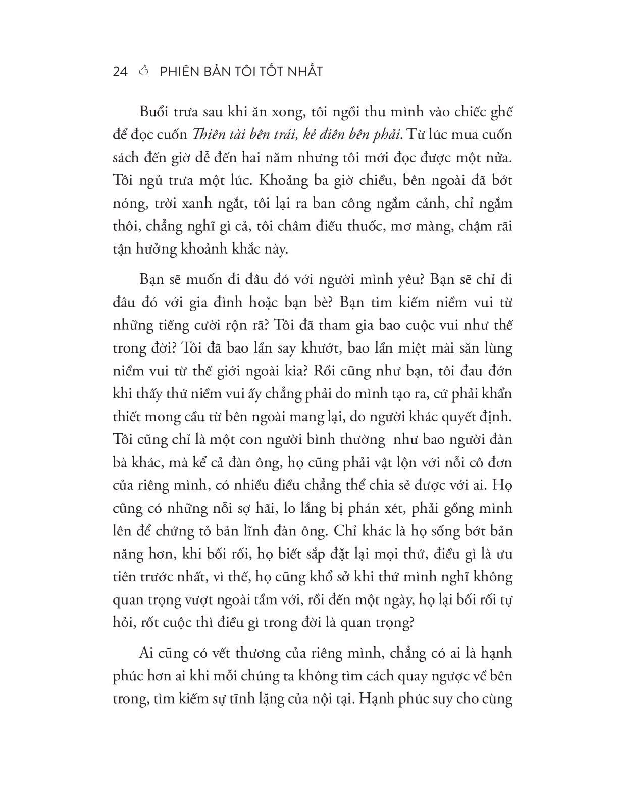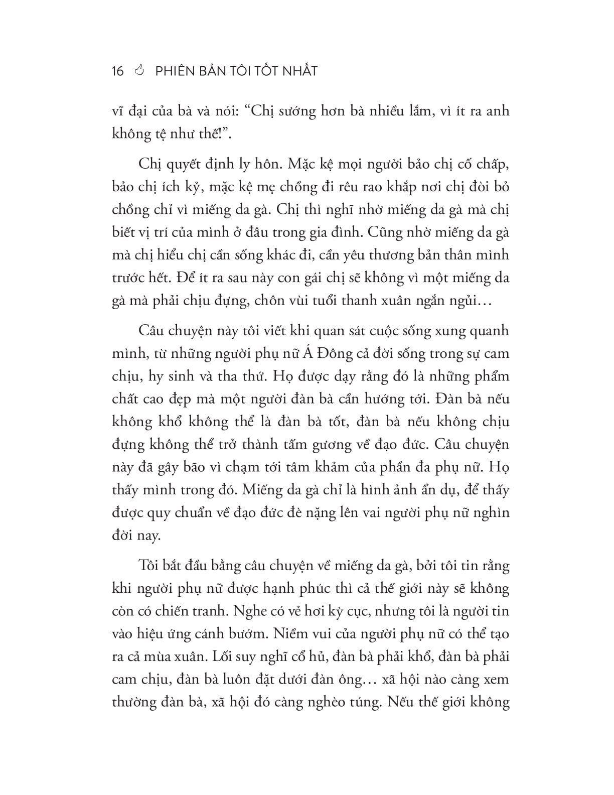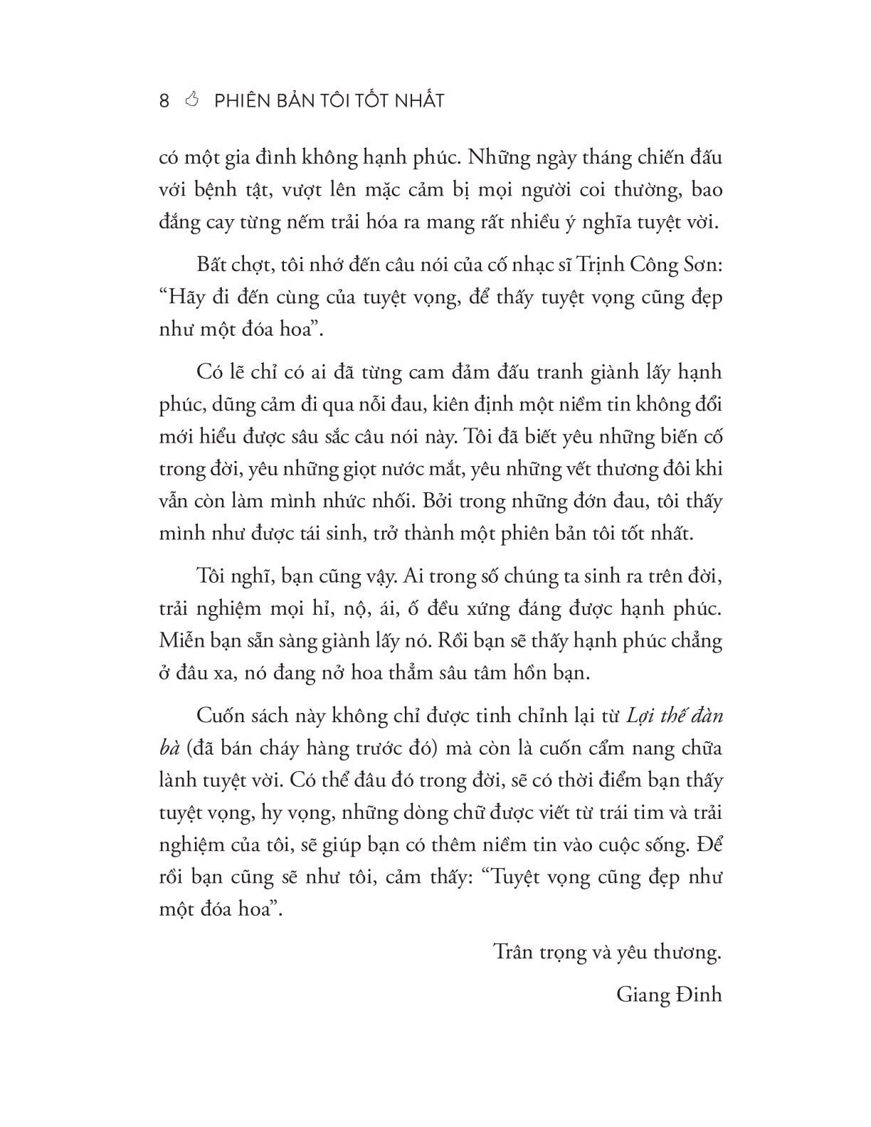 Phiên bản tôi tốt nhất, được tinh chỉnh từ cuốn Lợi thế đàn bà, đổi mới và bổ sung rất nhiều nội dung giá trị, dù vẫn bám vào những câu chuyện, bài học xoay quanh người phụ nữ, nhưng nó không hẳn chỉ dành riêng cho phụ nữ.