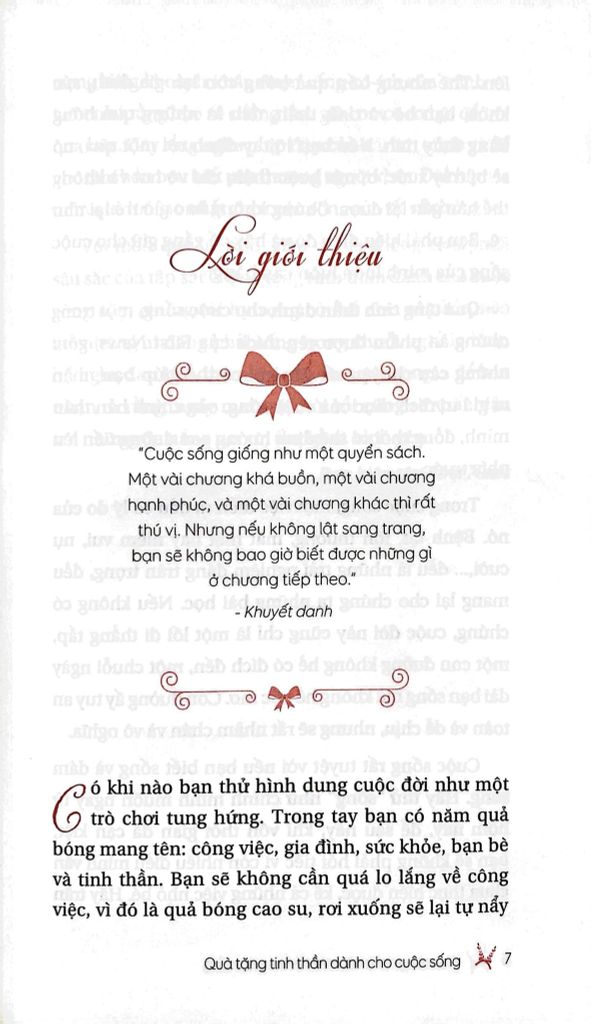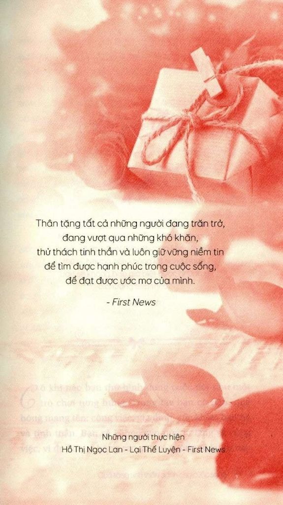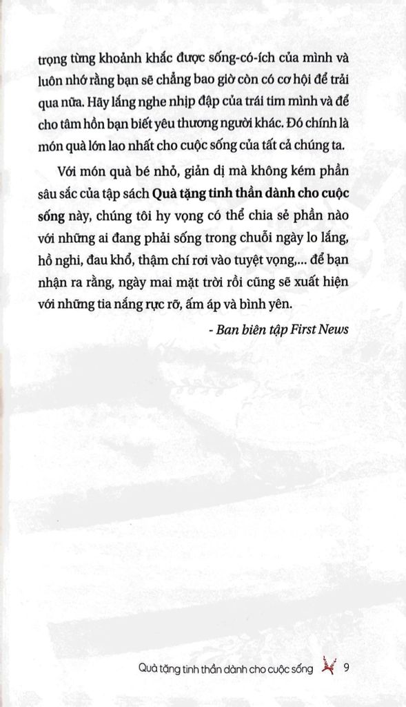 Với những “món quà” bé nhỏ, giản dị mà không kém phần sâu sắc trong Quà tặng Tinh thần cho Cuộc sống, chúng tôi hy vọng có thể đồng cảm, chia sẻ với những ai đang phải sống trong chuỗi ngày lo lắng, hồ nghi, khổ đau, thậm chí rơi vào tuyệt vọng… để bạn nhận ra rằng, ngày mai mặt trời rồi cũng sẽ xuất hiện với những tia nắng rực rỡ, ấm áp và bình yên.