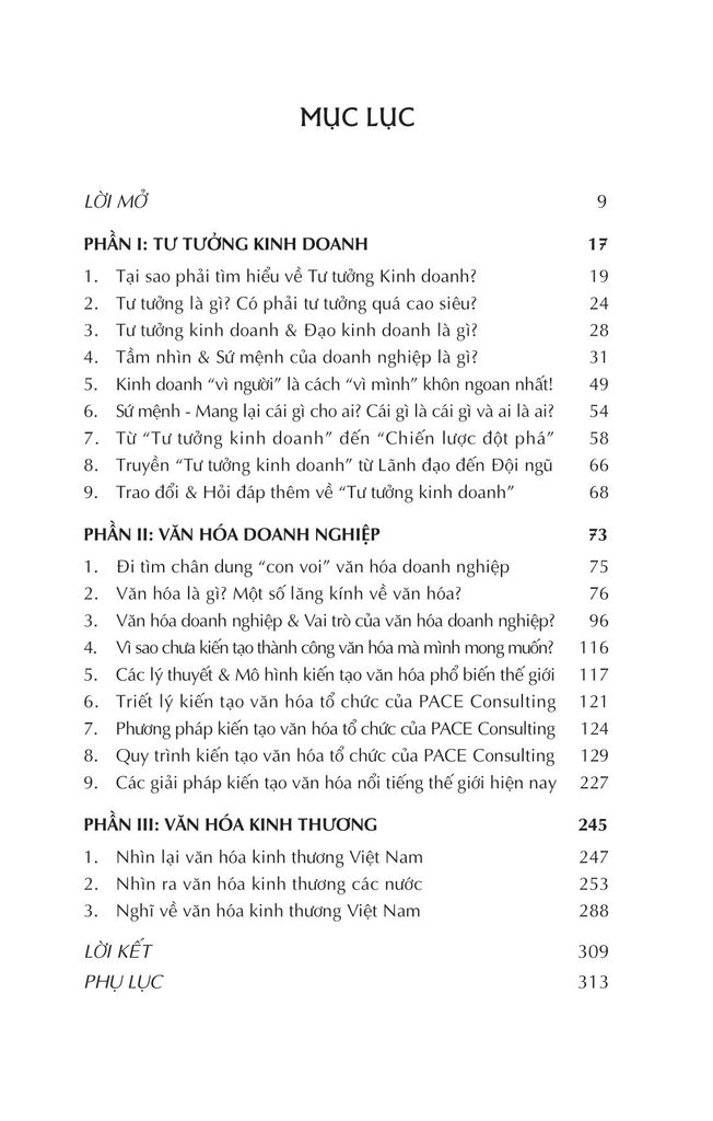 Cuốn sách này có sự tích hợp xuyên suốt từ tinh thần, tư tưởng và triết lý cho đến phương pháp và giải pháp, cũng như sự kết nối 5 chủ thể văn hóa là cá nhân, bộ phận, tổ chức, kinh thương, quốc gia, và nội dung cuốn sách được chia làm 03 phần chính như sau: