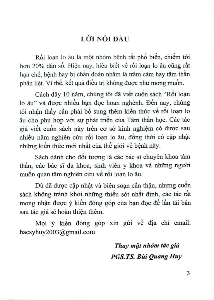 Cách đây 10 năm, chúng tôi đã viết cuốn sách “Rối loạn lo âu” và được nhiều bạn đọc hoan nghênh. Đến nay, chúng tôi nhận thấy cần phải bổ sung thêm kiến thức về rối loạn lo âu cho phù hợp với sự phát triển của Tâm thần học. Các tác giả viết cuốn sách này trên cơ sở kinh nghiệm có được sau nhiều năm nghiên cứu rối loạn lo âu, đồng thời có cập nhật những kiến thức mới nhất của thế giới về bệnh này.