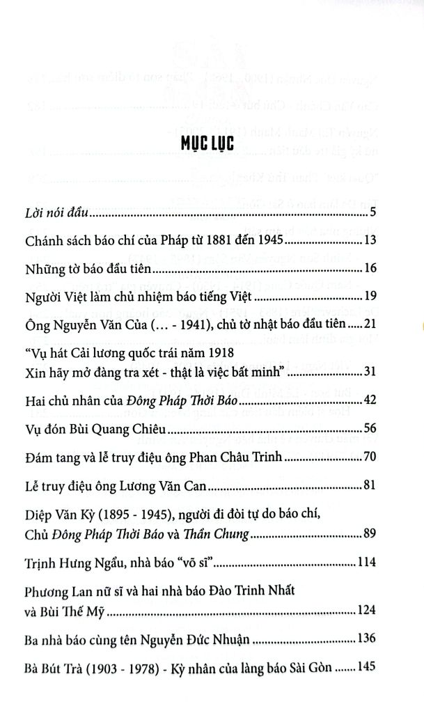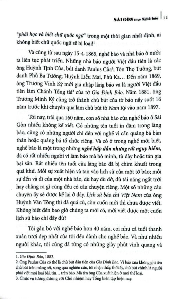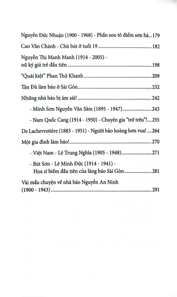 Rất nhiều tên tuổi của làng báo đã bị chìm khuất trong quá khứ mà ngay cả người đang làm báo ngày nay cũng không biết hoặc nhớ như Trương Minh Ký, Nguyễn Viên Kiều, Nguyễn Kim Đính, Nguyễn Chánh Sắt, Diệp Văn Kỳ, Phan Thứ Khanh, Cao Chánh, Nguyễn thị Manh Manh... Mà mỗi sự xuất hiện và tan vào lịch sử của một tờ báo; mỗi sự đến và đi của một nhà báo, dù hay dù dở, dù tài năng ngất trời hay chẳng ra gì cũng đều có câu chuyện riêng.