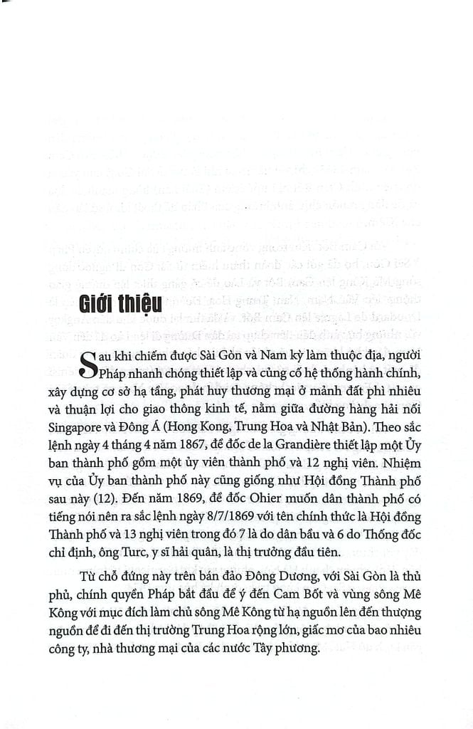 Sau khi chiếm được Sài Gòn và Nam kỳ làm thuộc địa, người Pháp nhanh chóng thiết lập và củng cố hệ thống hành chính, xây dựng cơ sở hạ tầng, phát huy thương mại ở mảnh đất phì nhiêu và thuận lợi cho giao thông kinh tế, nằm giữa đường hàng hải nối Singapore và Đông Á (Hong Kong, Trung Hoa và Nhật Bản). Theo sắc lệnh ngày 4 tháng 4 năm 1867, đề đốc de la Grandière thiết lập một Ủy ban thành phố gồm một ủy viên thành phố và 12 nghị viên. Nhiệm vụ của Ủy ban thành phố này cũng giống như Hội đồng Thành phố sau này (12). Đến năm 1869, đề đốc Ohier muốn dân thành phố có tiếng nói nên ra sắc lệnh ngày 8/7/1869 với tên chính thức là Hội đồng Thành phố và 13 nghị viên trong đó 7 là do dân bầu và 6 do Thống đốc chỉ định, ông Turc, y sĩ hải quân, là thị trưởng đầu tiên.