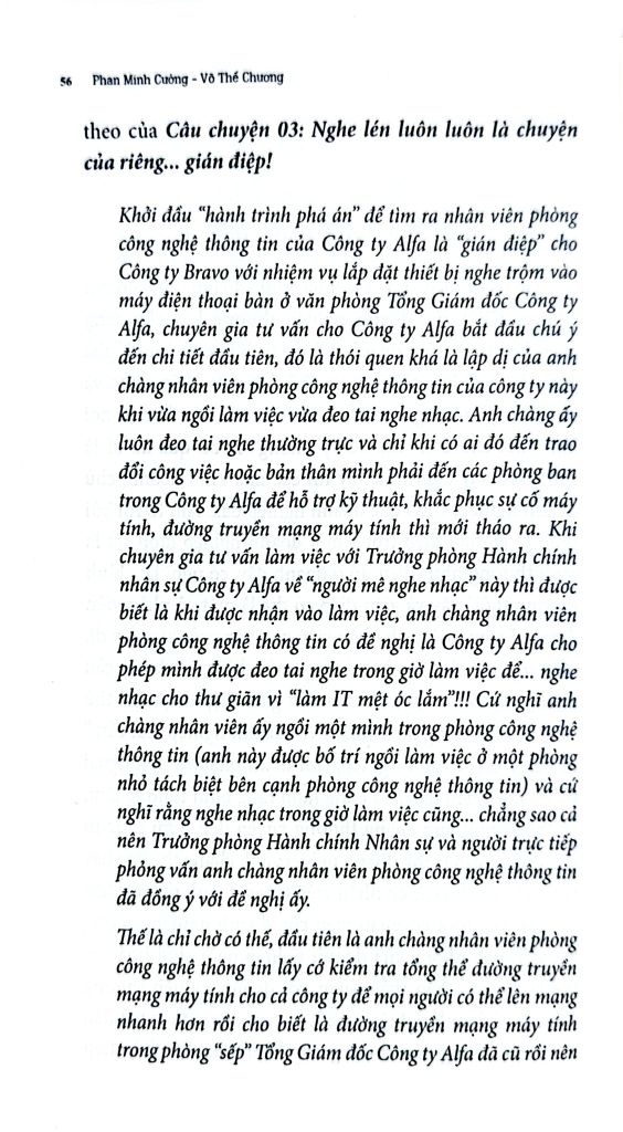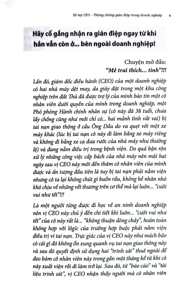 “Sổ tay CEO phòng chống gián điệp trong doanh nghiệp” xoay quanh những câu chuyện nhỏ nhưng để lại hậu quả lớn trong doanh nghiệp, chẳng hạn như “Mê trai thích…tình”, hay ““Đừng chết vì thiếu …cảnh giác!”