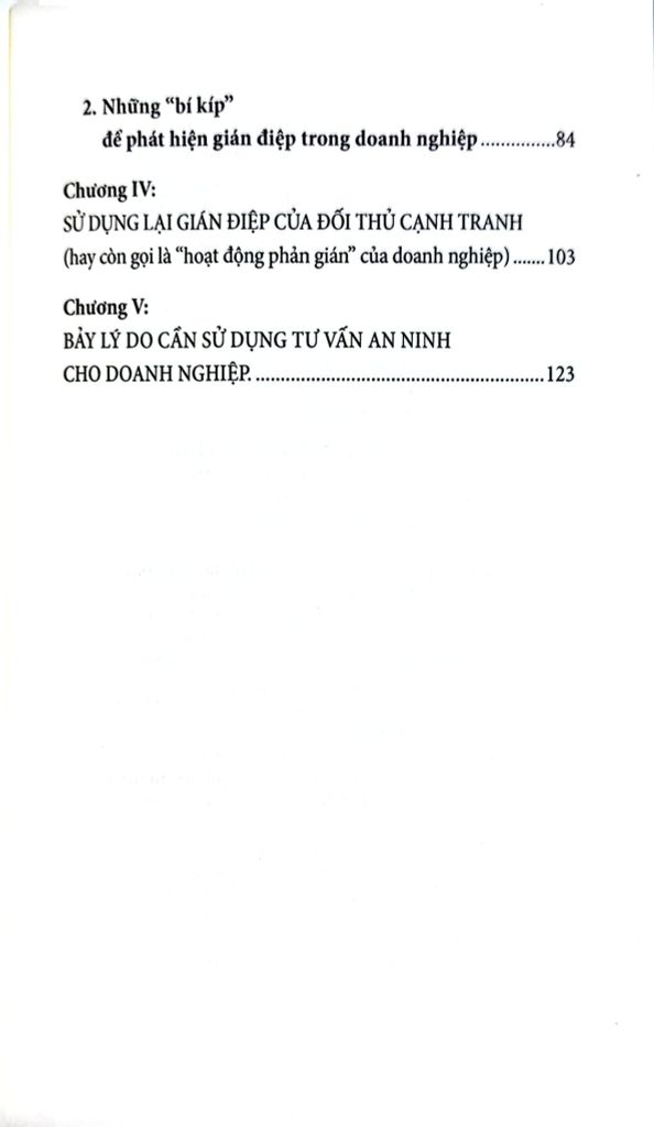 Tác giả đã khái quát một cách ngắn gọn nhất bao trùm cả tác phẩm, hướng dẫn các doanh nghiệp làm quen với các hoạt động của gián diệp như thế nào, cách đề phòng và phát hiện gián điệp, đặt câu hỏi gián điệp ở đâu, từ đâu mà có và chúng ta biết phải làm gì khi đã phát hiện ra gián điệp.