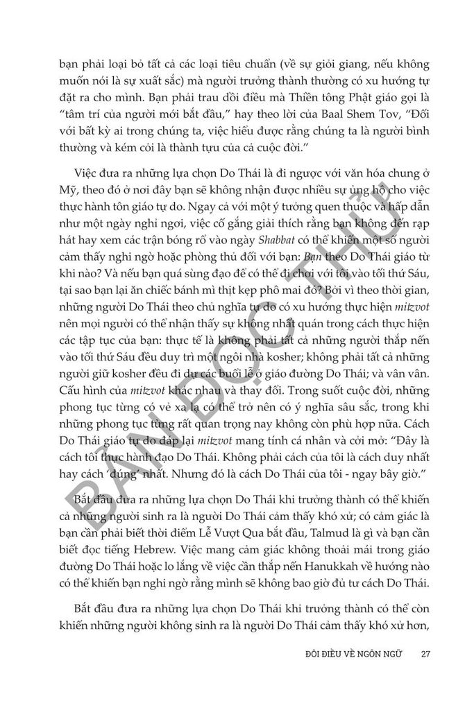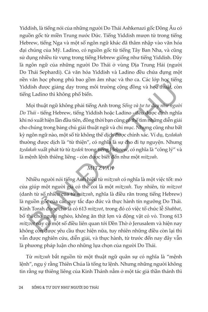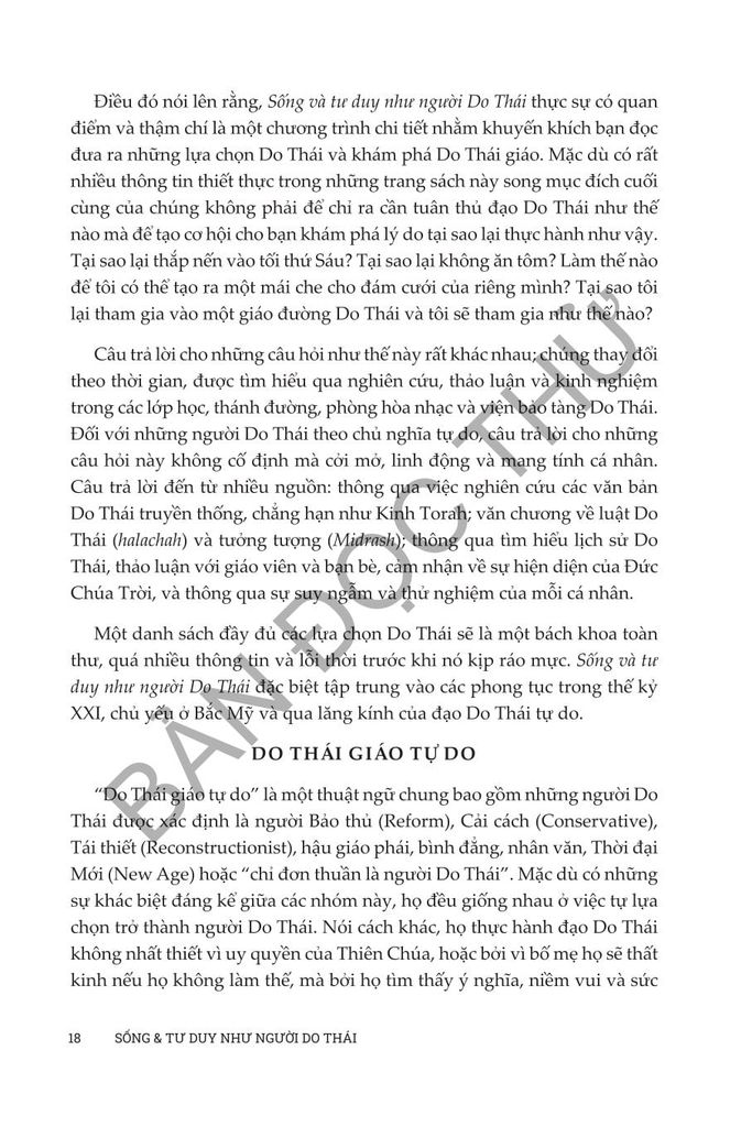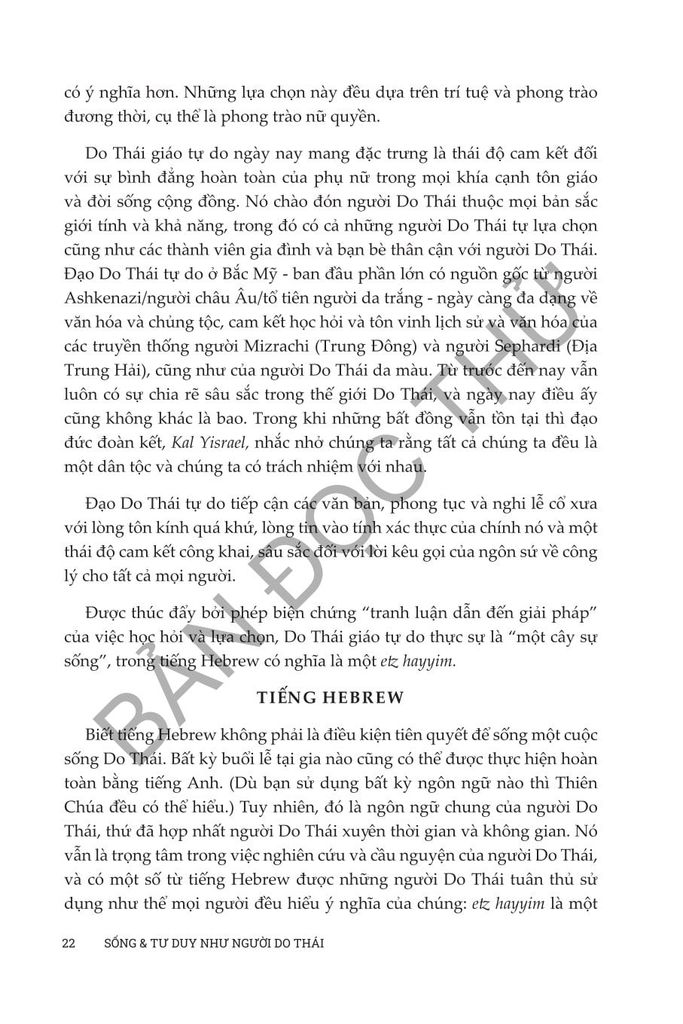 Sống và tư duy như người Do Thái của Anita Diamant & Howard Hooper đóng vai trò như một hướng dẫn toàn diện để tìm hiểu về sự phức tạp đẹp đẽ của đạo Do Thái trong thế giới hiện đại. Cuốn sách này đem đến những kiến thức phong phú về truyền thống, phong tục và giá trị Do Thái trong thế kỷ 21, cung cấp cho độc giả cách tiếp cận thực tế để tôn vinh và hiểu biết sâu sắc về việc thực hành văn hóa và tâm linh của người Do Thái. Từ việc treo mezuzah đến cử hành Lễ Vượt Qua, cuốn sách này đề cập đến nhiều chủ đề phục vụ cho cả những người mới theo đạo Do Thái và những người thực hành lâu năm đang tìm cách gắn kết sâu sắc hơn với đức tin của họ. Dù bạn quan tâm đến các khía cạnh văn hóa hay nền tảng tinh thần sâu sắc của cuộc sống Do Thái, Diamant và Cooper mang đến một khám phá dễ tiếp cận, sâu sắc và tôn trọng nhằm thu hẹp khoảng cách giữa thực hành truyền thống và cuộc sống đương đại, khiến cuốn sách trở thành nguồn tài liệu không thể thiếu cho bất kỳ ai muốn tìm hiểu và tiếp nhận lối sống của người Do Thái.