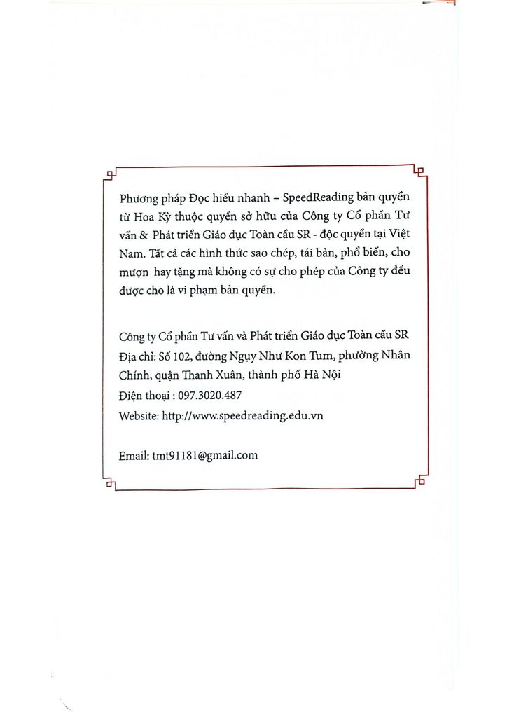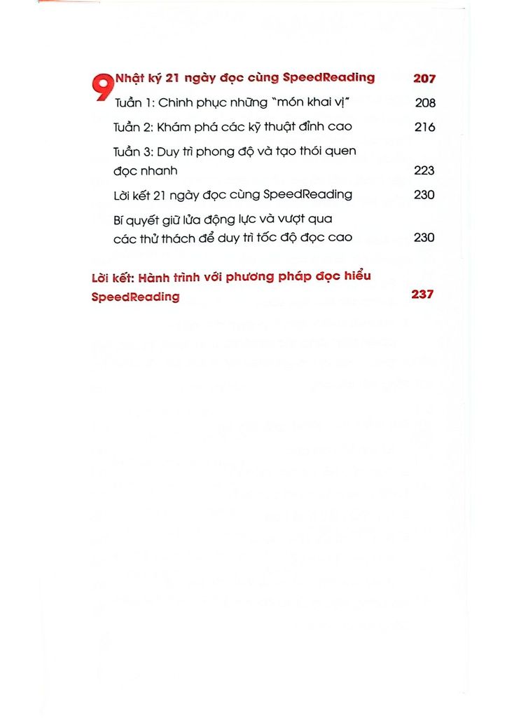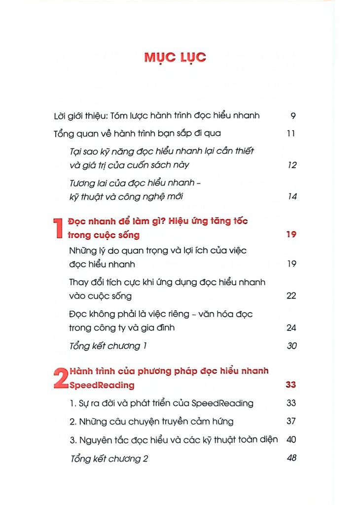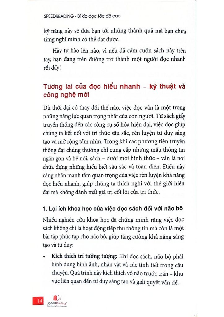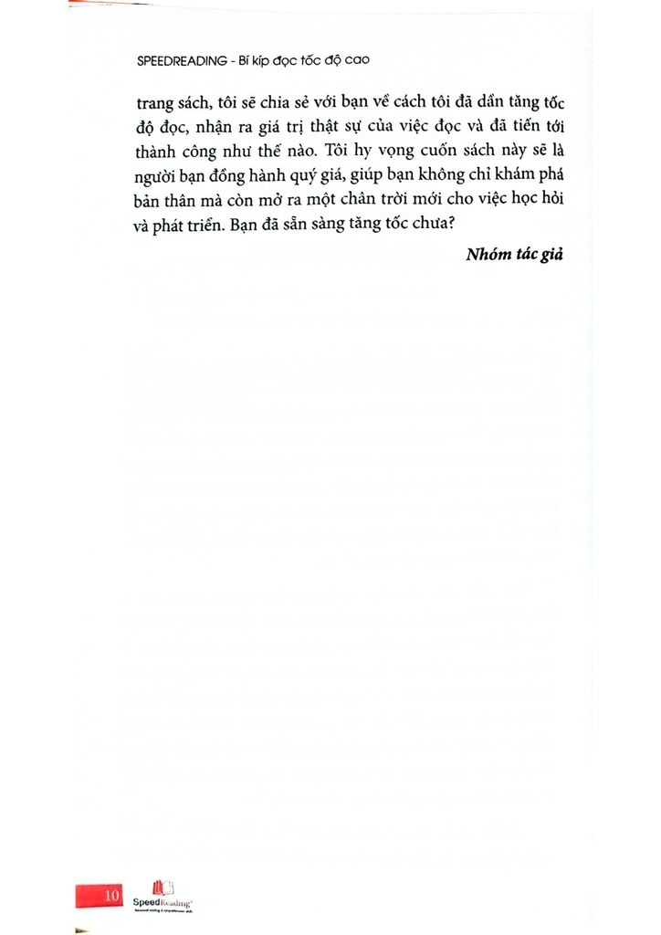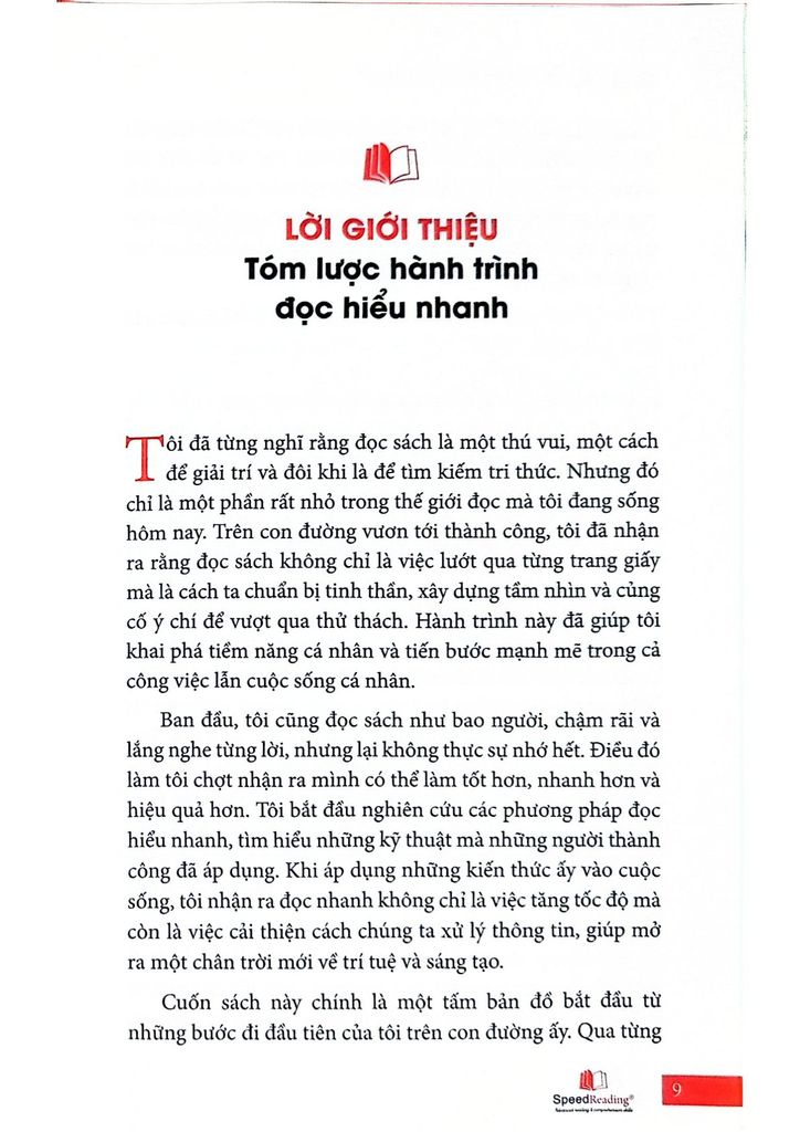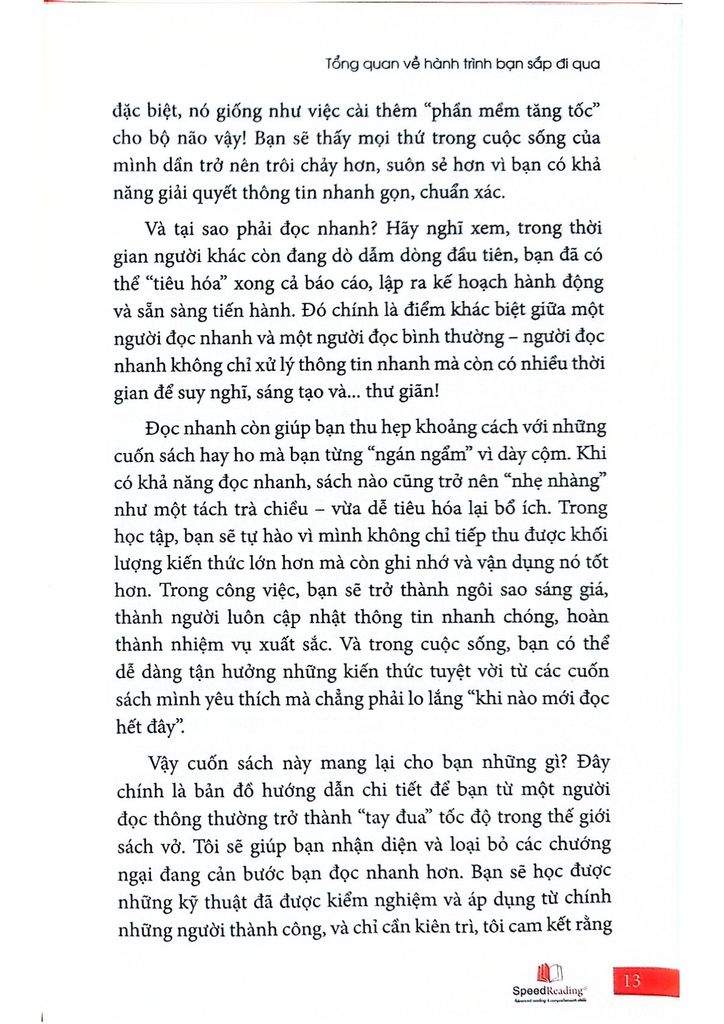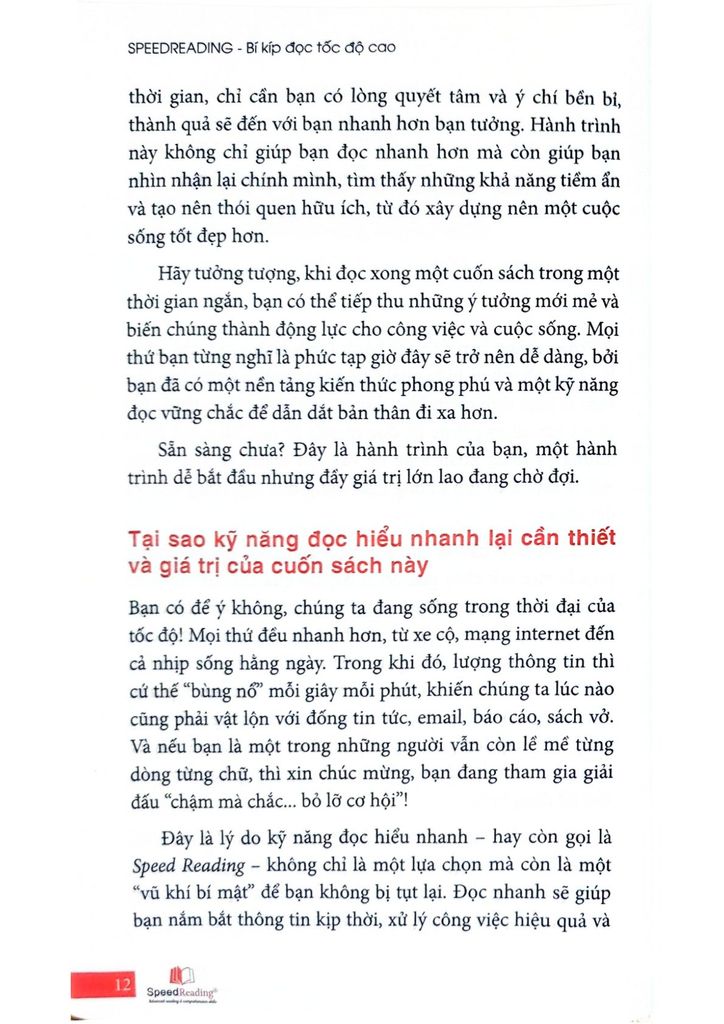 Cuốn sách Speedreading là bản đồ hướng dẫn chi tiết để bạn từ một người đọc thông thường trở thành “tay đua” tốc độ trong thế giới sách vở. Cuốn sách Speedreading sẽ giúp bạn nhận diện và loại bỏ các chướng ngại đang cản bước bạn đọc nhanh hơn. Bạn sẽ học được những kỹ thuật đã được kiểm nghiệm và áp dụng từ chính những người thành công, và chỉ cần kiên trì, kỹ năng này sẽ đưa bạn tới những thành quả mà bạn chưa từng nghĩ mình có thể đạt được.