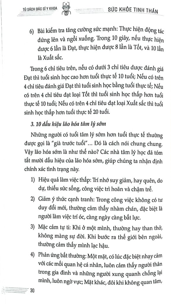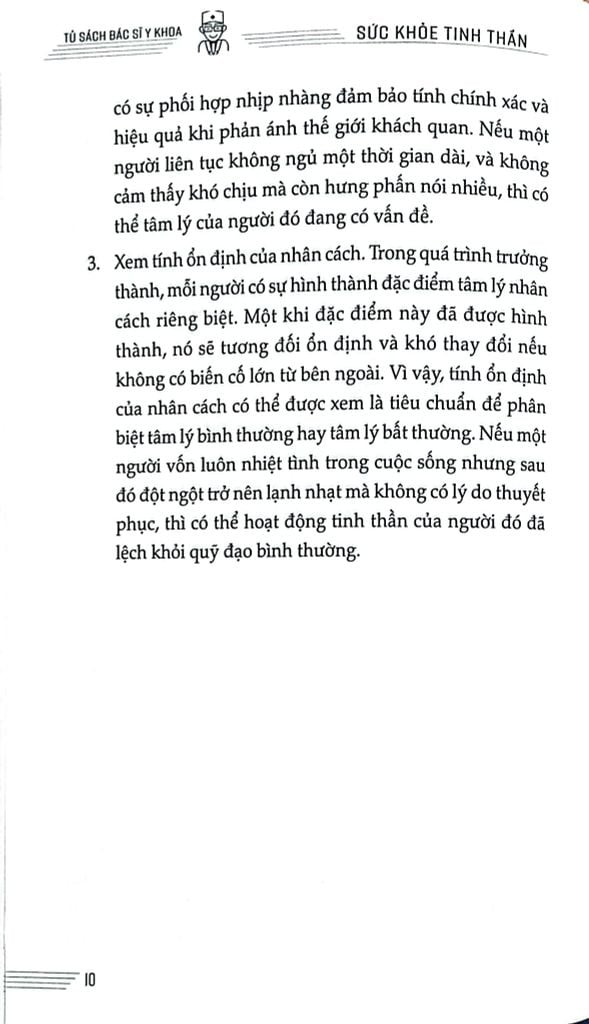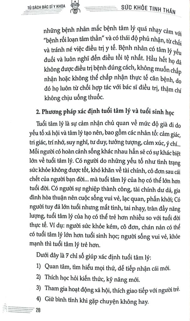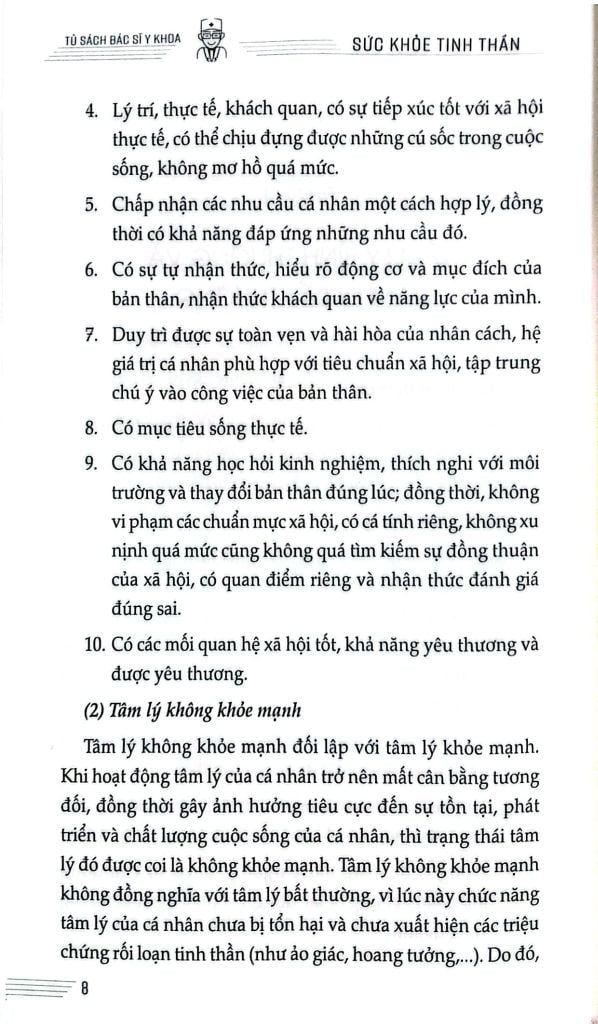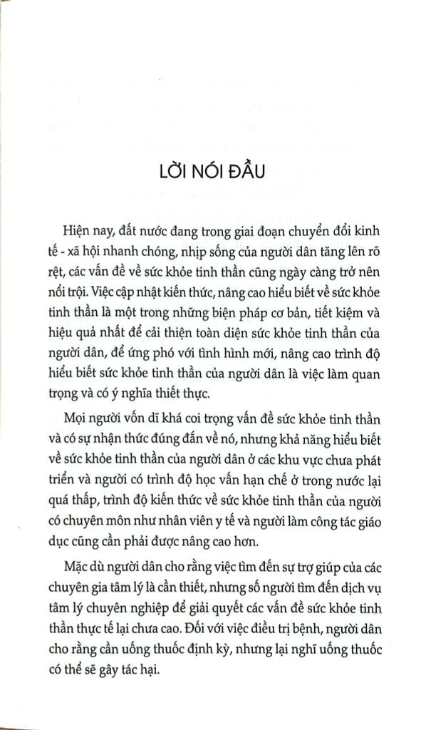 Nội dung mỗi phần đều hoàn chỉnh, tách biệt, trình bày dễ hiểu, thuận tiện cho việc đọc và tra cứu. Sách đưa ra một lối sống khoa học và lành mạnh cùng sự nhận thức, thái độ đúng đắn trong việc nhìn nhận và xử lý các vấn đề tâm lý, các bệnh về tinh thần, giúp hình thành quan niệm đúng đắn trong việc khám chữa bệnh, tuân thủ chỉ định dùng thuốc của bác sĩ, để từ đó nâng cao năng lực sức khỏe tinh thần cộng đồng, góp phần vào việc xây dựng một “Đất nước khỏe mạnh”.