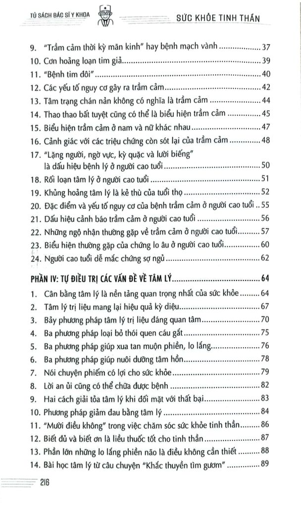 “Sức Khỏe Tinh Thần - Những phương pháp chẩn đoán và điều trị” là cuốn sách khoa học phổ thông, cung cấp những kiến thức về sức khỏe tâm lý, cũng như phương pháp điều trị và cách chăm sóc thường ngày đối với các bệnh về tinh thần. Sách được chia thành năm phần chính: