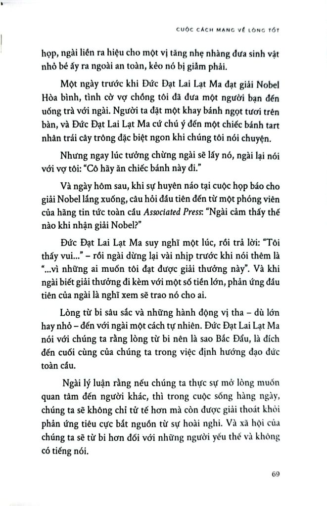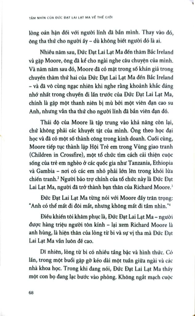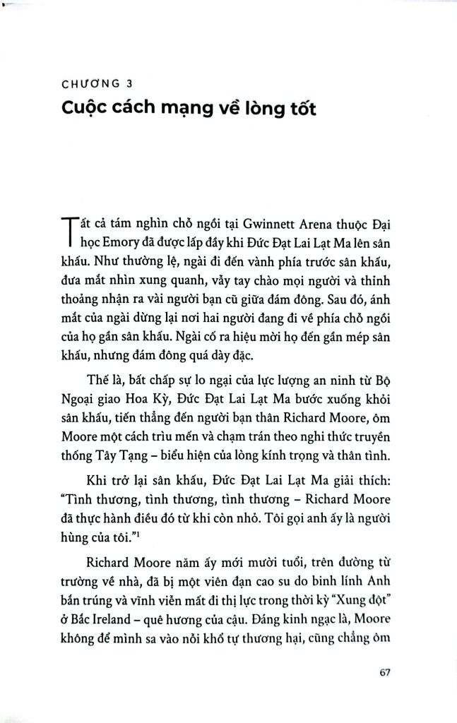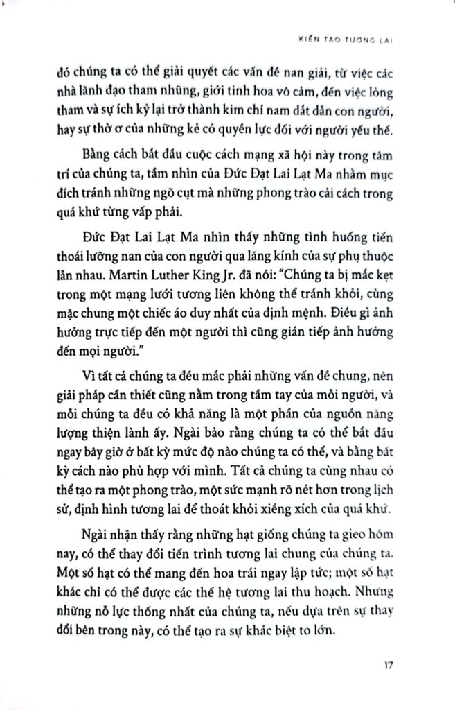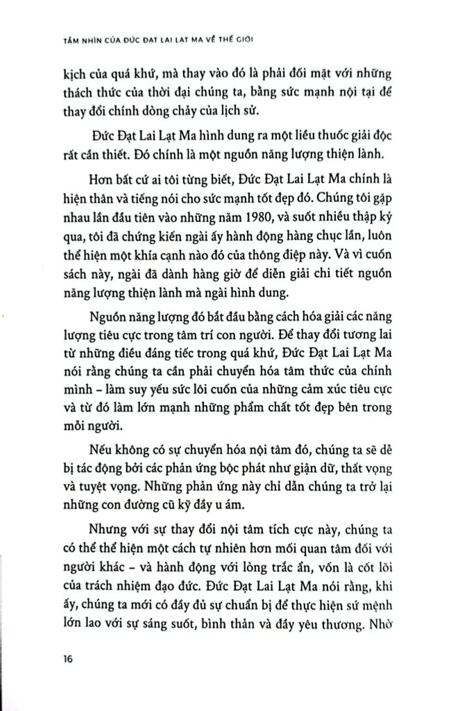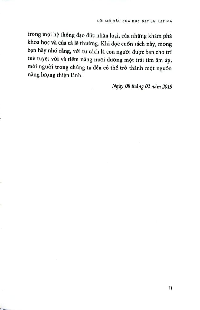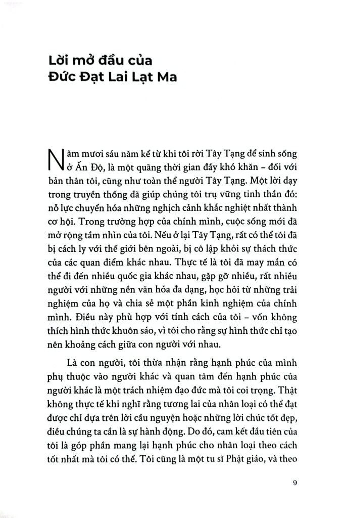 Tôi tin rằng mục tiêu về một thế giới hòa bình hơn, nơi con người sống hạnh phúc, yêu thương và hỗ trợ lẫn nhau trọn vẹn hơn là điều chúng ta có thể đạt được. Nhưng chúng ta phải xem xét mục tiêu này với tư duy rộng mở và tầm nhìn dài hạn. Sự thay đổi trong chính chúng ta và trong thế giới mà chúng ta đang sống có thể không xảy ra ngay lập tức mà cần có thời gian. Nhưng nếu chúng ta không nỗ lực thì sẽ chẳng có điều gì xảy ra. Điều quan trọng nhất mà tôi hy vọng độc giả sẽ hiểu được, đó là sự thay đổi như vậy sẽ không xảy ra nhờ vào các quyết định của chính phủ hoặc Liên Hợp Quốc. Thay đổi thực sự sẽ chỉ diễn ra khi mỗi cá nhân tự chuyển hóa chính mình dưới sự dẫn dắt của các giá trị cốt lõi trong mọi hệ thống đạo đức nhân loại, của những khám phá khoa học và của cả lẽ thường. Khi đọc cuốn sách này, mong bạn hãy nhớ rằng, với tư cách là con người được ban cho trí tuệ tuyệt vời và tiềm năng nuôi dưỡng một trái tim ấm áp, mỗi người trong chúng ta đều có thể trở thành một nguồn năng lượng thiện lành.”