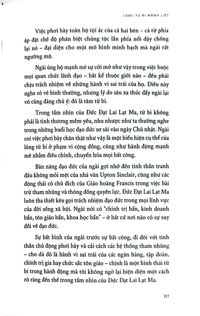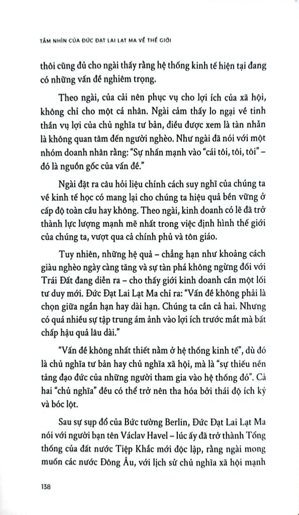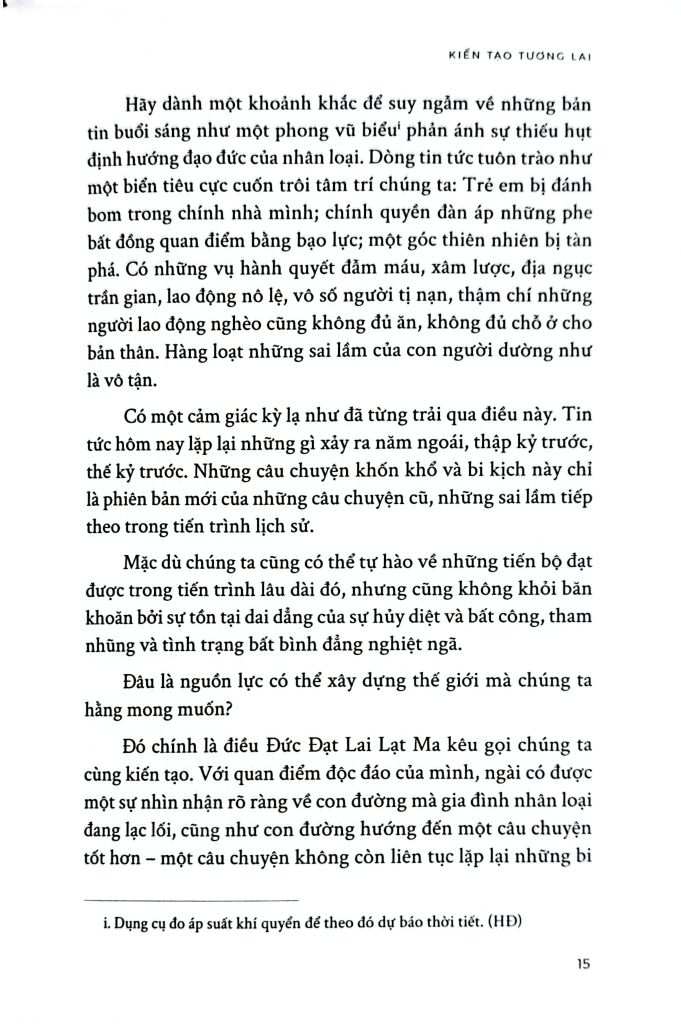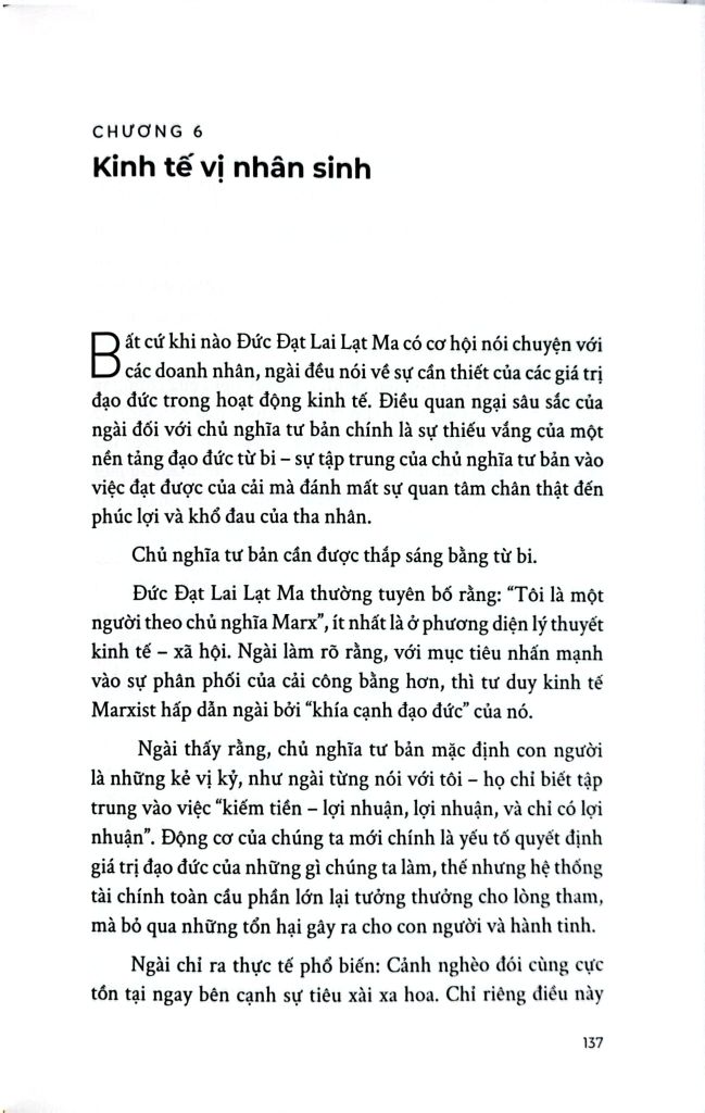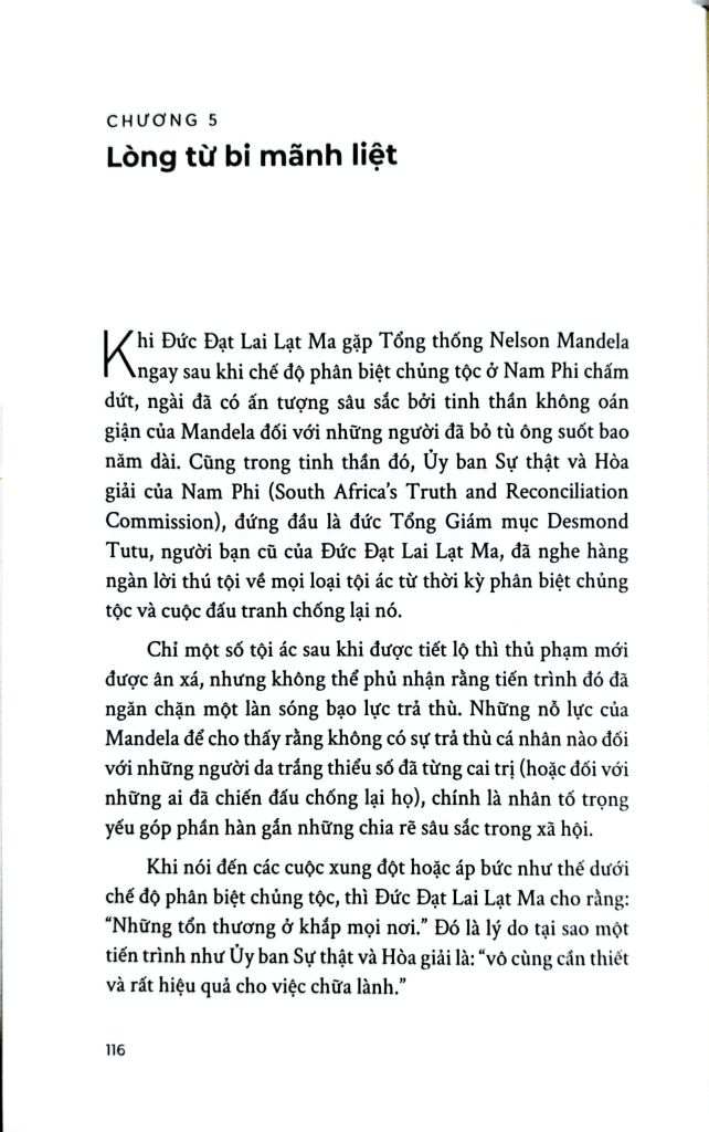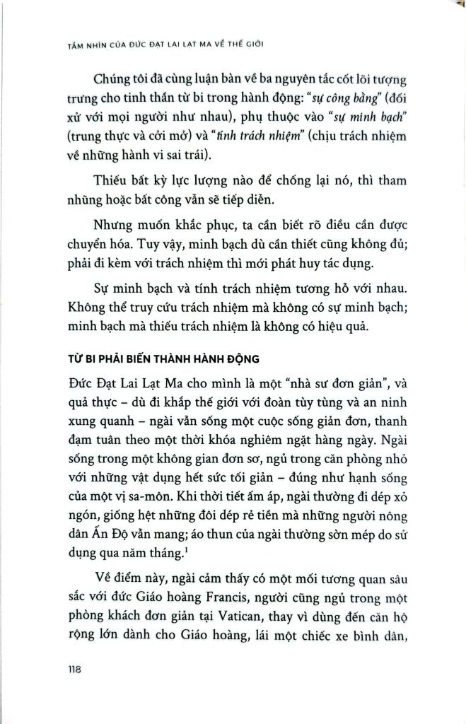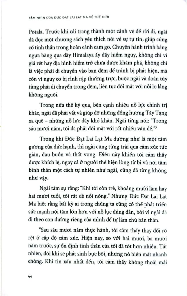 Tôi tin rằng mục tiêu về một thế giới hòa bình hơn, nơi con người sống hạnh phúc, yêu thương và hỗ trợ lẫn nhau trọn vẹn hơn là điều chúng ta có thể đạt được. Nhưng chúng ta phải xem xét mục tiêu này với tư duy rộng mở và tầm nhìn dài hạn. Sự thay đổi trong chính chúng ta và trong thế giới mà chúng ta đang sống có thể không xảy ra ngay lập tức mà cần có thời gian. Nhưng nếu chúng ta không nỗ lực thì sẽ chẳng có điều gì xảy ra. Điều quan trọng nhất mà tôi hy vọng độc giả sẽ hiểu được, đó là sự thay đổi như vậy sẽ không xảy ra nhờ vào các quyết định của chính phủ hoặc Liên Hợp Quốc. Thay đổi thực sự sẽ chỉ diễn ra khi mỗi cá nhân tự chuyển hóa chính mình dưới sự dẫn dắt của các giá trị cốt lõi trong mọi hệ thống đạo đức nhân loại, của những khám phá khoa học và của cả lẽ thường. Khi đọc cuốn sách này, mong bạn hãy nhớ rằng, với tư cách là con người được ban cho trí tuệ tuyệt vời và tiềm năng nuôi dưỡng một trái tim ấm áp, mỗi người trong chúng ta đều có thể trở thành một nguồn năng lượng thiện lành.”