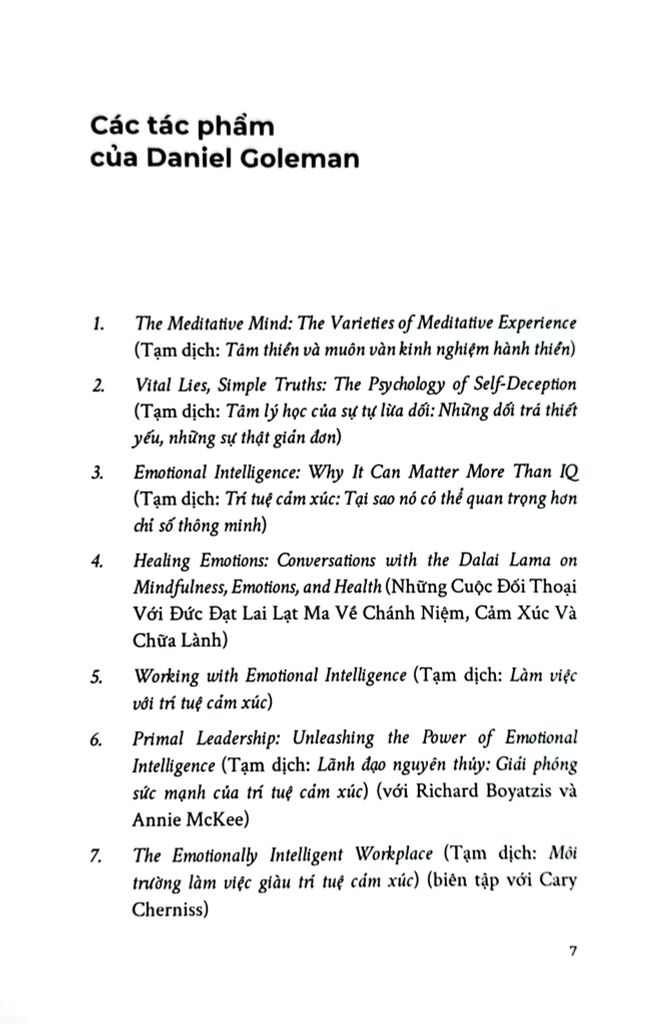 Tác giả: Daniel Goleman là tác giả cuốn Emotional Intelligence (Trí tuệ cảm xúc) – một tác phẩm xuất sắc từng giữ vị trí bestseller trên The New York Times. Ông là nhà tâm lý học kiêm phóng viên khoa học, từng phụ trách chuyên mục về não bộ và hành vi học trong nhiều năm cho The New York Times, và đã nhận được nhiều giải thưởng danh giá cho sự nghiệp cầm bút của mình. Goleman là tác giả của hơn mười hai cuốn sách, trong đó có ba tập ghi chép lại các cuộc đối thoại giữa Đức Đạt Lai Lạt Ma và giới khoa học, các nhà trị liệu tâm lý và nhà hoạt động xã hội do chính ông điều phối.