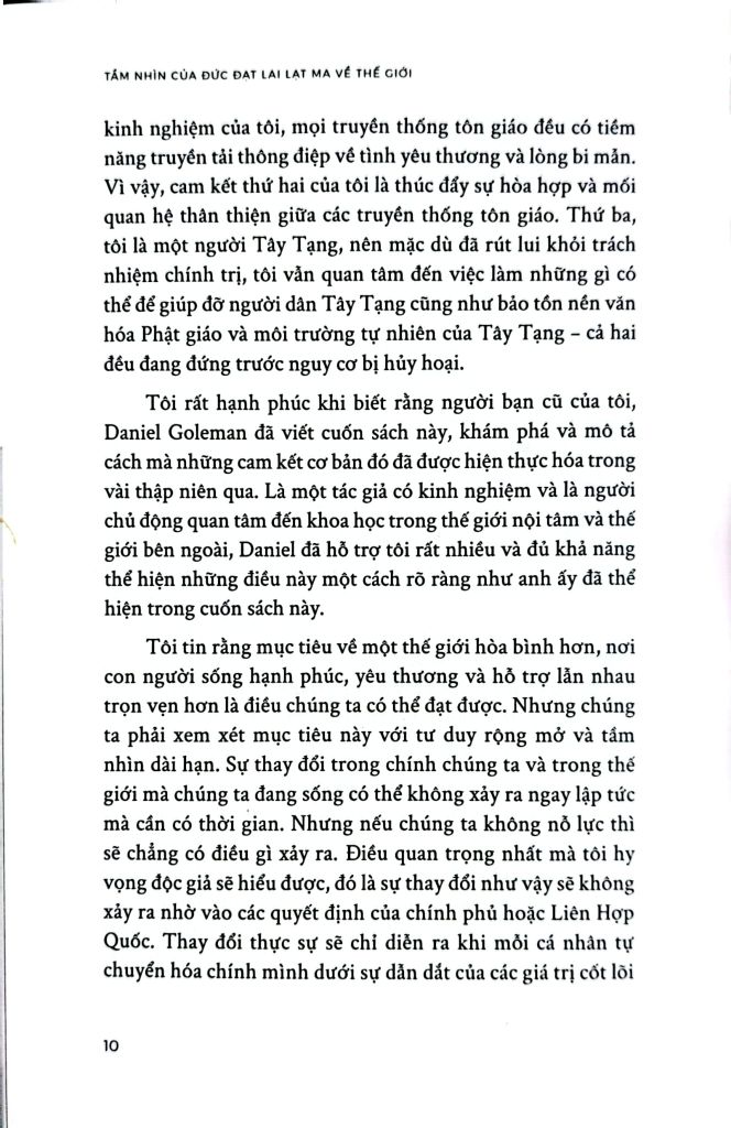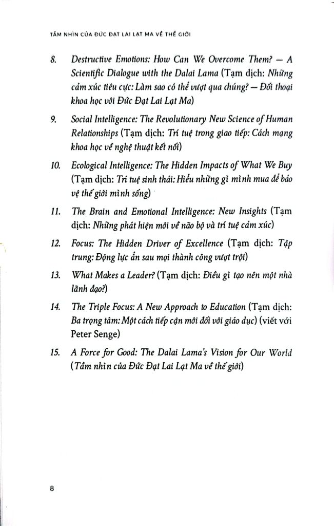 “Tầm nhìn của Đức Đạt Lai Lạt Ma về thế giới” của tác giả Daniel Goleman, cuốn sách này phần lớn dựa trên nhiều giờ phỏng vấn riêng mà Đức Đạt Lai Lạt Ma đã cho phép tác giả được sử dụng, chủ yếu ở Pomaia và Livorno, Ý, cùng một số địa điểm khác như Rochester, Minnesota và Princeton, New Jersey. Trải qua nhiều thập kỷ, thông điệp từ bi và trí tuệ của ngài không chỉ soi sáng hành trình cá nhân của Daniel Goleman, mà còn là nguồn cảm hứng quý báu mà tác giả mong muốn được lan tỏa đến đông đảo độc giả.