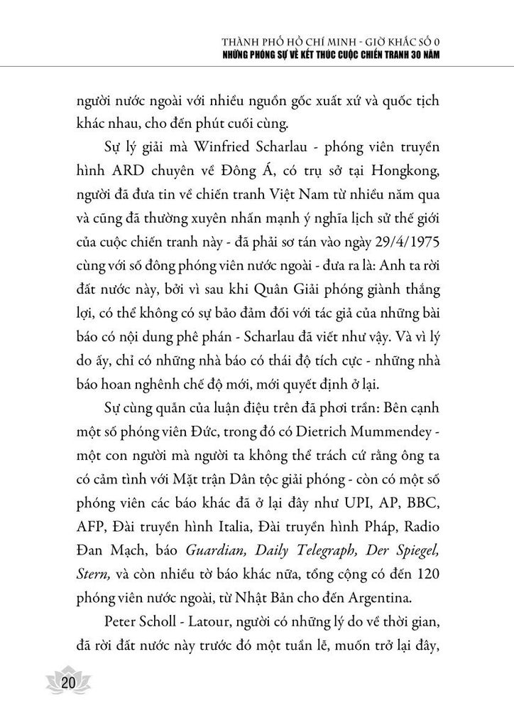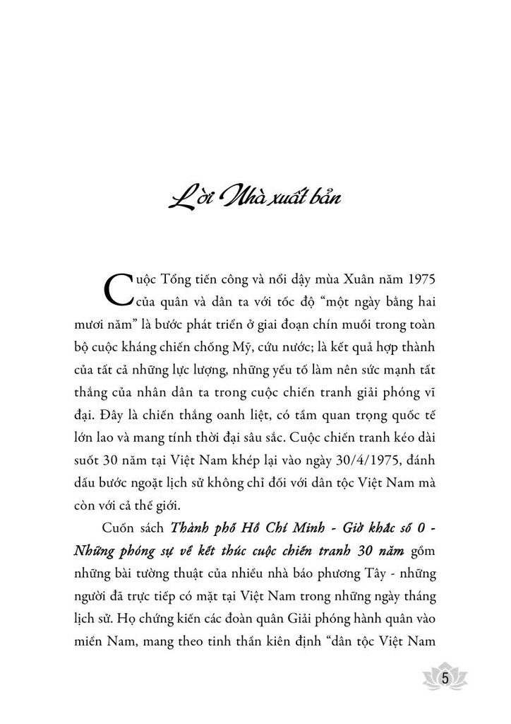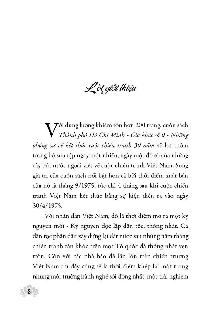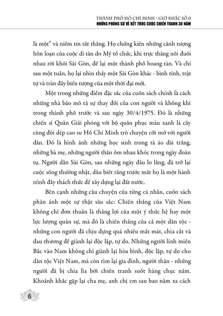 Cuốn sách “Thành phố Hồ Chí Minh - Giờ khắc số 0 - Những phóng sự về kết thúc cuộc chiến tranh 30 năm” gồm những bài tường thuật của nhiều nhà báo phương Tây - những người đã trực tiếp có mặt tại Việt Nam trong những ngày tháng lịch sử. Họ chứng kiến các đoàn quân Giải phóng hành quân vào miền Nam, mang theo tinh thần kiên định “dân tộc Việt Nam là một” và niềm tin tất thắng. Họ chứng kiến những cảnh tượng hỗn loạn của cuộc di tản do Mỹ tổ chức, khi trực thăng nối đuôi nhau rời khỏi Sài Gòn, để lại một thành phố hoang tàn. Và chỉ sau một tuần, họ lại nhìn thấy một Sài Gòn khác - bình tĩnh, trật tự và tràn đầy biểu tượng của một thời đại mới.