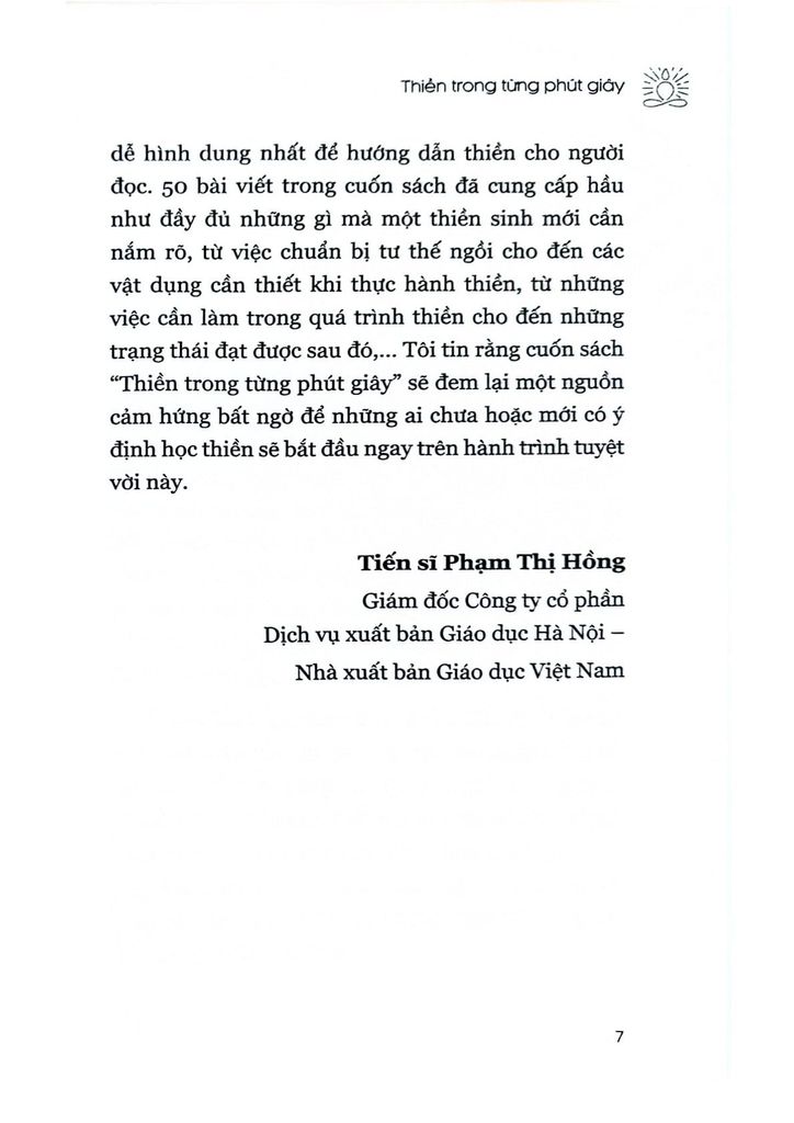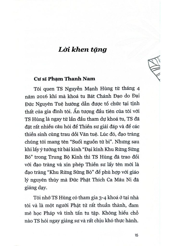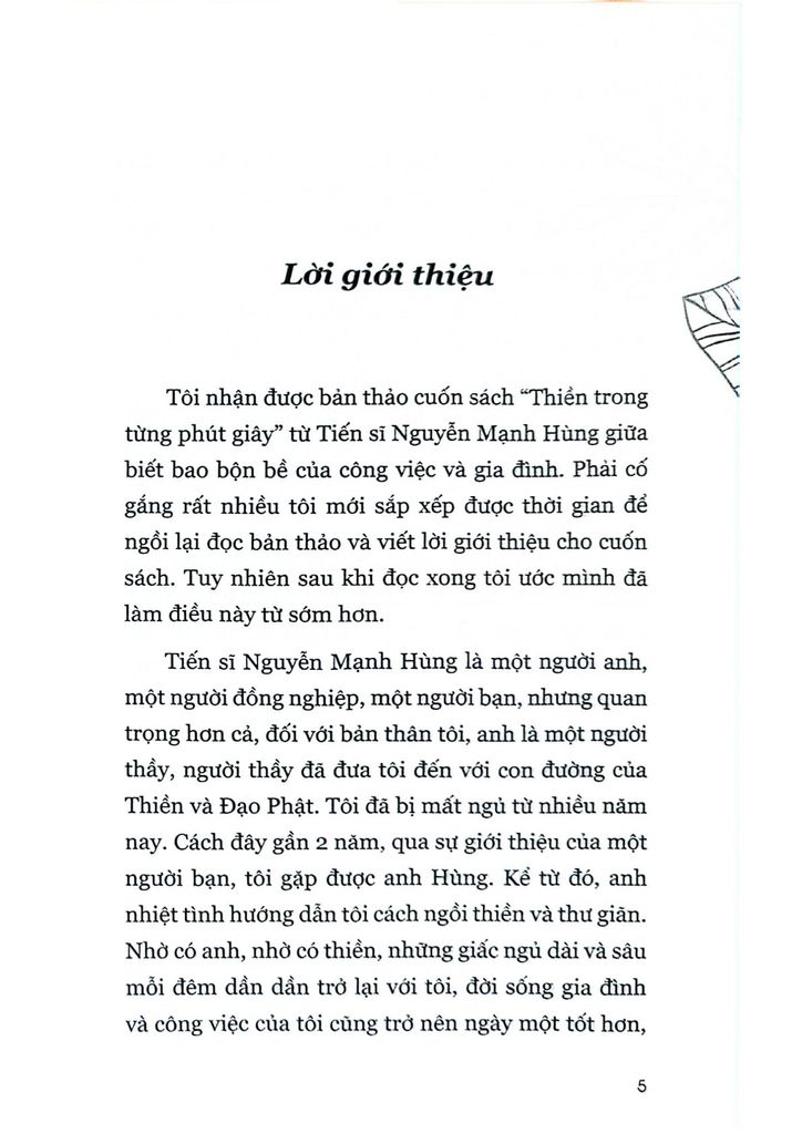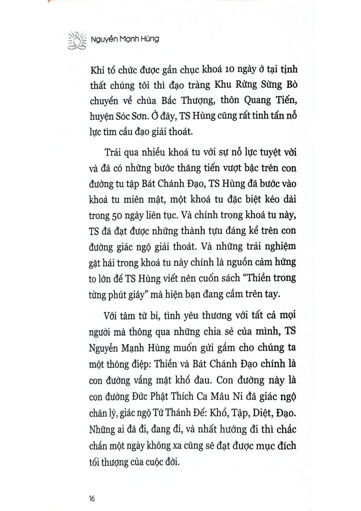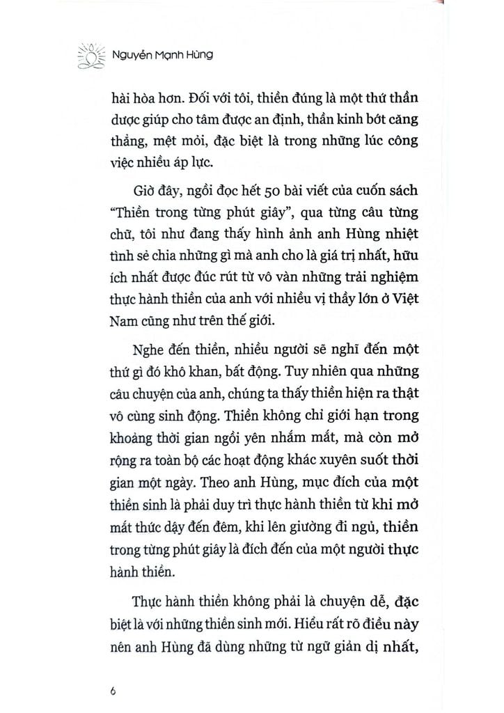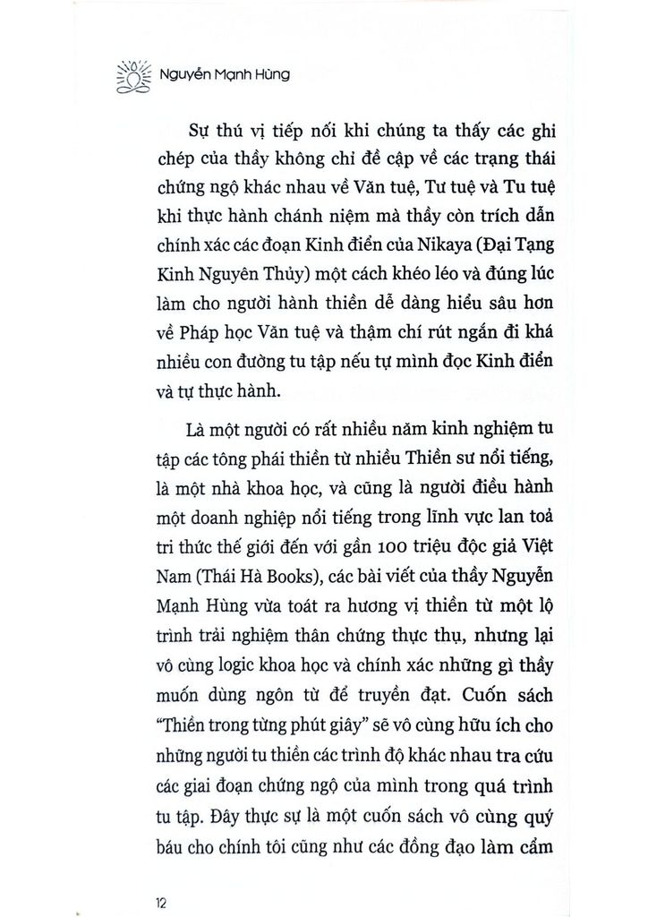 Là một người có rất nhiều năm kinh nghiệm tu tập các tông phái thiền từ nhiều Thiền sư nổi tiếng, là một nhà khoa học, và cũng là người điều hành một doanh nghiệp nổi tiếng trong lĩnh vực lan toả tri thức thế giới đến với gần 100 triệu độc giả Việt Nam (Thái Hà Books), các bài viết của thầy Nguyễn Mạnh Hùng vừa toát ra hương vị thiền từ một lộ trình trải nghiệm thân chứng thực thụ, nhưng lại vô cùng logic khoa học và chính xác những gì thầy muốn dùng ngôn từ để truyền đạt. Cuốn sách “Thiền trong từng phút giây” sẽ vô cùng hữu ích cho những người tu thiền các trình độ khác nhau tra cứu các giai đoạn chứng ngộ của mình trong quá trình tu tập. Đây thực sự là một cuốn sách vô cùng quý báu cho chính tôi cũng như các đồng đạo làm cẩm nang gối đầu giường để dẫn chúng ta đi theo Thầy trên con đường Chánh niệm và tiến tới Đạo quả giải thoát cuối cùng như Đức Phật đã trải qua từ 2600 năm trước.