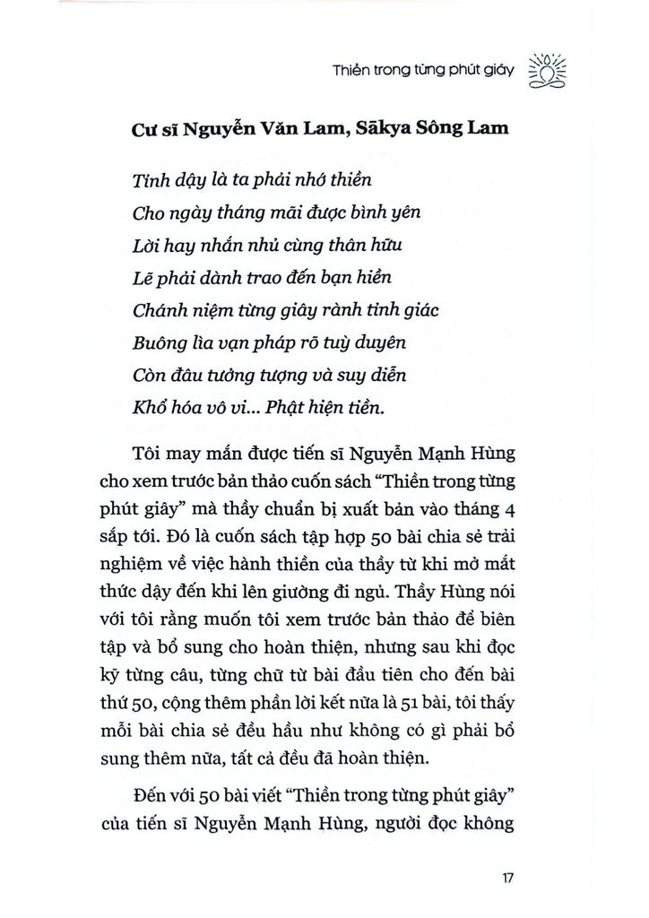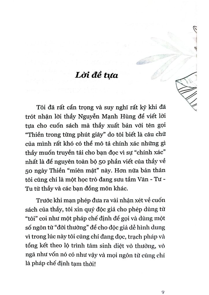 Tôi đã rất cẩn trọng và suy nghĩ rất kỹ khi đã trót nhận lời thầy Nguyễn Mạnh Hùng để viết lời tựa cho cuốn sách mà thầy xuất bản với tên gọi “Thiền trong từng phút giây” do tôi biết là câu chữ của mình rất khó có thể mô tả chính xác những gì thầy muốn truyền tải cho bạn đọc vì sự “chính xác” nhất là để nguyên toàn bộ 50 phần viết của thầy về 50 ngày Thiền “miên mật” này. Hơn nữa bản thân tôi cũng chỉ là một học trò đang sưu tầm Văn - Tư - Tu từ thầy và các bạn đồng môn khác.