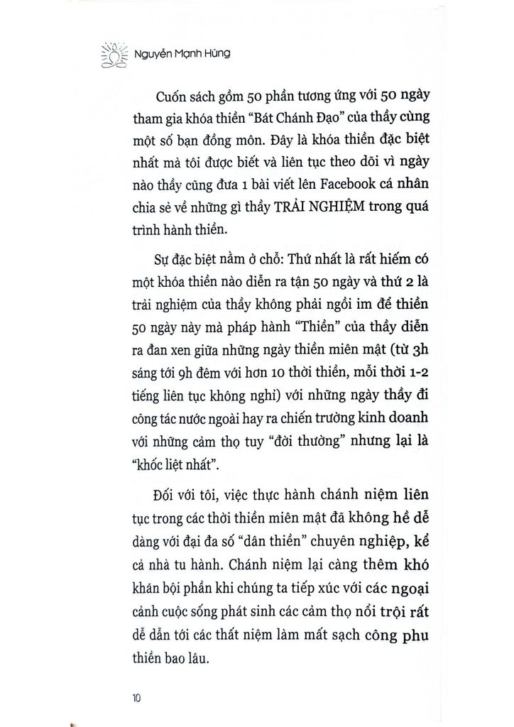 Cuốn sách gồm 50 phần tương ứng với 50 ngày tham gia khóa thiền “Bát Chánh Đạo” của thầy cùng một số bạn đồng môn. Đây là khóa thiền đặc biệt nhất mà tôi được biết và liên tục theo dõi vì ngày nào thầy cũng đưa 1 bài viết lên Facebook cá nhân chia sẻ về những gì thầy TRẢI NGHIỆM trong quá trình hành thiền. Sự đặc biệt nằm ở chỗ: Thứ nhất là rất hiếm có một khóa thiền nào diễn ra tận 50 ngày và thứ 2 là trải nghiệm của thầy không phải ngồi im để thiền 50 ngày này mà pháp hành “Thiền” của thầy diễn ra đan xen giữa những ngày thiền miên mật (từ 3h sáng tới 9h đêm với hơn 10 thời thiền, mỗi thời 1-2 tiếng liên tục không nghỉ) với những ngày thầy đi công tác nước ngoài hay ra chiến trường kinh doanh với những cảm thọ tuy “đời thường” nhưng lại là “khốc liệt nhất”.