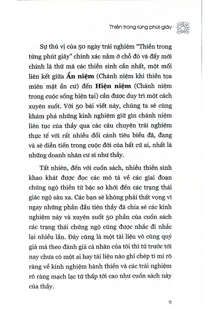 Sự thú vị của 50 ngày trải nghiệm “Thiền trong từng phút giây” chính xác nằm ở chỗ đó và đấy mới chính là thứ mà các thiền sinh cần nhất, một mối liên kết giữa Ẩn niệm (Chánh niệm khi thiền tọa miên mật ẩn cư) đến Hiện niệm (Chánh niệm trong cuộc sống hiện tại) cần được duy trì một cách xuyên suốt. Với 50 bài viết này, chúng ta sẽ cùng khám phá những kinh nghiệm giữ gìn chánh niệm liên tục của thầy qua các câu chuyện trải nghiệm thực tế với rất nhiều đổi cảnh tiêu biểu đã, đang và sẽ diễn tiến trong cuộc đời của bất cứ ai, nhất là những doanh nhân cư sĩ như thầy.