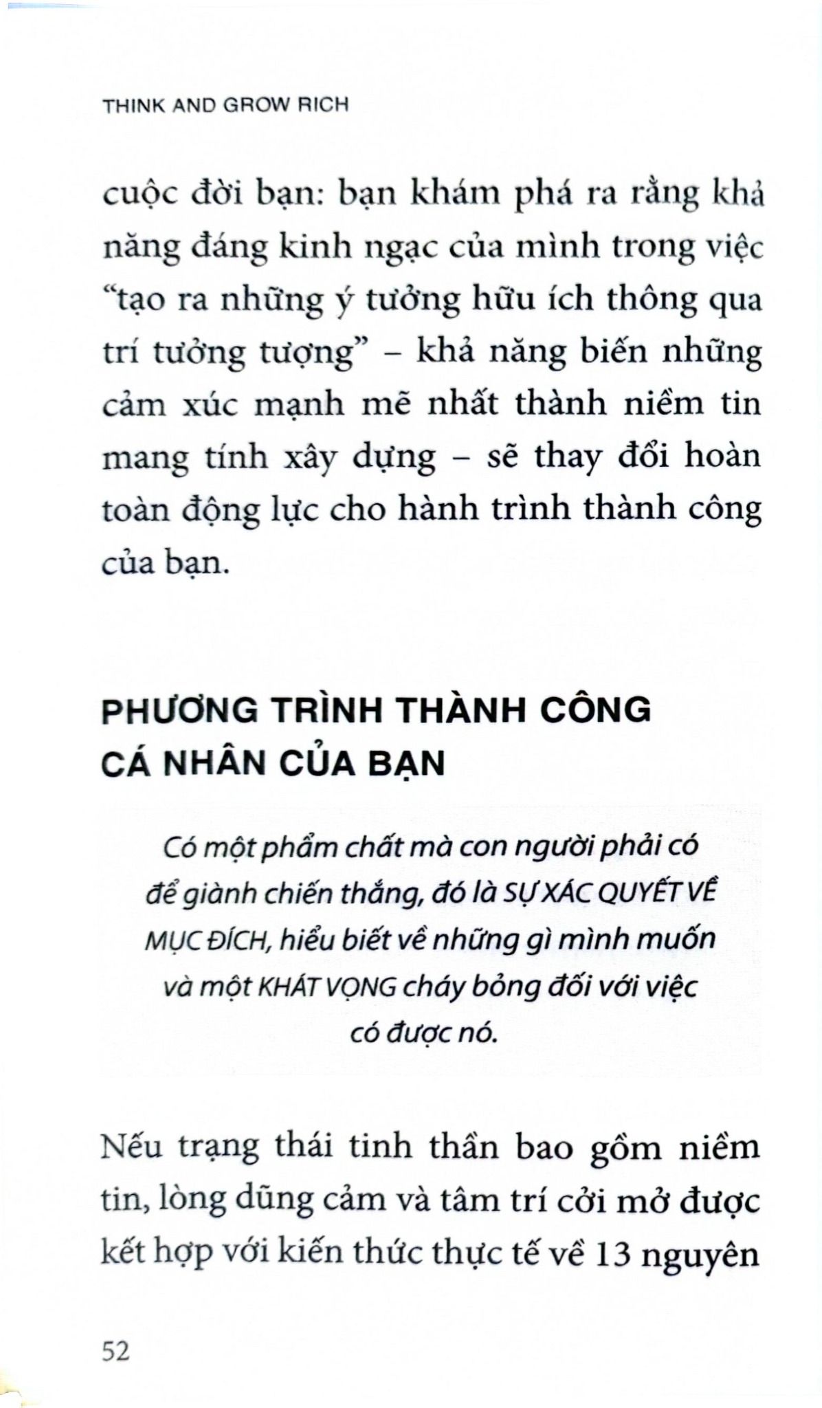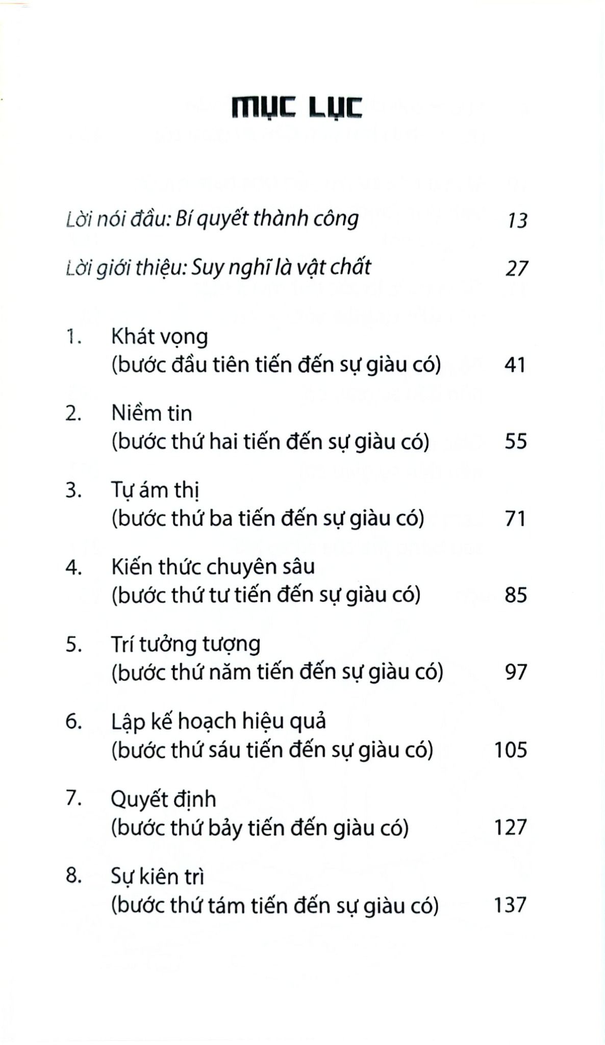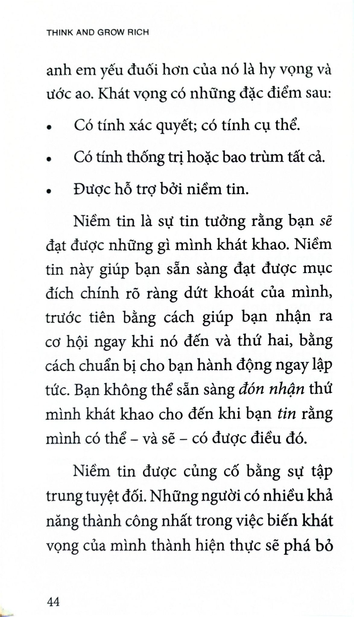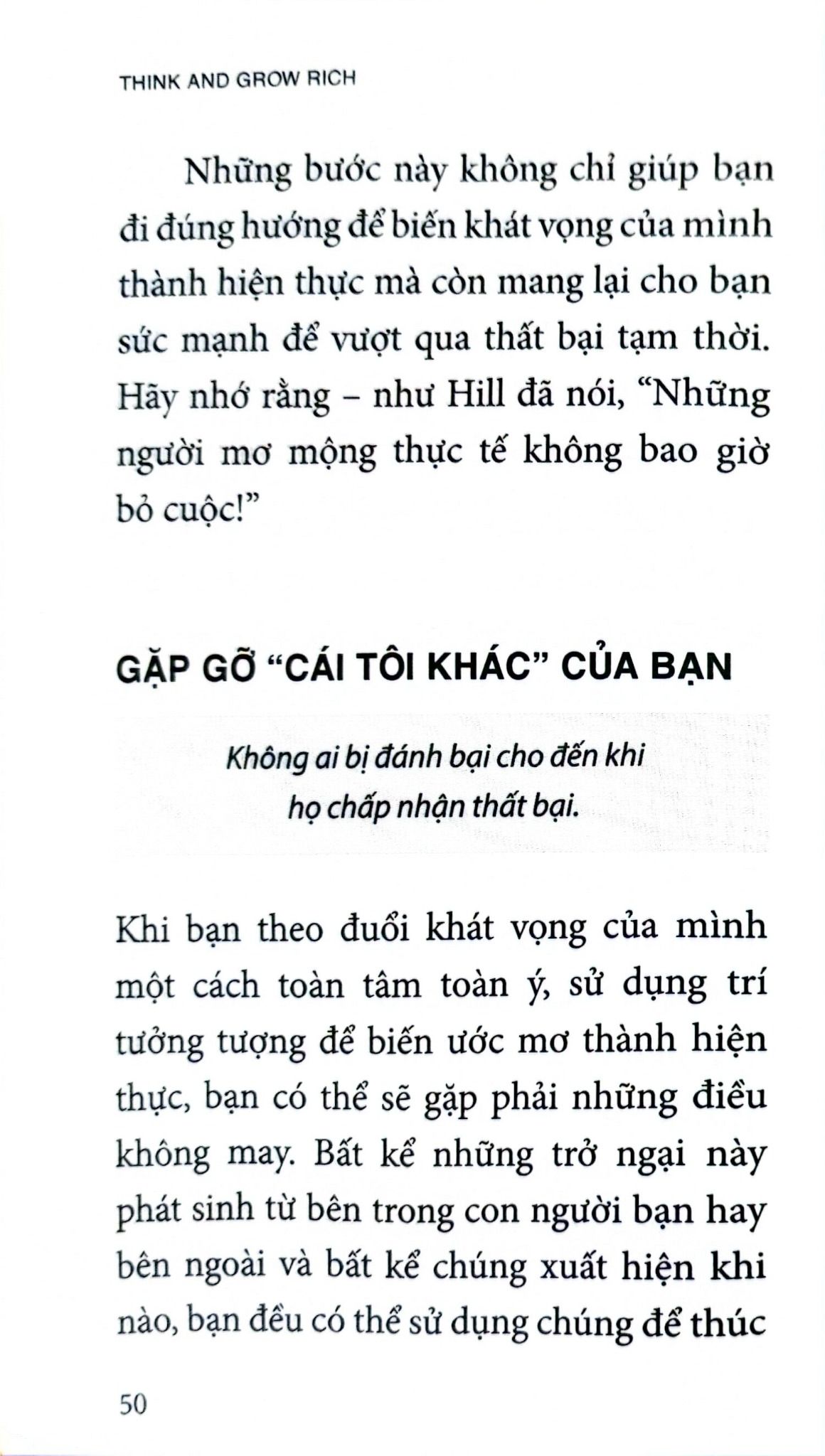 Think and Grow Rich không phải là cuốn sách bạn đọc một lần rồi đặt sang một bên. Đây là cuốn sách bạn đọc đi đọc lại tuần này qua tuần khác, tháng này qua tháng khác, năm này qua năm khác để nâng cao ý thức về thành công và tối đa hóa khả năng biến mục tiêu chính rõ ràng dứt khoát của mình thành hiện thực. Những doanh nhân vĩ đại nhất thế giới sẽ cho bạn biết rằng họ nghiền ngẫm lại các nguyên tắc trong cuốn sách của Hill ít nhất một lần mỗi năm để đảm bảo các ý tưởng luôn mới mẻ trong tâm trí họ.