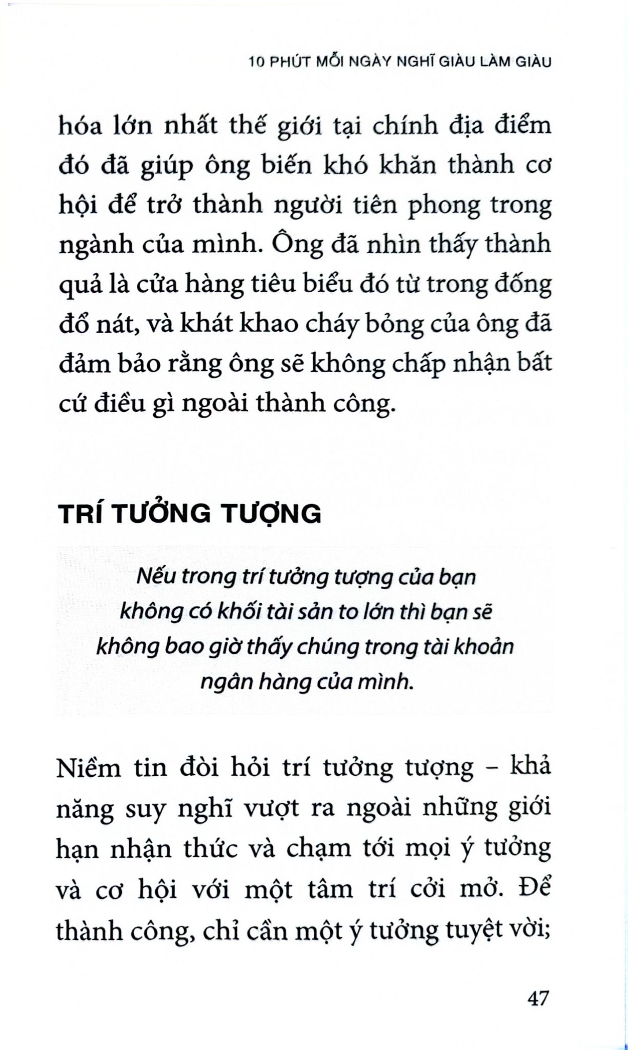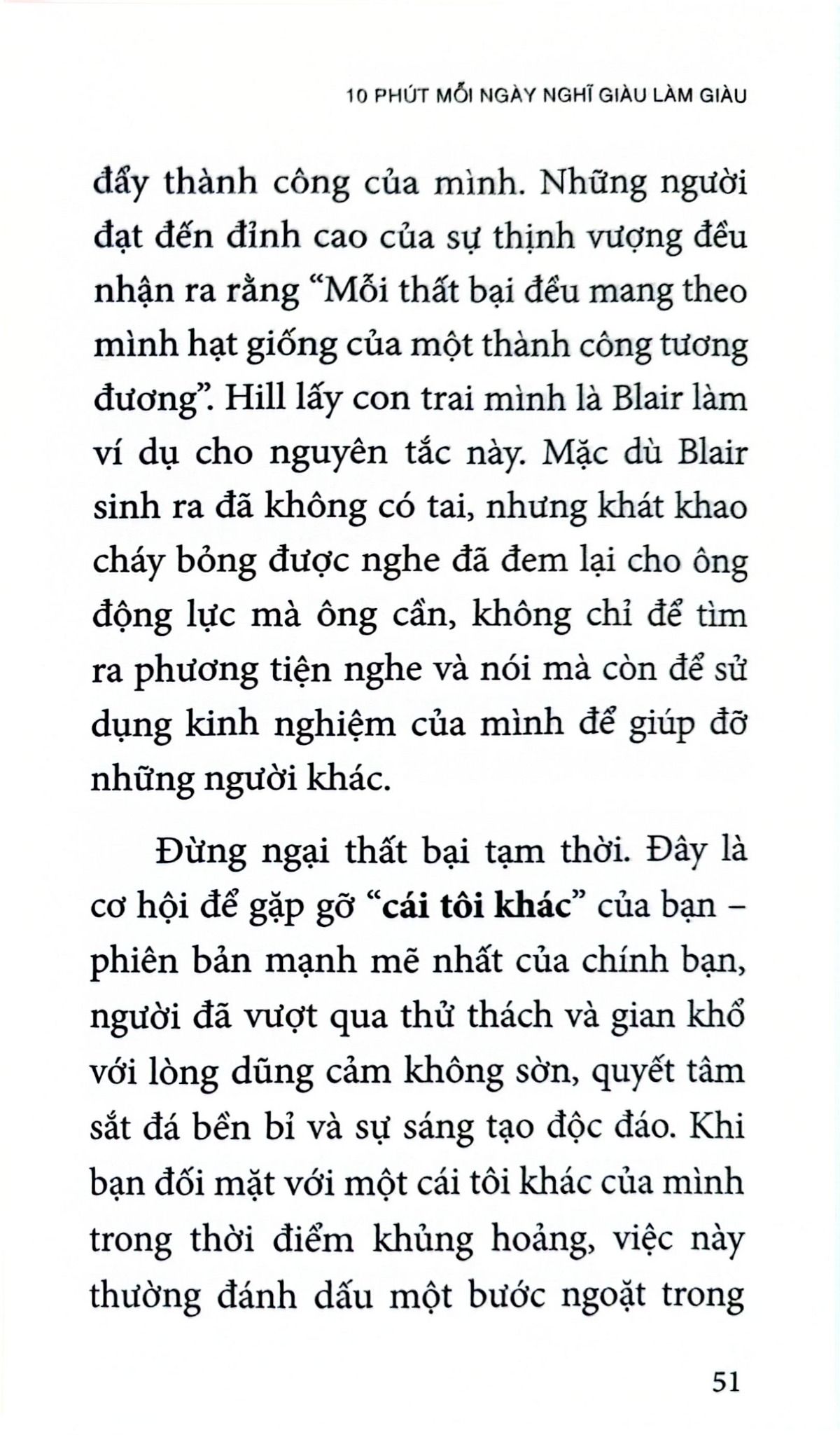 Cuốn sách Think and Grow Rich - 10 phút mỗi ngày nghĩ giàu làm giàu sẽ giúp bạn tìm hiểu và đưa vào thực hành một cách nhanh chóng, hiệu quả chương trình phát triển cá nhân tuyệt vời nhất mọi thời đại. Cuốn sách chọn lọc các nguyên tắc, hướng dẫn và câu chuyện quan trọng từ kiệt tác Think and Grow Rich của Napoleon Hill và trình bày chúng với ngôn ngữ hiện đại, dễ hiểu. Chỉ với 10 phút mỗi ngày, bạn có thể bắt đầu làm chủ hệ thống thành công đã tạo nên những triệu phú và người có sức ảnh hưởng hàng đầu nhiều hơn bất kỳ chương trình xây dựng thành tựu nào khác.