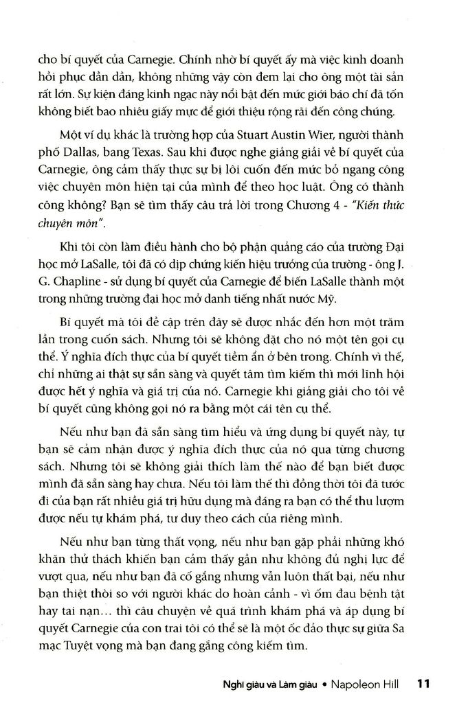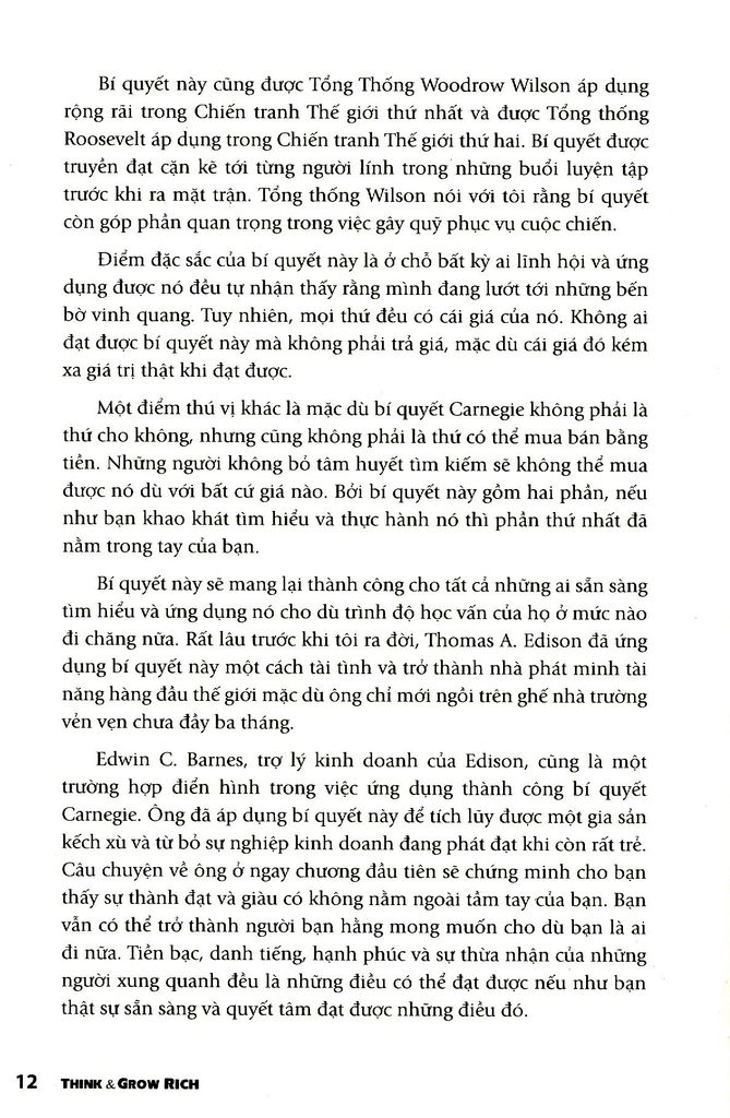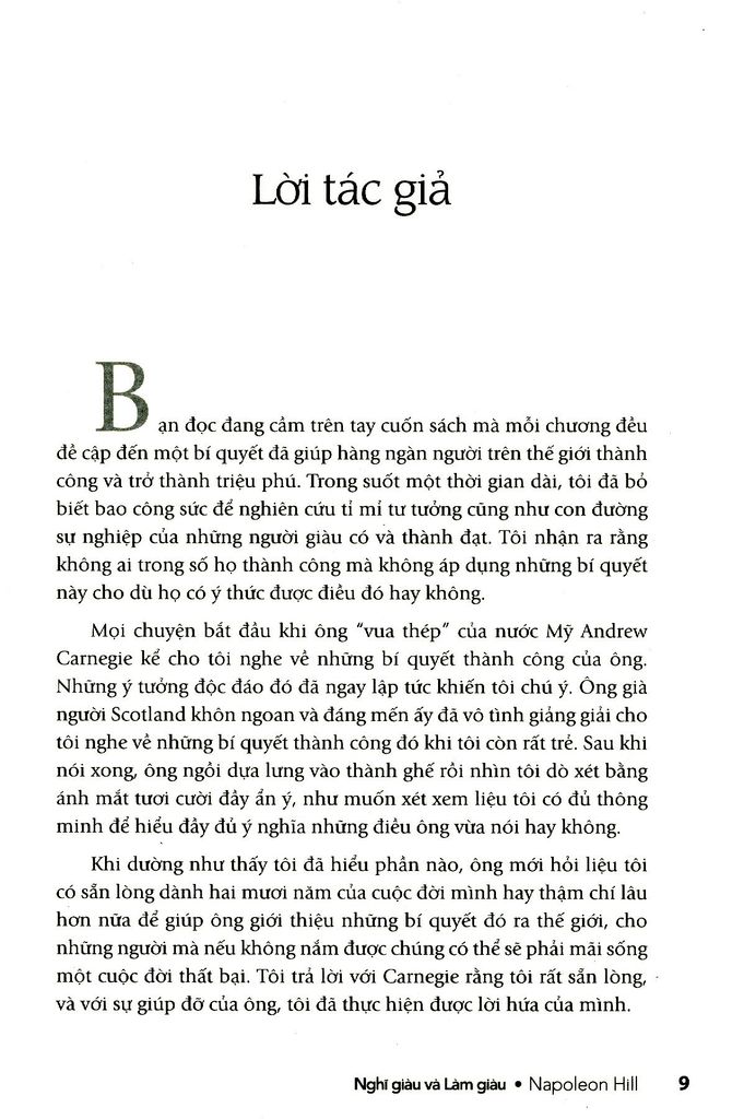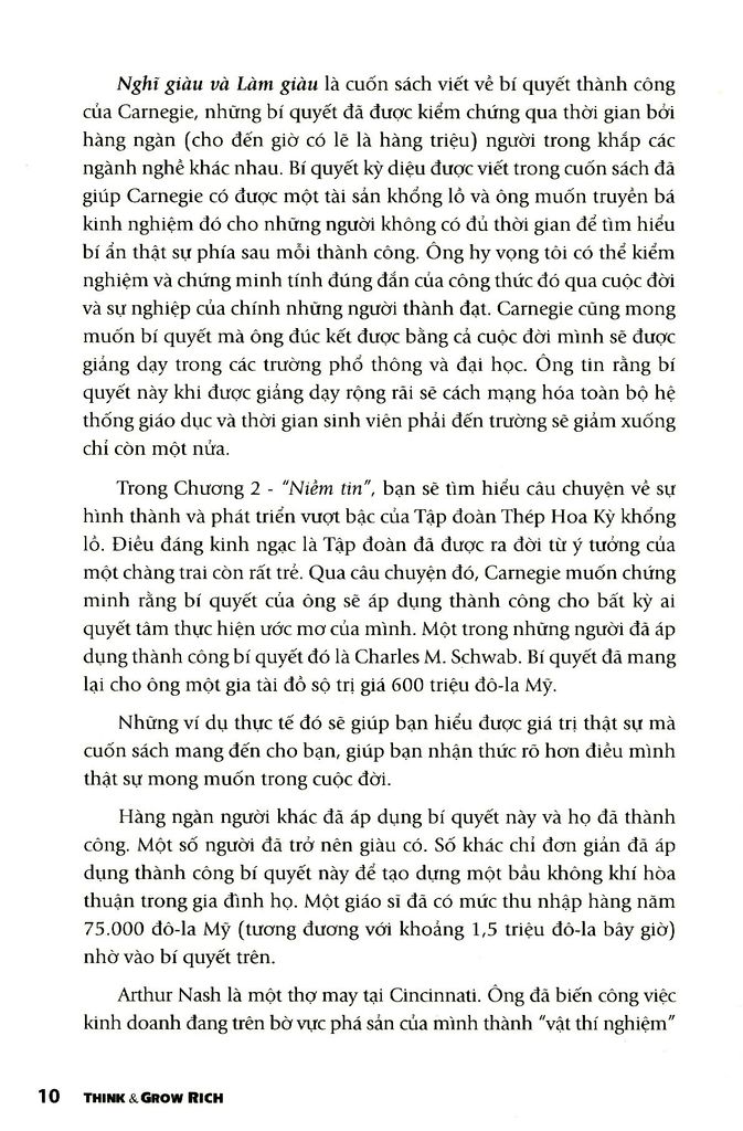 Điều thú vị nhất là các bí quyết này có thể được hiểu và áp dụng bởi bất kỳ một người bình thường nào, hoạt động trong bất cứ lĩnh vực nào. Qua hơn 70 năm tồn tại, những đúc kết về thành công của Napoleon Hill đến nay vẫn không hề bị lỗi thời, ngược lại, thời gian chính là minh chứng sống động cho tính đúng đắn của những bí quyết mà ông chia sẻ. Sinh ra trong một gia đình nghèo vùng Tây Virginia, con đường thành công của Napoleon Hill cũng trải qua nhiều thăng trầm. Khởi đầu bằng chân cộng tác viên cho một tờ báo địa phương lúc 15 tuổi, đến năm 19 tuổi Hill trở thành nhà quản lý mỏ than trẻ tuổi nhất, sau đó bỏ ngang để theo đuổi ngành luật. Napoleon Hill còn kinh qua nhiều nghề như kinh doanh gỗ, xe hơi, viết báo về kinh doanh… Đó là những công việc ông từng nếm trải trước khi 25 tuổi! Song khác với những người thành đạt khác, ông cẩn thận phân tích từng sự kiện trọng đại trong đời mình, rút ra những bài học, rồi tiếp tục rút gọn chúng thành các nguyên tắc căn bản, tổ chức các nguyên tắc ấy thành triết lý sống và rèn luyện...