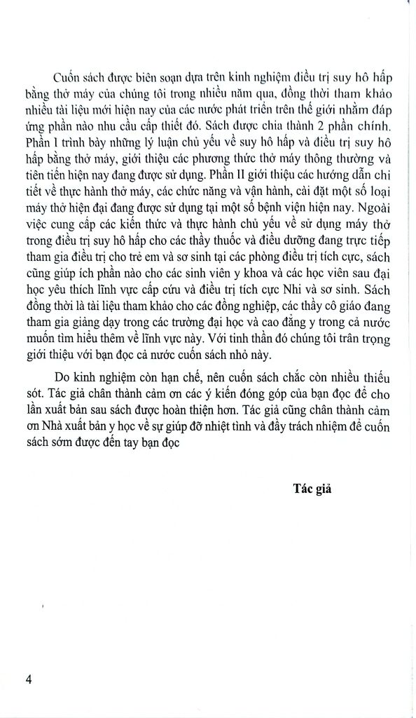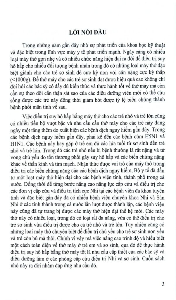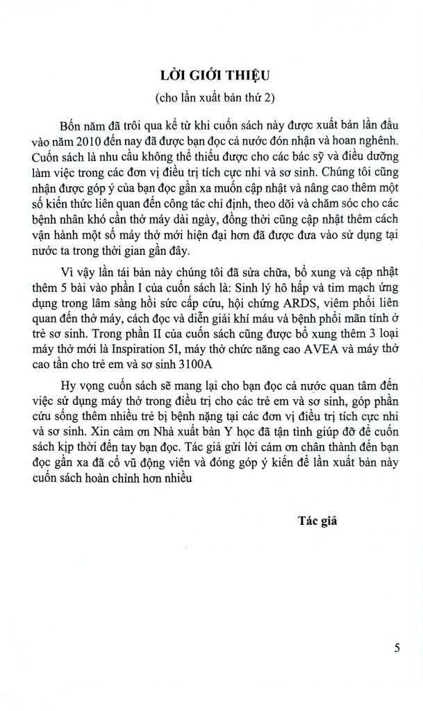 Cuốn sách sẽ phần nào đáp ứng mong muốn muốn cập nhật và nâng cao thêm một số kiến thức liên quan đến công tác chỉ định, theo dõi và chăm sóc cho các bệnh nhân khó cần thở máy dài ngày, đồng thời cũng cập nhật thêm cách vận hành một số máy thở mới hiện đại hơn đã được đưa vào sử dụng tại nước ta trong thời gian gần đây.