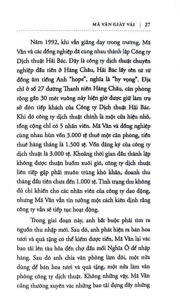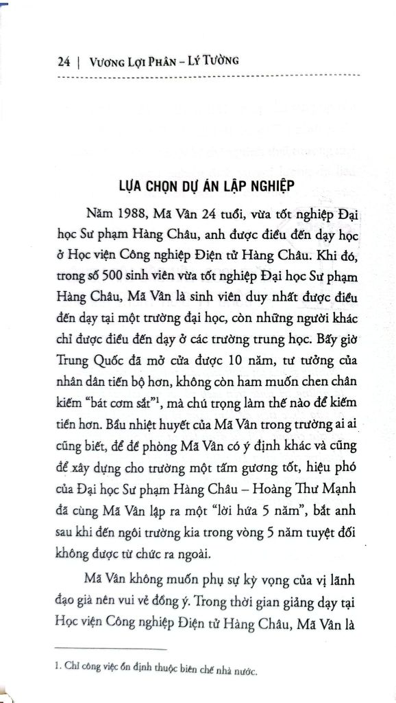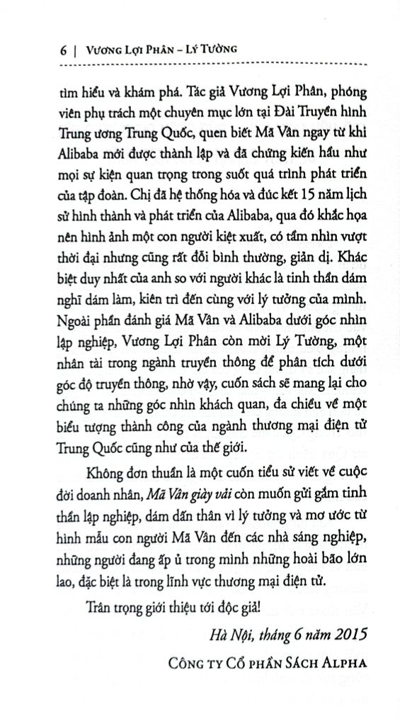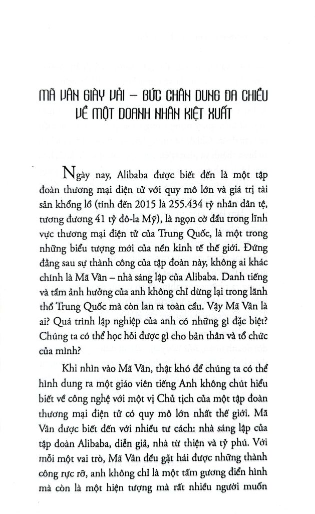 Ngày nay, ALIBABA là một tập đoàn thương mại điện tử toàn cầu với quy mô và giá trị tài sản khổng lồ (tính đến 2015 là 255.434 tỷ nhân dân tệ, tương đương 41 tỷ đô-la Mỹ), là ngọn cờ đầu trong lĩnh vực thương mại điện tử của Trung Quốc, một trong những biểu tượng mới của nền kinh tế thế giới. Đứng sau sự thành công của tập đoàn này không ai khác chính là Mã Vân - nhà sáng lập của Alibaba. Tuy nhiên, thật khó để chúng ta hình dung ra con đường nào để Mã Vân từ một giáo viên tiếng Anh không chút hiểu biết về công nghệ, trở thành vị Chủ tịch của một tập đoàn thương mại điện tử lớn nhất toàn cầu. Mã Vân được biết đến với nhiều tư cách: Nhà sáng lập, diễn giản, nhà từ thiện và tỷ phú. Với mỗi vai trò, Mã Vân đều gặp hái được những thành công rực rỡ, anh không chỉ là tấm gương điển hình mà hơn thế, anh còn là một hiện tượng rất nhiều người muốn tìm hiểu và khám phá.