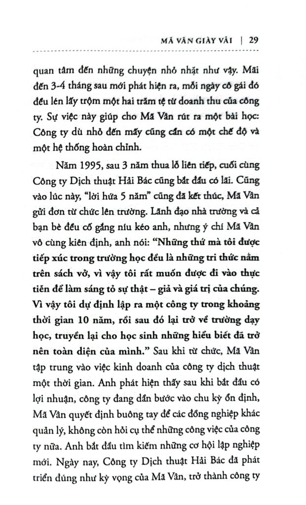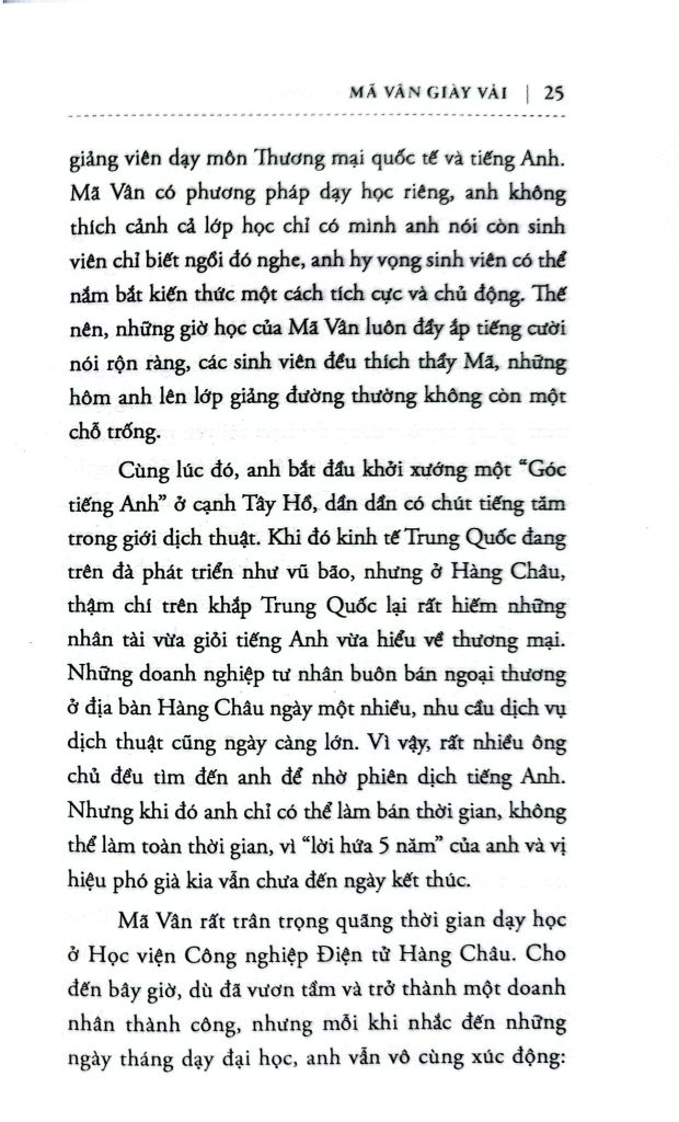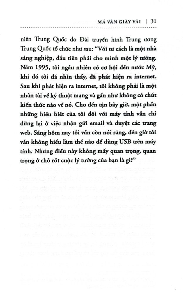 Trong cuốn sách Mã Vân giày vải này, độc giả cũng sẽ được hiểu sâu hơn về kinh nghiệm khởi nghiệp của Mã Vân, tìm được câu trả lời cho nhân tố nào khiến doanh nghiệp tồn tại và những tố chất cần có của một người lãnh đạo. Đồng thời, bạn đọc cũng sẽ hiểu được vai trò to lớn của Internet trong kinh doanh của các công ty, tại sao Mã Vân lại nhìn ra được vai trò quan trọng của Internet để phục vụ cho mục tiêu tạo ra lợi nhuận cho mình.