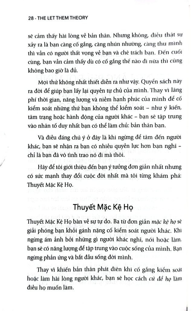 "Thuyết Mặc Kệ Họ" là lời mời gọi bạn thay đổi tư duy, lấy lại quyền tự chủ và kiến tạo một cuộc sống tự do, hạnh phúc. Đây là cẩm nang thiết yếu cho bất kỳ ai đang kát khao thoát khỏi những ràng buộc vô hình và sống một cuộc đời trọn vẹn theo cách riêng của mình.