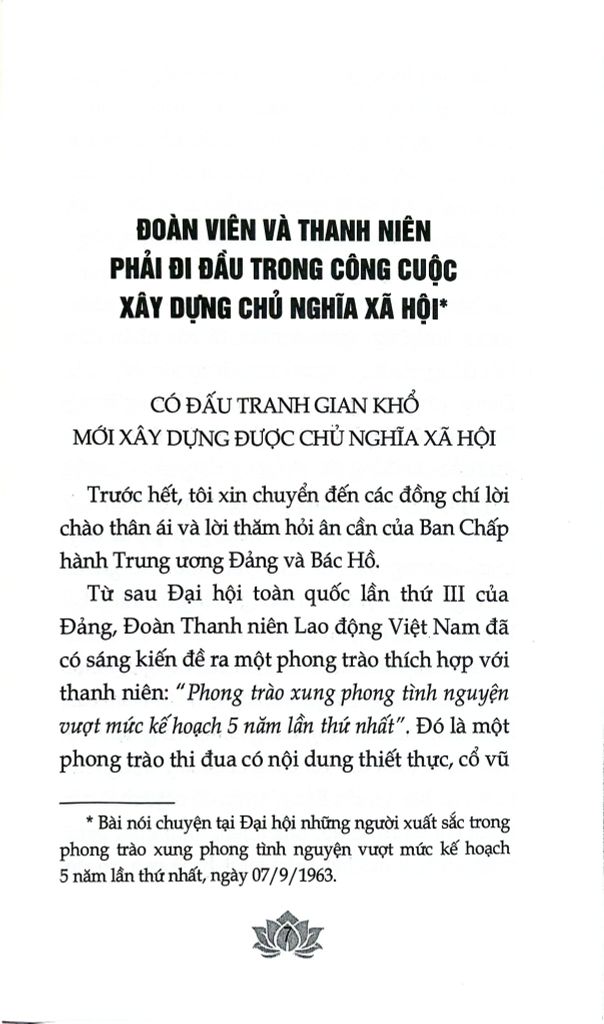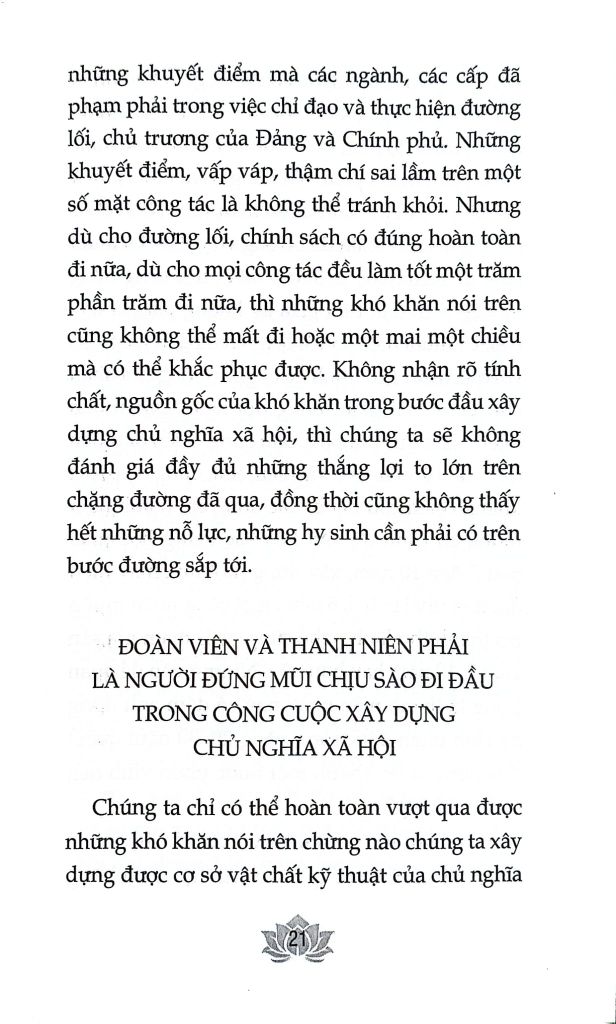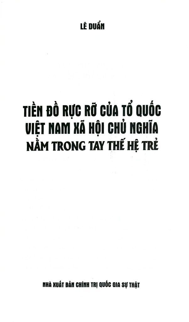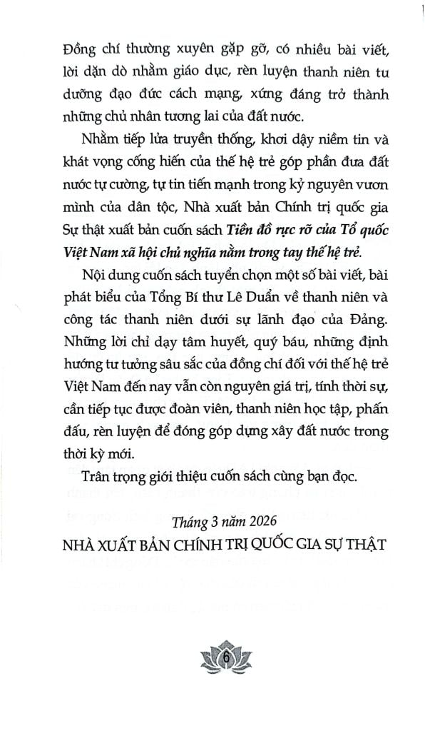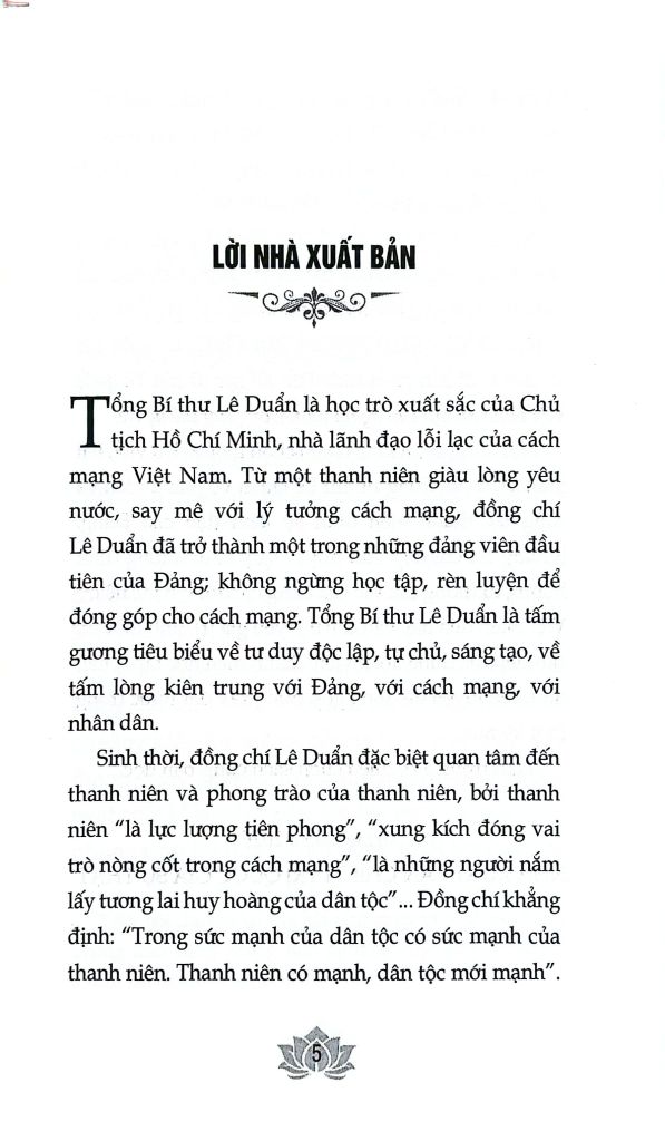 Nội dung cuốn sách tuyển chọn một số bài viết, bài phát biểu của Tổng Bí thư Lê Duẩn về thanh niên và công tác thanh niên dưới sự lãnh đạo của Đảng. Những lời chỉ dạy tâm huyết, quý báu, những định hướng tư tưởng sâu sắc của đồng chí dối với thế hệ trẻ Việt Nam đến nay vẫn còn nguyên giá trị, tính thời sự, cần tiếp tục được đoàn viên, thanh niên học tập, phấn đấu, rèn luyện để đóng góp dựng xây đất nước trong thời kỳ mới.