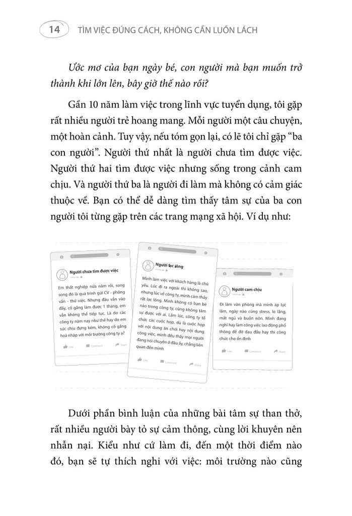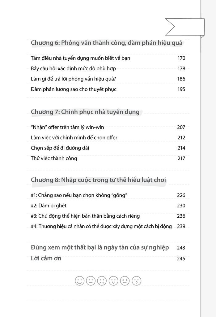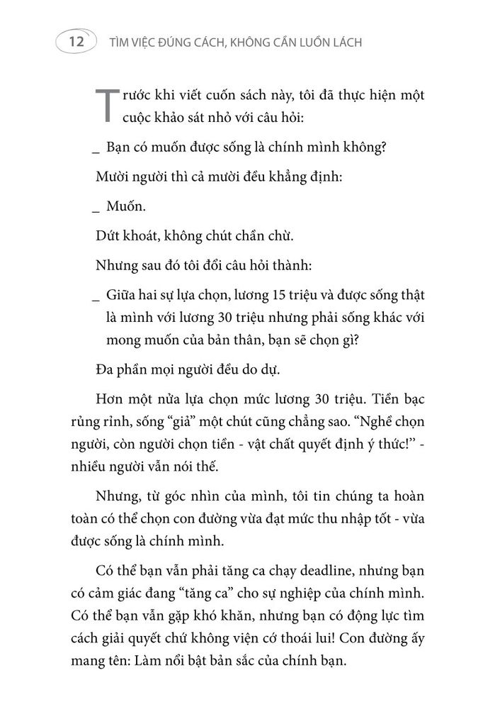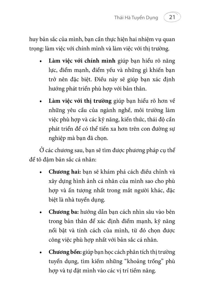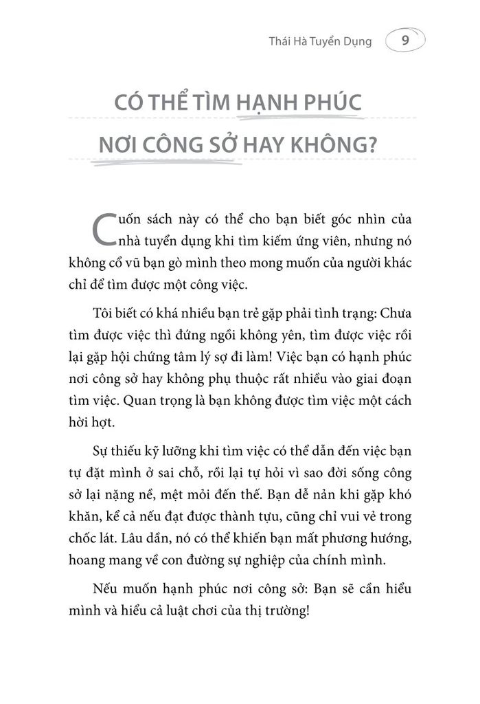 - Cuốn sách được viết dựa trên kinh nghiệm thực tế của một chuyên gia tuyển dụng có hàng trăm nghìn lượt theo dõi trên các nền tảng mạng xã hội. Sách dành cho những ai sẵn sàng nỗ lực phát triển bản thân, để vừa có thể thành công trong công việc, vừa đạt được trạng thái hạnh phúc, vui vẻ.