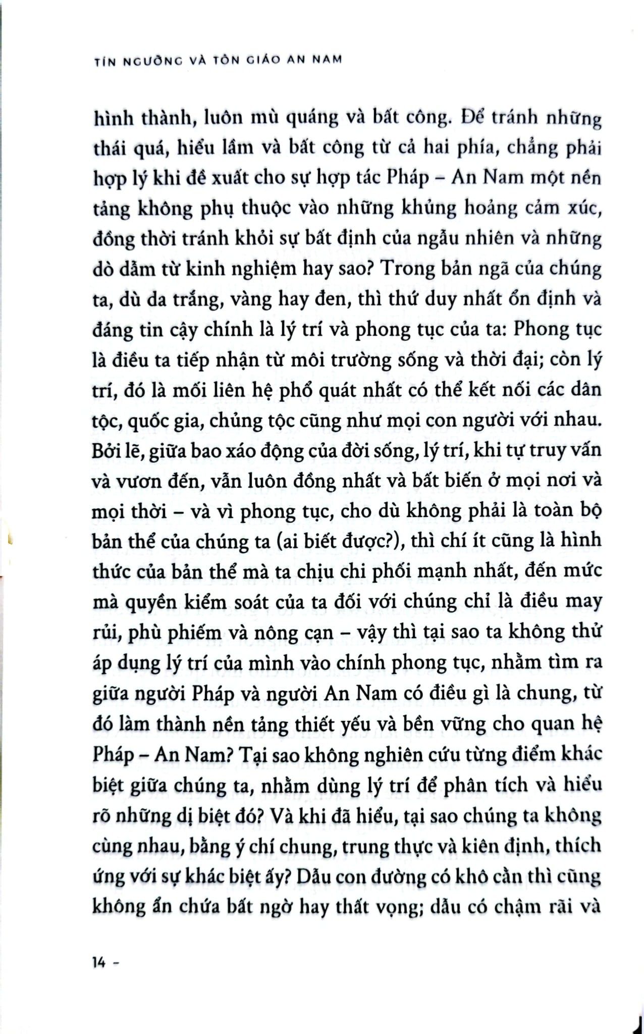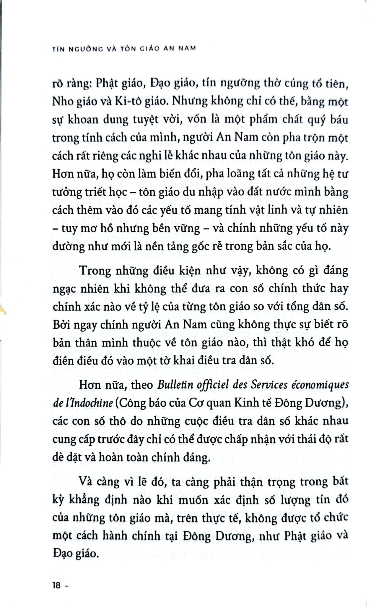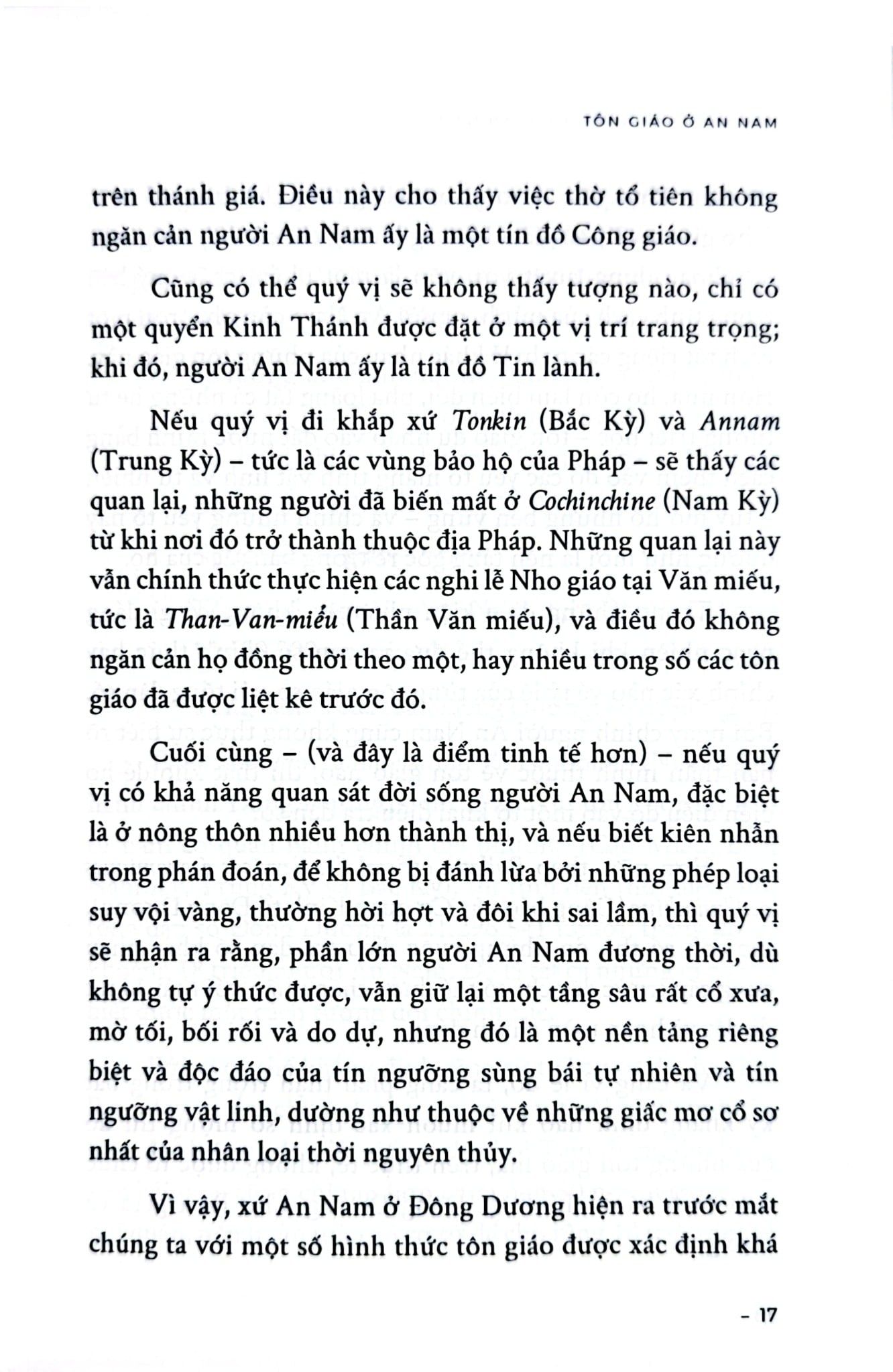 “Trong 20 thế kỷ, họ tiếp nhận bốn học thuyết triết học - tôn giáo: Đức Phật, Lão Tử, Khổng Tử và Chúa Ki-tô. Nếu Ki-tô giáo hoạt động bằng cách chiêu mộ cá nhân và lan tỏa dần dần, thì Phật giáo, Đạo giáo và Khổng giáo lại lan rộng thành từng lớp sóng lớn. Chúng không chồng chất lên nhau. Chúng cũng không hòa trộn để hình thành một tổng hợp mới và đặc thù. Khổng Tử đem đến cho tâm hồn An Nam nền tảng triết học, và học thuyết của ông được tiếp nhận hoàn toàn trong những khía cạnh mà người An Nam biết đến; bản thân Khổng giáo không có siêu hình học, nên nó không loại trừ bất cứ hệ thống tôn giáo giáo điều nào. Vì vậy, bất kỳ tôn giáo nào cũng có thể bổ sung cho nó, và chính cái bổ sung siêu hình ấy, nếu muốn gọi như vậy, là điều mà Phật giáo và Đạo giáo đã cống hiến cho tâm hồn An Nam.”