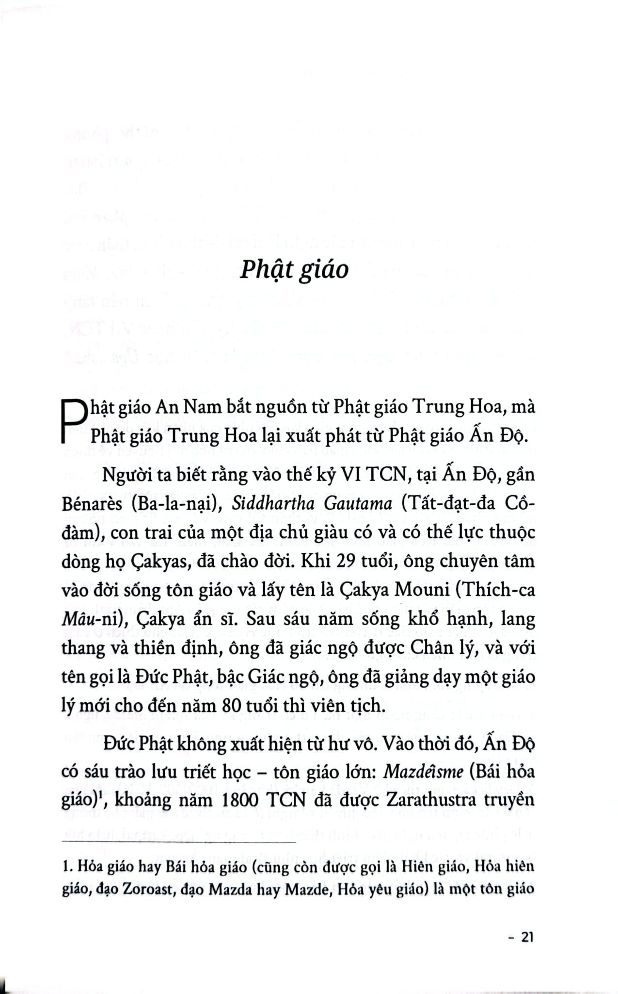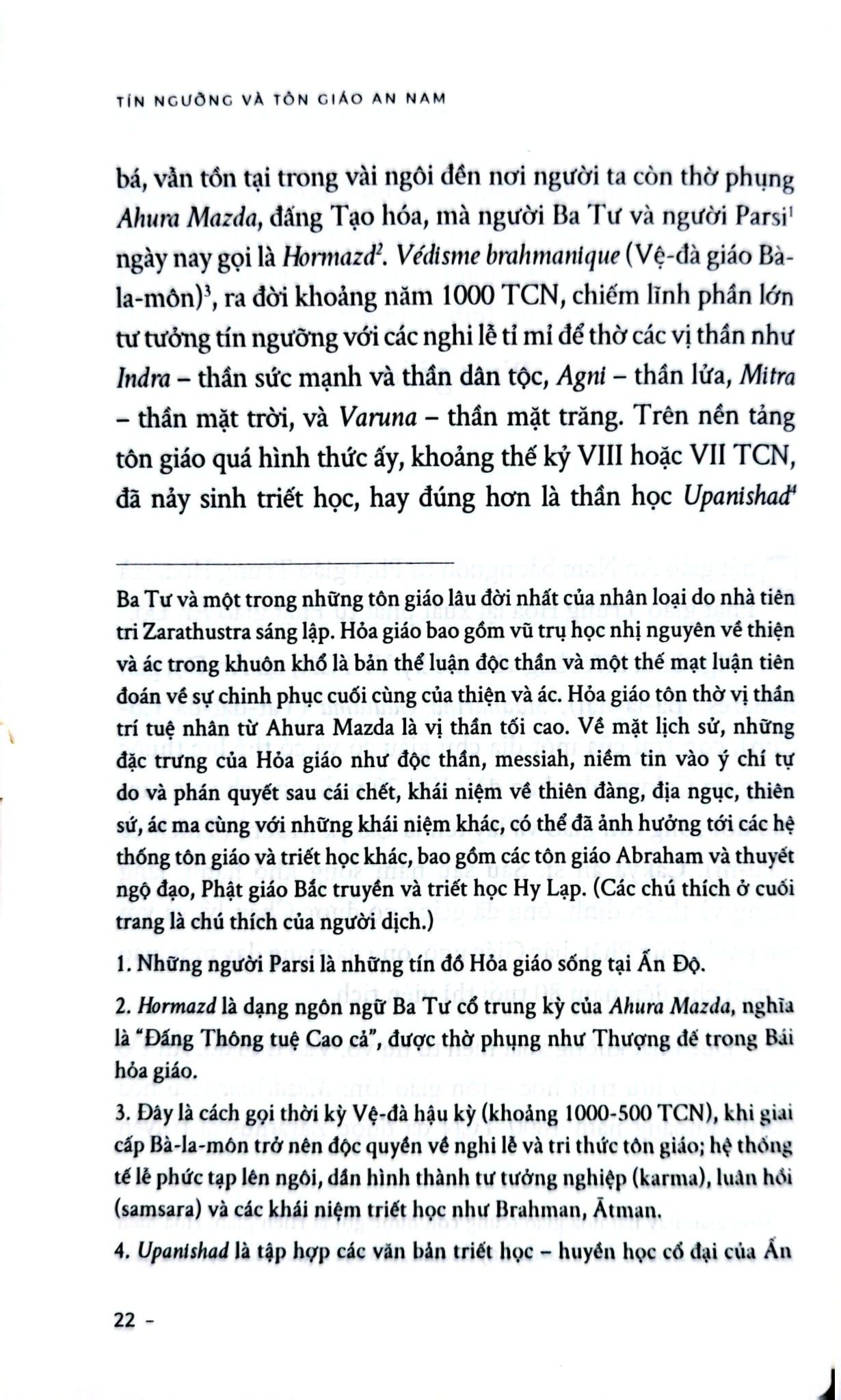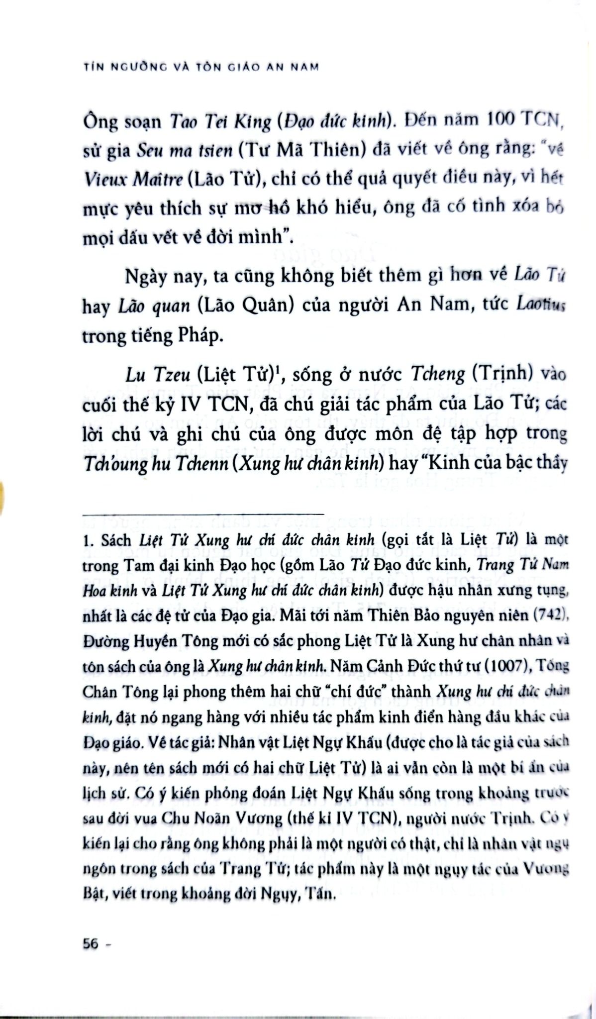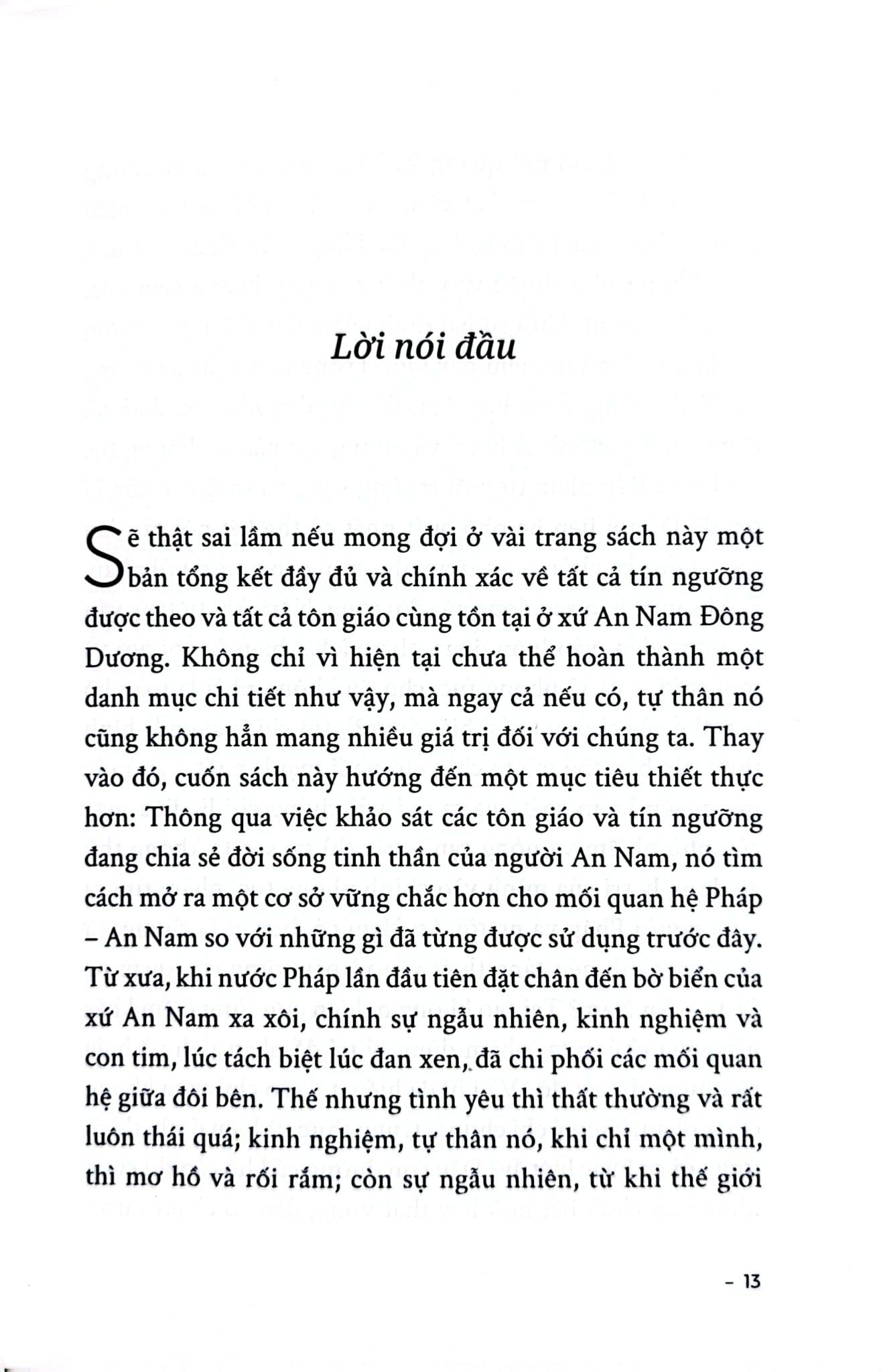 “Trong 20 thế kỷ, họ tiếp nhận bốn học thuyết triết học - tôn giáo: Đức Phật, Lão Tử, Khổng Tử và Chúa Ki-tô. Nếu Ki-tô giáo hoạt động bằng cách chiêu mộ cá nhân và lan tỏa dần dần, thì Phật giáo, Đạo giáo và Khổng giáo lại lan rộng thành từng lớp sóng lớn. Chúng không chồng chất lên nhau. Chúng cũng không hòa trộn để hình thành một tổng hợp mới và đặc thù. Khổng Tử đem đến cho tâm hồn An Nam nền tảng triết học, và học thuyết của ông được tiếp nhận hoàn toàn trong những khía cạnh mà người An Nam biết đến; bản thân Khổng giáo không có siêu hình học, nên nó không loại trừ bất cứ hệ thống tôn giáo giáo điều nào. Vì vậy, bất kỳ tôn giáo nào cũng có thể bổ sung cho nó, và chính cái bổ sung siêu hình ấy, nếu muốn gọi như vậy, là điều mà Phật giáo và Đạo giáo đã cống hiến cho tâm hồn An Nam.”