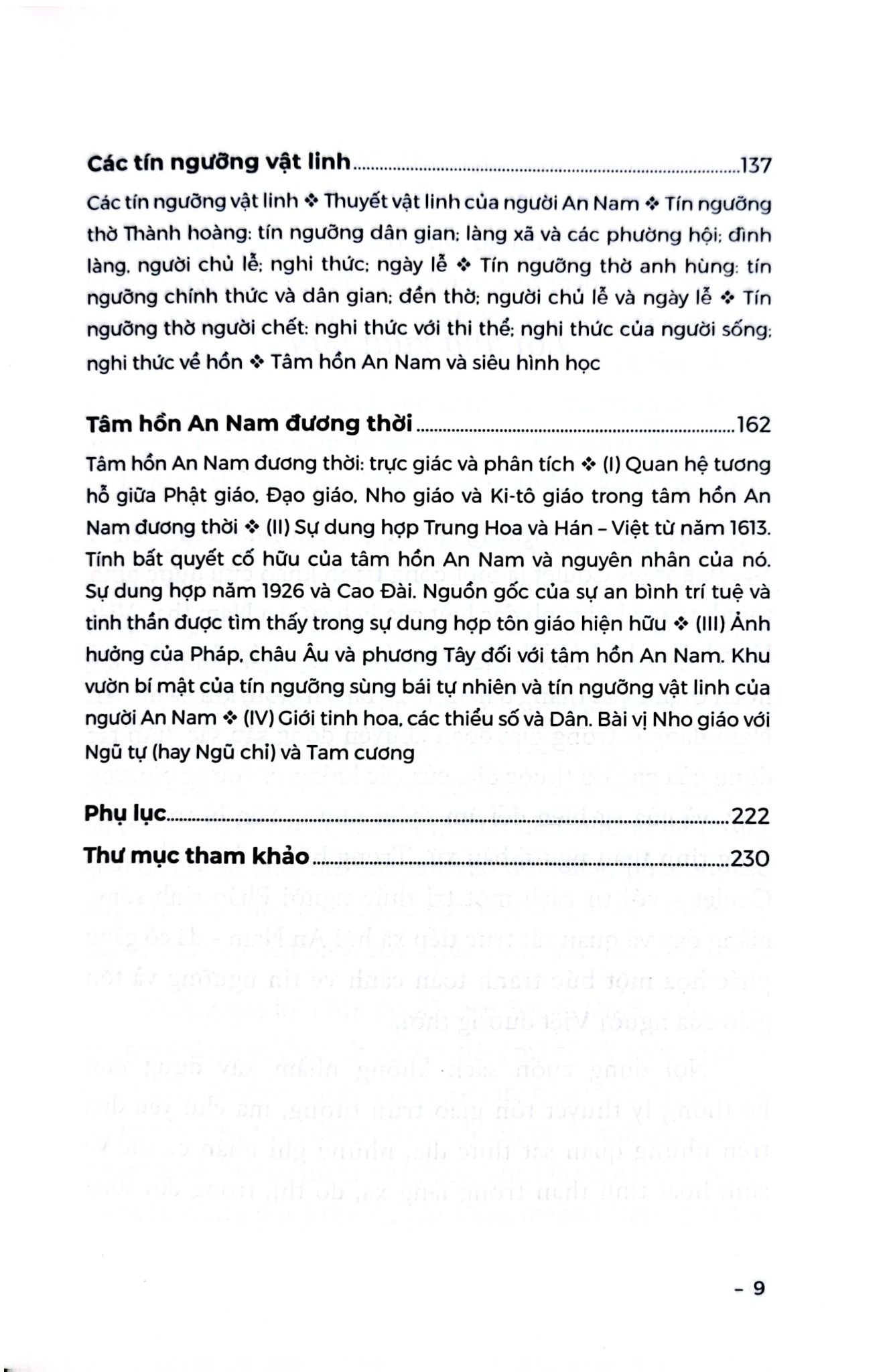 Trong khi lần lượt trình bày vai trò và hình thức tồn tại của các tôn giáo lớn như Phật giáo, Đạo giáo, Nho giáo và Kitô giáo trong xã hội An Nam, Coulet đặc biệt nhấn mạnh đến một lớp nền sâu xa hơn: tín ngưỡng vật linh và tự nhiên giáo. Đây là hệ thống niềm tin gắn bó mật thiết với đời sống nông nghiệp và tâm thức cổ truyền, và theo tác giả, chính lớp nền này đã “An Nam hóa” mọi tôn giáo du nhập. Nhờ đó, các tôn giáo không tồn tại như những hệ thống giáo điều chặt chẽ, mà hòa tan vào đời sống, đáp ứng những nhu cầu tinh thần cụ thể của con người: cầu an, cầu phúc, xua rủi và tìm kiếm sự yên ổn trước những bất trắc của cuộc sống.