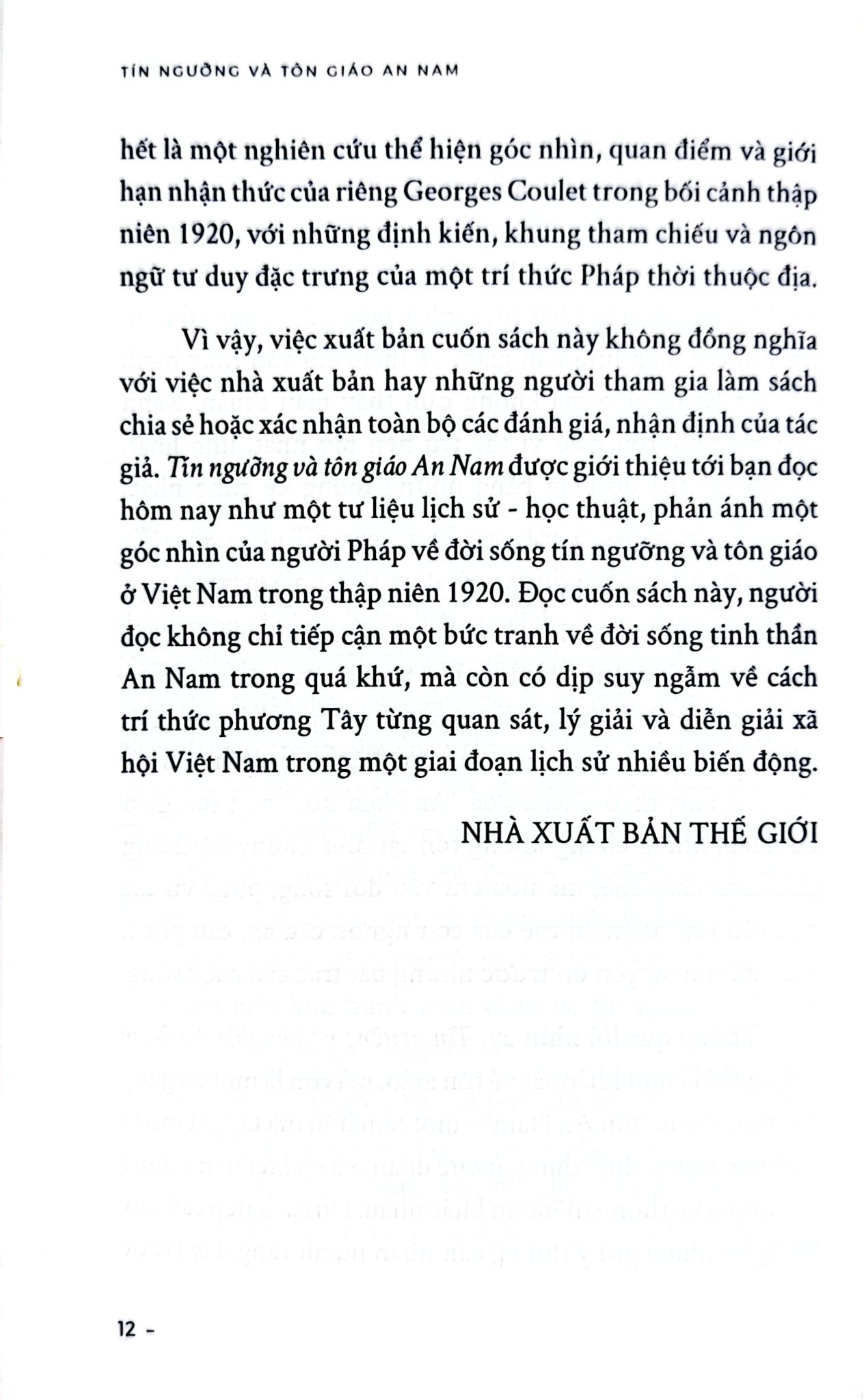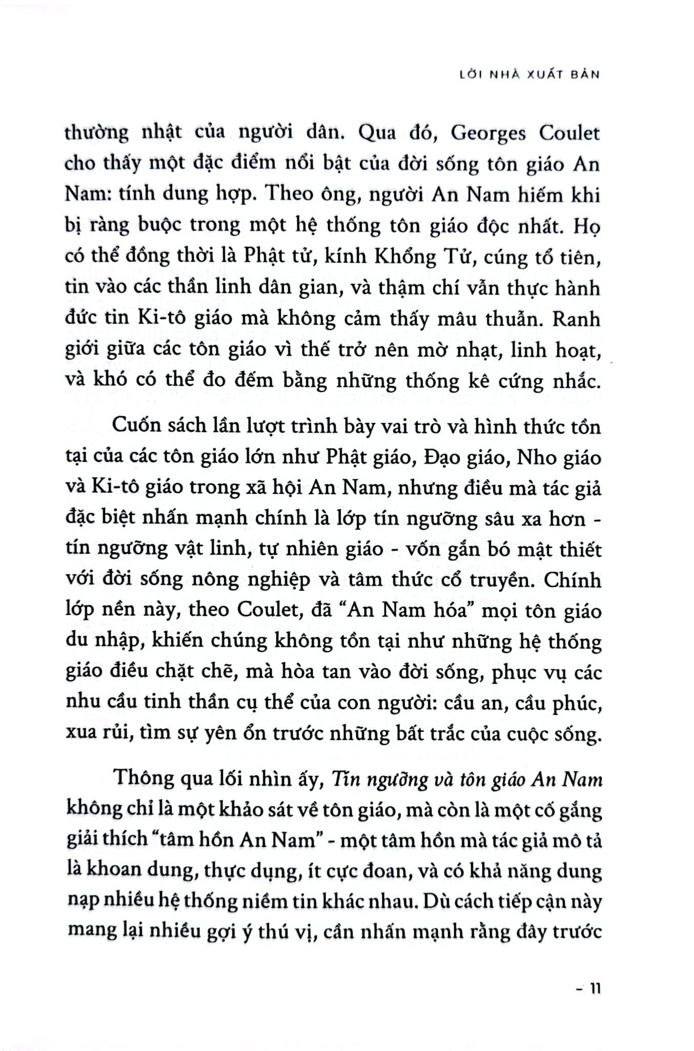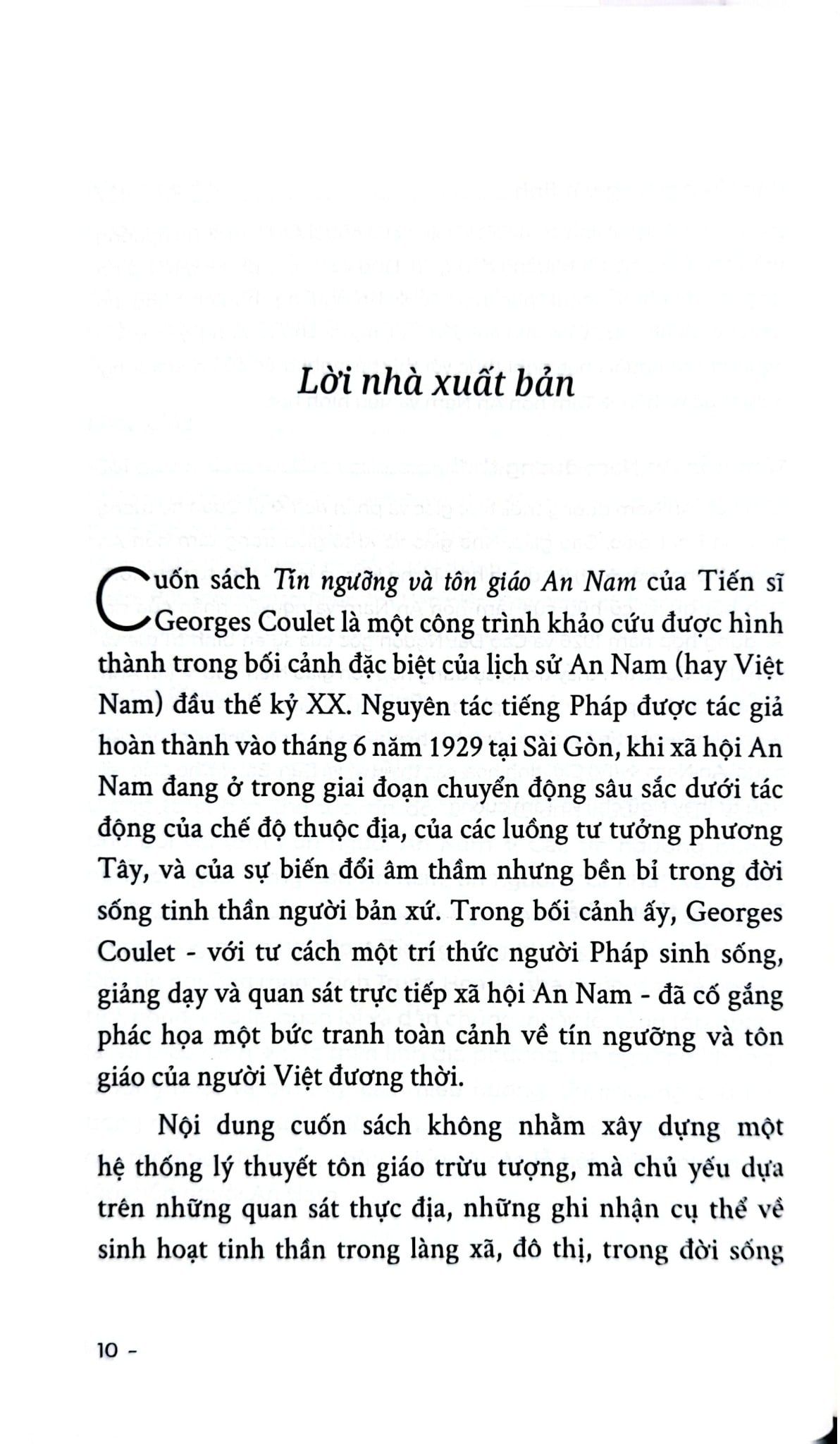 “Tín ngưỡng và tôn giáo An Nam” của Tiến sĩ Georges Coulet là một công trình khảo cứu được hình thành trong bối cảnh đặc biệt của lịch sử An Nam (Việt Nam) đầu thế kỷ XX. Nguyên tác tiếng Pháp được hoàn thành vào tháng 6 năm 1929 tại Sài Gòn, khi xã hội An Nam đang trải qua những chuyển động sâu sắc dưới tác động của chế độ thuộc địa, của các luồng tư tưởng phương Tây, cũng như những biến đổi âm thầm nhưng bền bỉ trong đời sống tinh thần của người bản xứ. Trong hoàn cảnh ấy, Georges Coulet – một trí thức người Pháp sinh sống, giảng dạy và quan sát trực tiếp xã hội An Nam - đã nỗ lực phác họa một bức tranh toàn cảnh về tín ngưỡng và tôn giáo của người Việt đương thời.