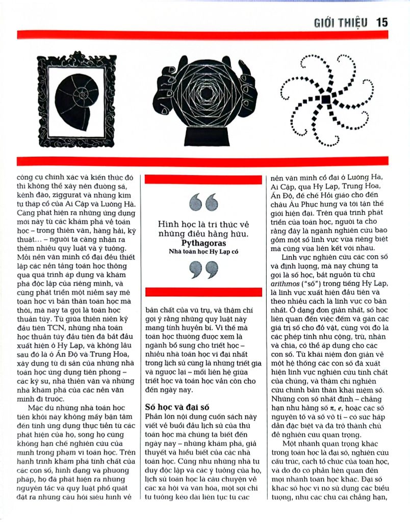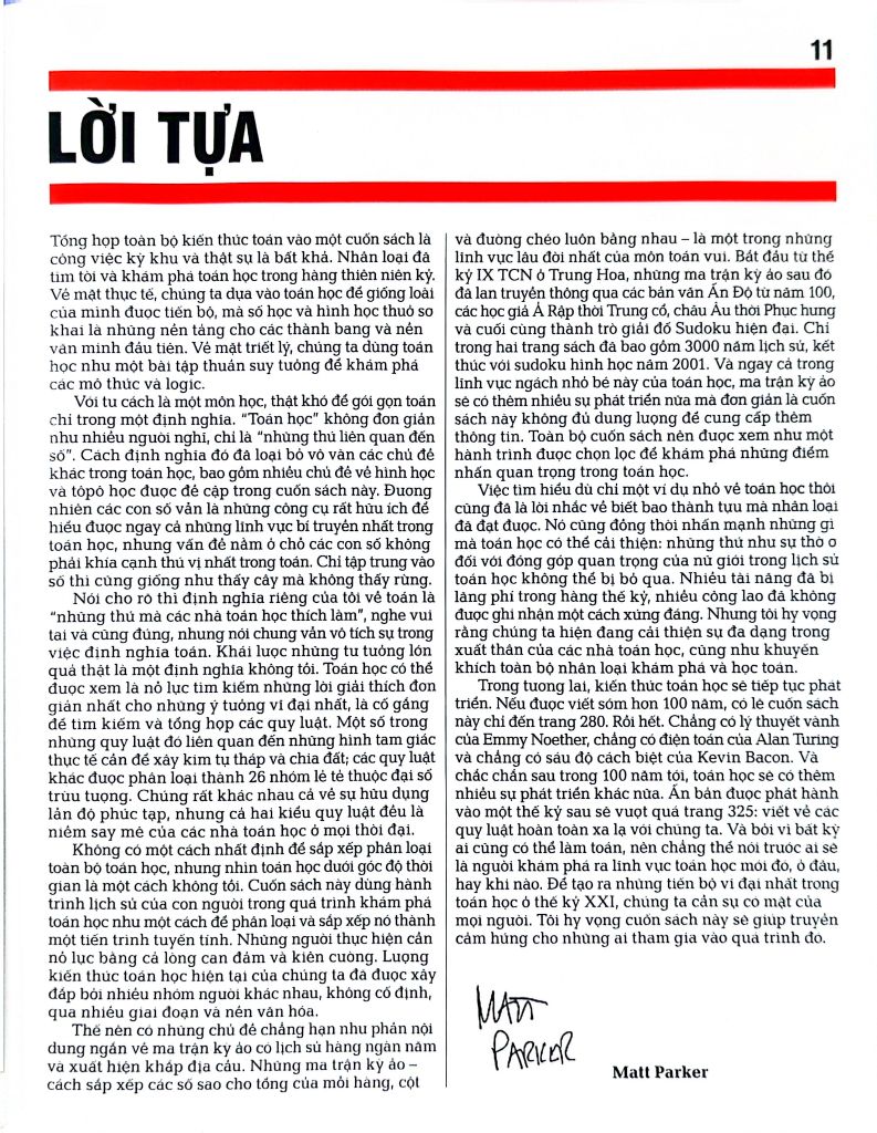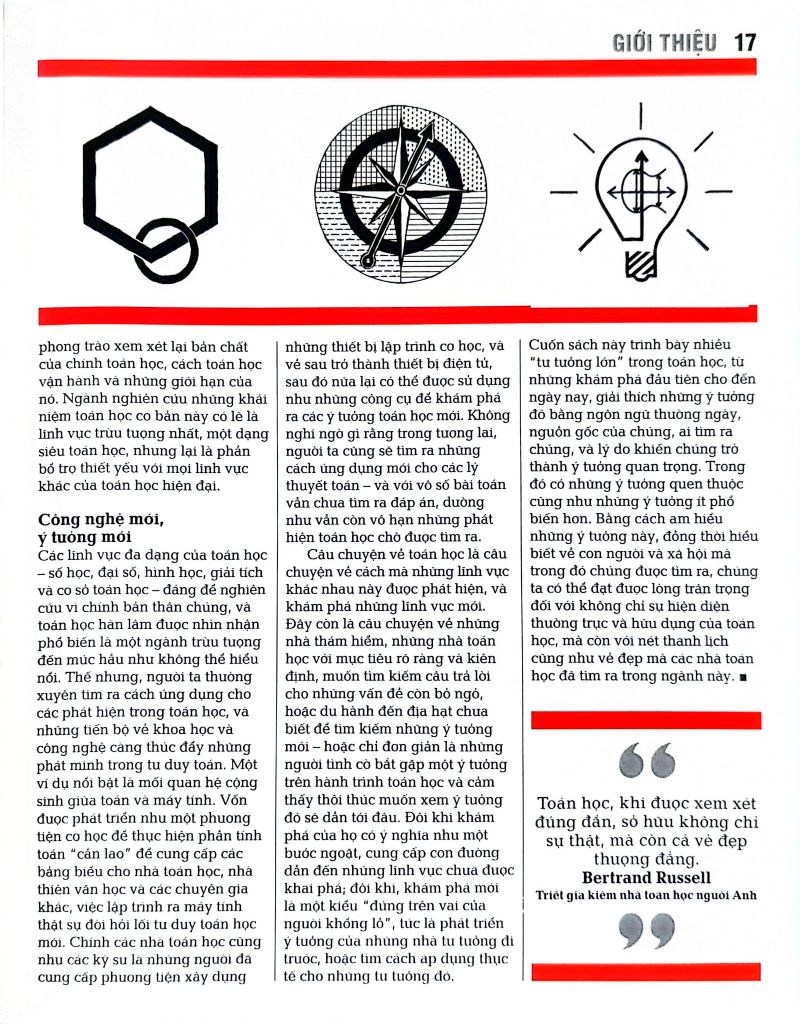 “Cuốn sách này trình bày nhiều “tư tưởng lớn” trong toán học, từ những khám phá đầu tiên cho đến ngày nay, giải thích những ý tưởng đó bằng ngôn ngữ thường ngày, nguồn gốc của chúng, ai tìm ra chúng, và lý do khiến chúng trở thành ý tưởng quan trọng. Trong đó có những ý tưởng quen thuộc cũng như những ý tưởng ít phổ biến hơn. Bằng cách am hiểu những ý tưởng này, đồng thời hiểu biết về con người và xã hội mà trong đó chúng được tìm ra, chúng ta có thể đạt được lòng trân trọng đối với không chỉ sự hiện diện thường trực và hữu dụng của toán học, mà còn với nét thanh lịch cũng như vẻ đẹp mà các nhà toán học đã tìm ra trong ngành này.”